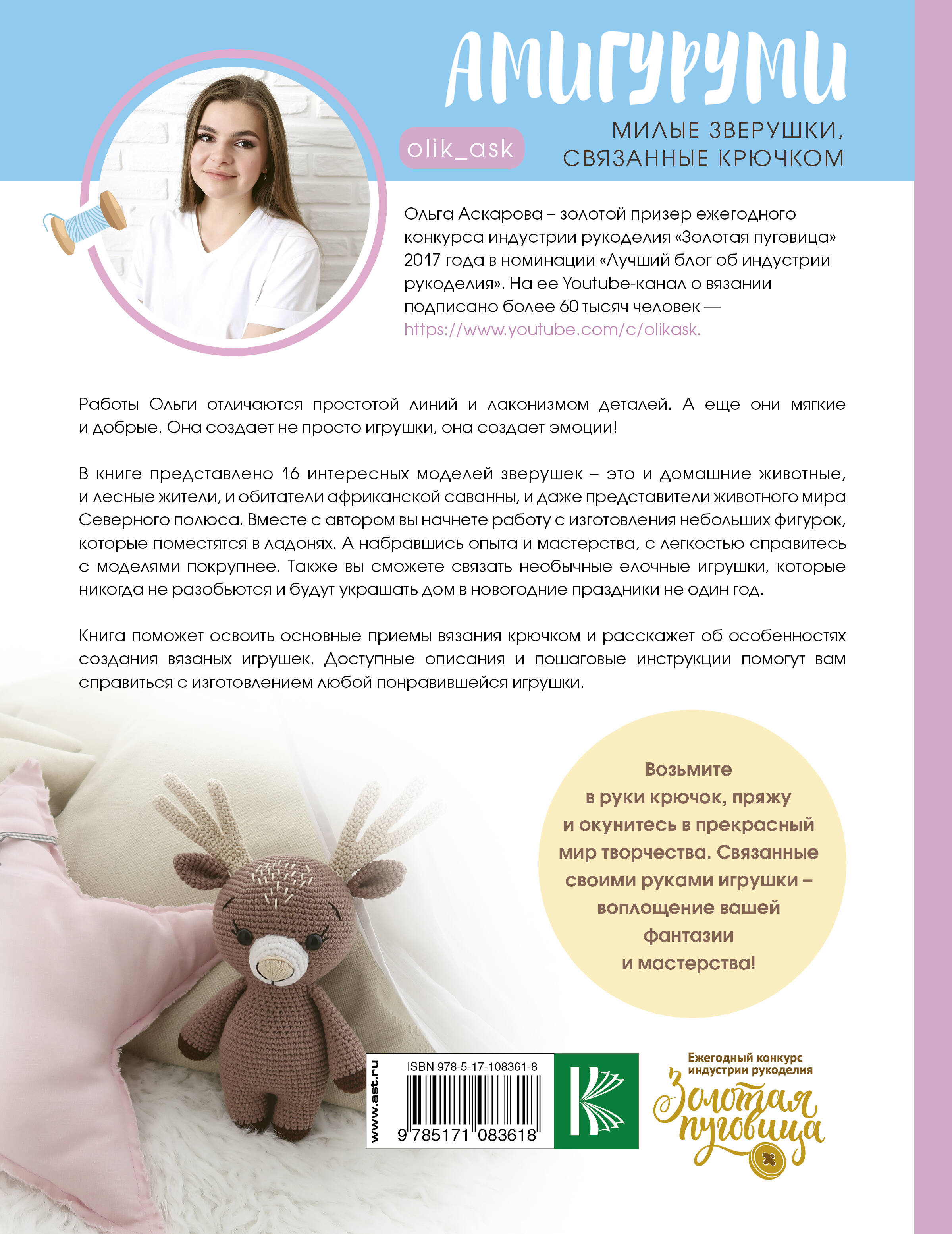 Ольга Аскарова - золотой призер ежегодного конкурса индустрии рукоделия "Золотая пуговица" 2017 в номинации "Лучший блог об индустрии рукоделия". На ее Youtube-канал о вязании подписано более 60 тысяч человек - https://www.youtube.com/c/olikask. Работы Ольги отличаются простотой линий и лаконизмом деталей. А еще они мягкие и добрые. Она создает не просто игрушки, она создает эмоции! В книге представлено 16 интересных моделей зверушек - это и домашние животные, и лесные жители, и обитатели африканской саванны, и даже представители животного мира Северного полюса. Вместе с автором вы начнете работу с изготовления небольших фигурок, которые поместятся в ладонях. А набравшись опыта и мастерства, с легкостью справитесь с моделями покрупнее. Также вы сможете связать необычные елочные игрушки, которые никогда не разобьются и будут украшать дом в новогодние праздники не один год. Книга поможет освоить основные приемы вязания крючком и расскажет об особенностях создания вязаных игрушек. Доступные описания и пошаговые инструкции помогут вам справиться с изготовлением любой понравившейся игрушки. Возьмите в руки крючок, пряжу и войдите в прекрасный мир творчества. Связанные своими руками игрушки - воплощение вашей фантазии и мастерства!