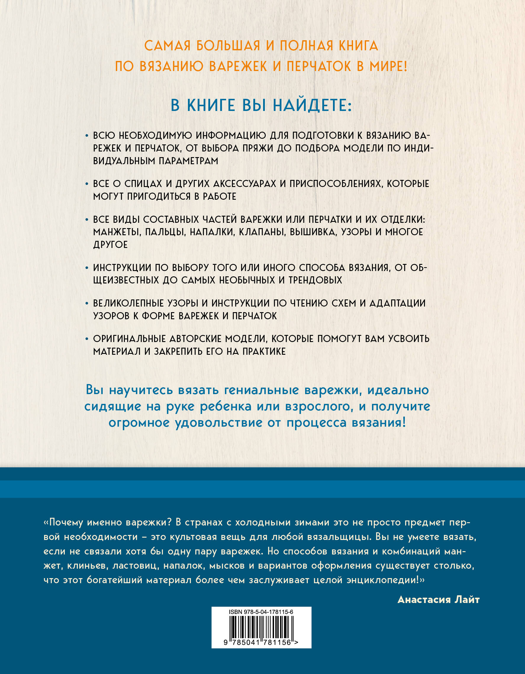 Незаменимый сборник для всех страстных вязальщиц и тех, кто хочет ими стать, от замечательного российского мастера, блогера и автора бестселлера «Норвежские мотивы. Разрезной жаккард» Анастасии Лайт! Самая большая в мире книга, посвященная вязанию варежек и перчаток, решает все вопросы и дает все ответы, которые только могут возникнуть в процессе вязания! Больше двух миллионов комбинаций манжет, клиньев, ластовиц, напалок, мысков и вариантов оформления - это настоящий конструктор и домашняя мастерская в роскошном подарочном оформлении! В книге вы найдете: - всю необходимую информацию для подготовки к вязанию варежек и перчаток, от выбора пряжи до подбора модели по индивидуальным параметрам; - все о спицах и других аксессуарах и приспособлениях, которые могут пригодиться в работе; - все виды составных частей варежки или перчатки и их отделки: манжеты, пальцы, напалки, клапаны, вышивка, узоры и многое другое; - инструкции по выбору того или иного способа вязания, от общеизвестных до самых необычных и трендовых; - великолепные узоры и инструкции по чтению схем и адаптации узоров к форме варежек и перчаток; - оригинальные авторские модели, которые помогут вам усвоить материал и закрепить его на практике. Ваши зимы теперь всегда будут теплыми и красивыми!| Издательство | ООО "Издательство "Эксмо" |
