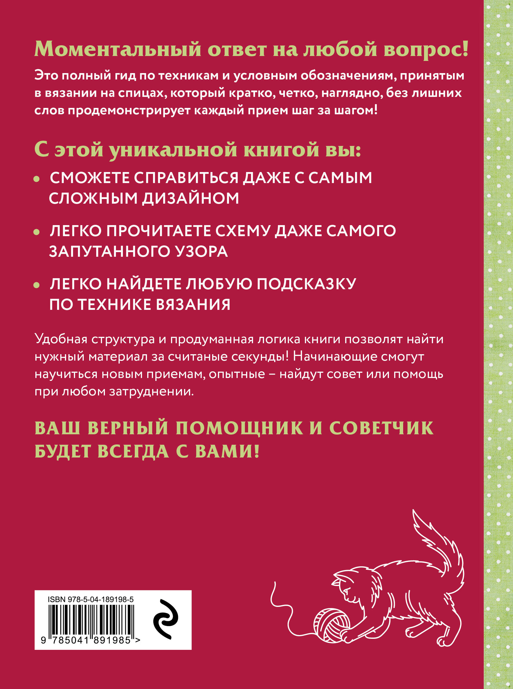 Верный помощник и советчик: уникальный мини-гид по чтению вязальных схем и технологии вязания! С этим удивительным гидом вы разгадаете все тайны условных обозначений и их сочетаний, встречающихся в книгах с узорами. Кратко, четко, наглядно! Каждый шаг представлен логично и последовательно, а сопровождающие иллюстрации помогут вам мастерски выполнять каждый прием. Теперь даже самые сложные схемы будут доступны для расшифровки, и вы сможете с легкостью воплотить в жизнь даже самые запутанные узоры, создавая настоящие шедевры вязального искусства! С этой уникальной книгой: • Вы сможете справиться даже с самым сложным дизайном. • Прочитаете любую схему, даже самого запутанного узора. • Легко найдете любую подсказку по технике вязания. Не имеет значения, только начинаете ли вы свой путь в вязании на спицах или уже являетесь опытным мастером - этот гид будет полезен каждому. Он не только идеально подходит для обучения вязанию, но и служит надежным справочником, готовым ответить на самые сложные вопросы. Полезный мини-гид, который займет почетное место на вашем рабочем столе. Это не просто книга - это ключ к миру вязания на спицах, который будет у вас под рукой, готовый подсказать и вдохновить вас в любой момент!| Издательство | ООО "Издательство "Эксмо" |