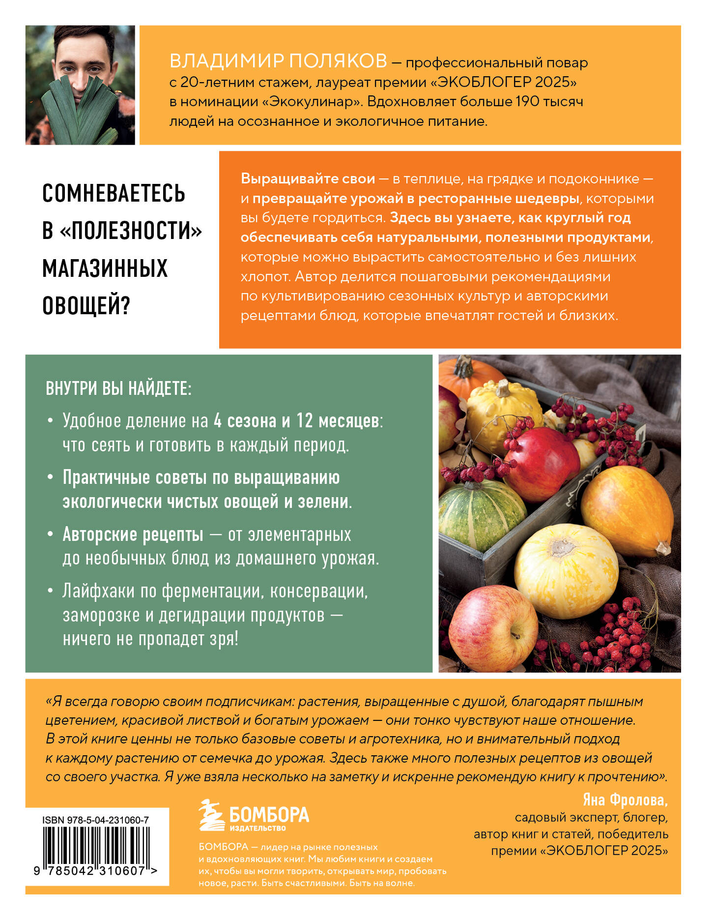 Сомневаетесь, насколько полезны овощи с прилавка? С этой книгой вы сможете вырастить свои - на грядке, в теплице или прямо на подоконнике - и научитесь готовить блюда как в ресторане, которые удивят гостей и близких. Автор - Владимир Поляков, профессиональный повар с более чем 20-летним опытом, лауреат премии «Экоблогер года 2025» в номинации «Экокулинар» и вдохновитель более 190 000 подписчиков, делится своими проверенными методами и идеями. Вы получите пошаговые рекомендации по выращиванию сезонных культур, узнаете, как без труда адаптировать дачные практики к городским условиям и готовить не только полезно, но и вкусно из собственных овощей и зелени. Внутри вас ждет: • Деление на сезоны и месяцы - что сеять и что готовить в каждый период. • Практичные советы и секреты от автора по уходу за растениями и сбору урожая. • Авторские рецепты - от элементарных до необычных блюд из свежих домашних продуктов. • Лайфхаки по ферментации, заморозке, консервации и сушке, чтобы ничего не пропадало зря. «Очень душевная и эмоциональная биографическая книга с авторскими рецептами, которые я могу повторить дома. Но еще более ценным для меня было найти в книге практическое руководство по огороду на подоконнике. Читая книгу, я как будто проживала все волнения, успехи и радости вместе с автором и приняла его опыт. Получается, круглый год можно выращивать зелень, овощи и ягоды и готовить из них для своей семьи». - Мария Кушнир, соавтор книги «Секреты комнатных джунглей», фитодизайнер и озеленитель, блогер «Своим подписчикам и читателям я всегда говорю - растения, выращенные с душой, всегда благодарят пышным цветением, красивой листвой или богатым урожаем, растения как люди - чувствуют нашу душу и отношение к ним. В этой книге ценны не только базовые советы и агротехника выращивания овощных культур, а также душевный подход к выращиванию каждого растения от семечка до сбора урожая. Также в книге множество очень нужных и полезных рецептов из овощей, выращенных на своем участке. Для себя взяла уже несколько рецептов на заметку и однозначно рекомендую книгу к прочтению». - Яна Фролова, садовый эксперт, блогер, автор книг и статей, победитель премии «ЭКОБЛОГЕР 2025»