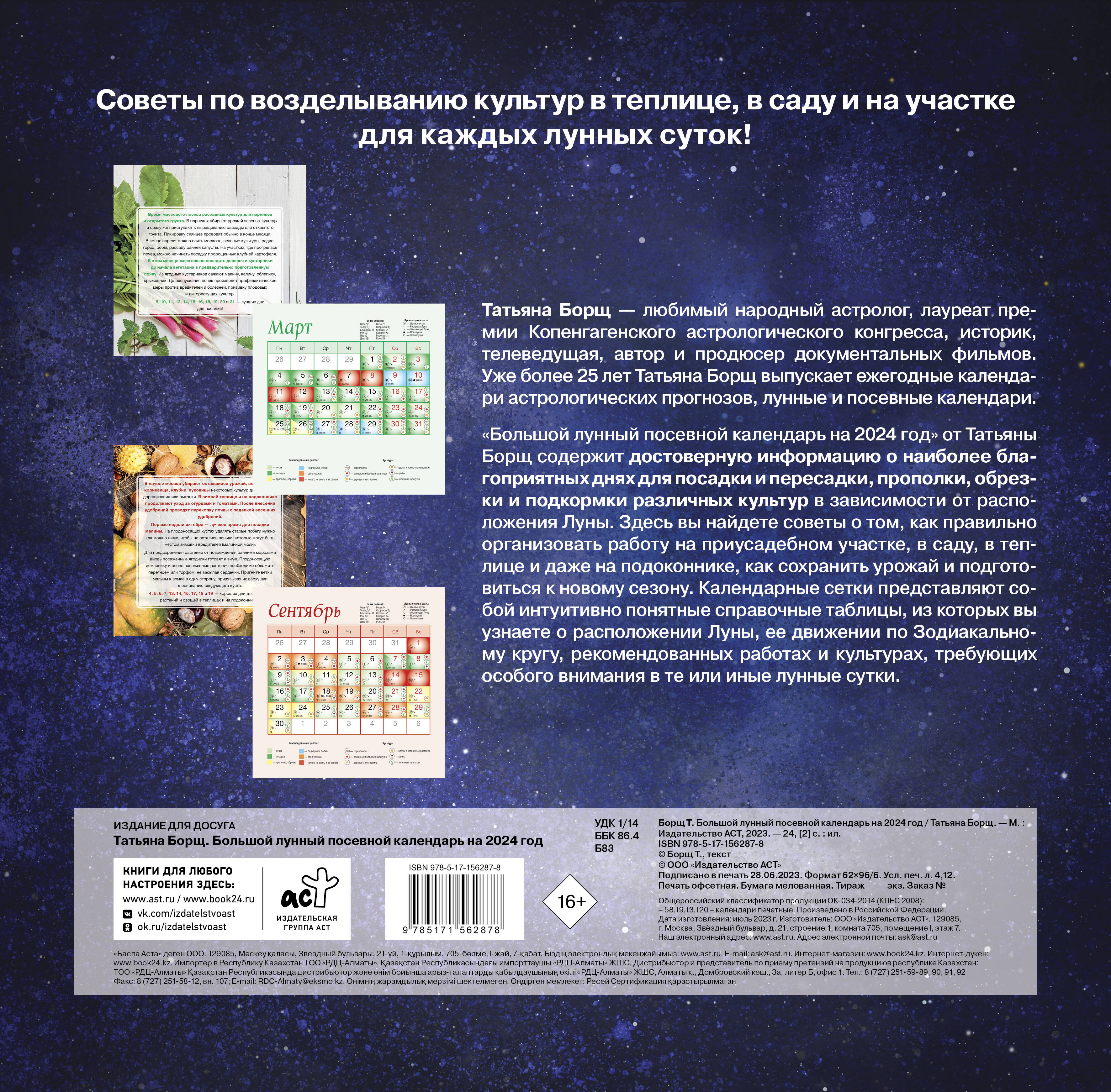 Татьяна Борщ - любимый народный астролог, лауреат премии Копенгагенского астрологического конгресса, историк, телеведущая, автор и продюсер документальных фильмов. Уже более 25 лет Татьяна Борщ выпускает ежегодные календари астрологических прогнозов, лунные и посевные календари. "Большой лунный посевной календарь на 2024 год" от Татьяны Борщ содержит достоверную информацию о наиболее благоприятных днях для посадки и пересадки, прополки, обрезки и подкормки различных культур в зависимости от расположения Луны. Здесь вы найдете советы о том, как правильно организовать работу на приусадебном участке, в саду, в теплице и даже на подоконнике, как сохранить урожай и подготовиться к новому сезону. Календарные сетки представляют собой интуитивно понятные справочные таблицы, из которых вы узнаете о расположении Луны, ее движении по зодиакальному кругу, рекомендованных работах и культурах, требующих особого внимания в те или иные лунные сутки.