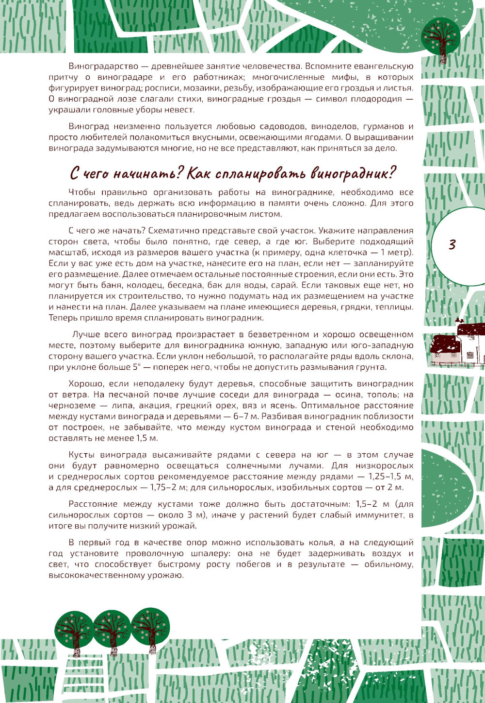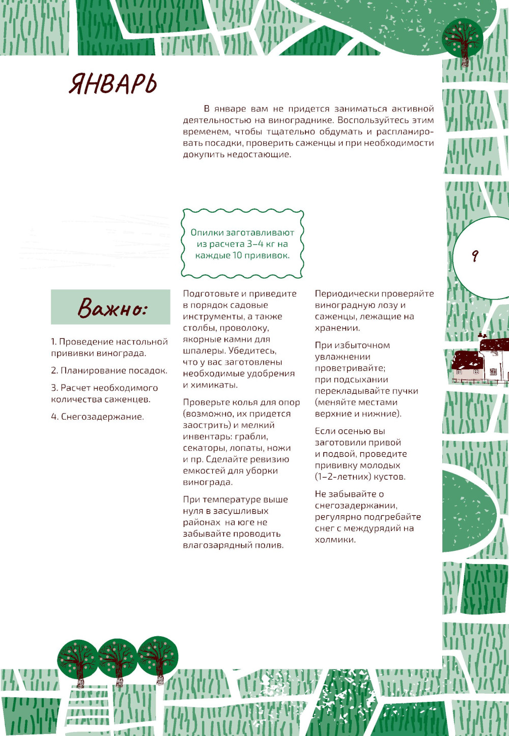 Дневник-помощник создан для планирования ваших работ на винограднике. Удобная форма издания даст возможность правильно организовать посадку винограда, контролировать и систематизировать уход за ним. Имея перед глазами общие рекомендации мероприятий в каждом месяце по разным направлениям ухода: подкормкам, обрезкам, борьбе с вредителями и профилактике заболеваний, - легко будет составить собственный календарь со списком дел на каждый день.