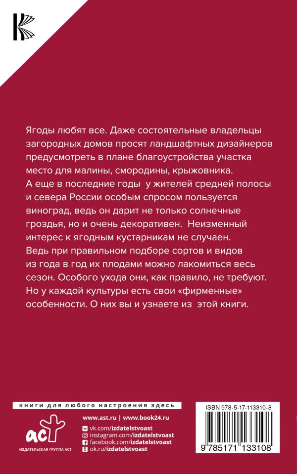 Ягоды любят все. Даже состоятельные владельцы загородных домов просят ландшафтных дизайнеров просят предусмотреть в плане благоустройства участка место для малины, смородины, крыжовника. А еще в последние годы у жителей средней полосы и севера России особым спросом пользуется виноград, ведь он дарит не только солнечные гроздья, но и очень декоративен. Неизменный интерес к ягодным кустарникам не случаен. Ведь при правильном подборе сортов и видов из года в год их плодами можно лакомиться весь сезон. Особого ухода они, как правило, не требуют. Но у каждой культуры есть свои "фирменные" особенности. О них вы и узнаете из этой книги.