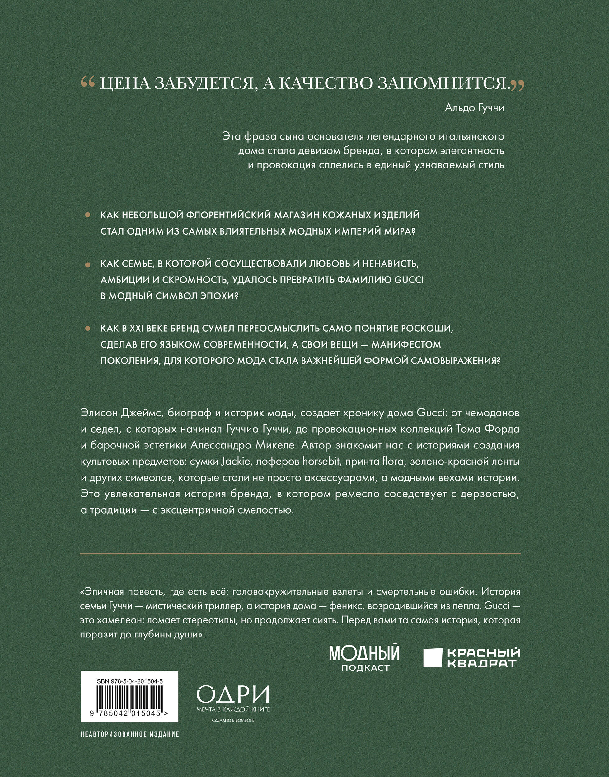 Дом Gucci - модная династия, история которой полна тайн и страстей: от семейных войн и кризиса репутации до триумфального возвращения с провокационным Томом Фордом и дерзкой эстетикой Алессандро Микеле. Каждая эпоха Gucci отражала дух своего времени - кинематографическую «сладкую жизнь» 1960-х, скандалы 1980-х, сексуальную революцию 1990-х и барочную эклектику начала XXI века. Эта книга - портрет легендарной империи, пережившей кризисы и трагедии, но неизменно превращавшей свои творения в символы эпохи и мечты целого поколения. Как небольшой флорентийский магазин кожаных изделий стал одним из самых влиятельных модных империй мира? Как семье - в которой переплетались любовь и ненависть, амбиции и скромность - удалось превратить фамилию Gucci в модный символ эпохи? Как в XXI веке бренд сумел превратить роскошь в язык современности, а свои вещи - в манифест поколения, для которого мода стала важнейшей формой самовыражения? Алисон Джеймс, биограф и историк моды, рисует увлекательную хронику дома Gucci: от чемоданов и седел, с которых начинал Гуччио Гуччи, до провокационных открытий Тома Форда и барочной эстетики Алессандро Микеле. Это история бренда, в котором ремесло соседствует с дерзостью, а традиция - с эксцентричной смелостью. В этой книге: • ранее не публиковавшиеся подробности истории семьи Гуччи; • драма, успехи и внутренние конфликты, изменившие лицо модной индустрии; • уникальные материалы о создании культовых вещей: сумки Jackie, лоферов с пряжкой, принтов Flora, зелено-красной ленты и других знаковых элементов; • редкие фотографии, архивные документы, эскизы и рекламные кампании - визуальная история одного из самых дерзких домов моды. Нас ищут: история моды, мода ХХ века, легендарные бренды, семейные саги, fashion, культовые дома моды, биография, мода и стиль, Gucci, дом Gucci, Том Форд, Алессандро Микеле, Jackie, лоферы, Flora, подарочная книга, table book, Chanel, Dior, Hermes| Издательство | ООО "Издательство "Эксмо" |