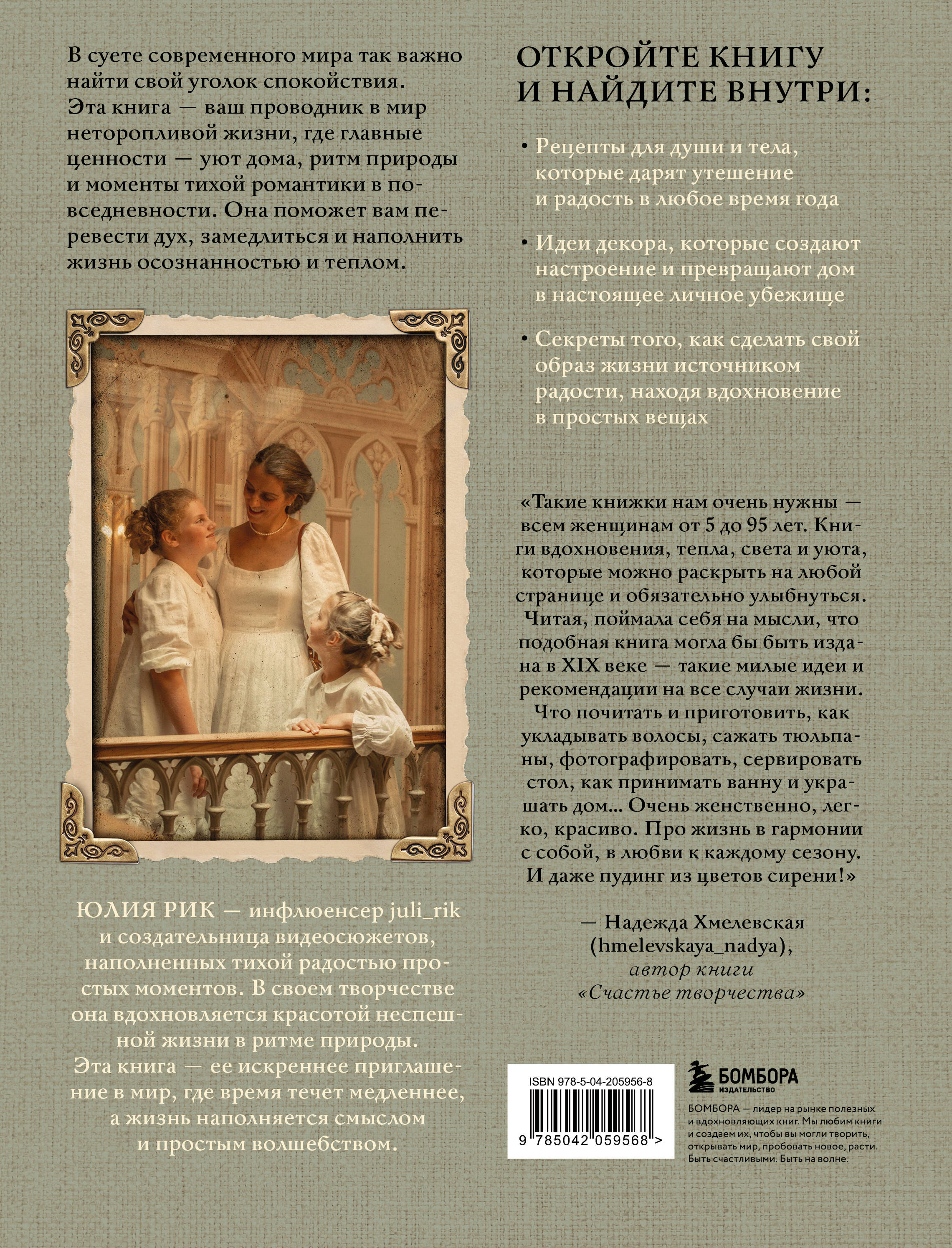 Дорогой читатель! Меня зовут Юлия Рик, и я приглашаю тебя в удивительный мир медленной жизни, вдохновения и радости творчества. Эта книга родилась из моей глубокой веры в то, что настоящее счастье прячется не в гонке за успехом, а в умении замедлиться, выдохнуть и найти красоту в простых моментах: в шуме дождя за окном, в аромате свежеиспеченного хлеба, в тепле домашнего очага. На этих страницах я собрала для тебя не просто советы и рецепты, а целую философию жизни, где главные герои - спокойствие, природа и твой уютный дом. Это мой искренний подарок для всех, кто устал от суеты и мечтает наполнить свои дни осознанностью и тихим волшебством. Открыв эту книгу, ты найдешь: - Рецепты для души и тела, которые согреют и порадуют в любое время года. - Идеи декора, помогающие создать в доме ту самую атмосферу тепла и уюта, в которую хочется возвращаться. - Секреты и подсказки, как превратить рутину в источник радости и сделать свой образ жизни настоящим искусством. Давай вместе учиться чувствовать ритм природы и ценить каждый миг. Я буду рада стать твоим проводником в этом путешествии. С любовью и верой в простые радости, Юлия.