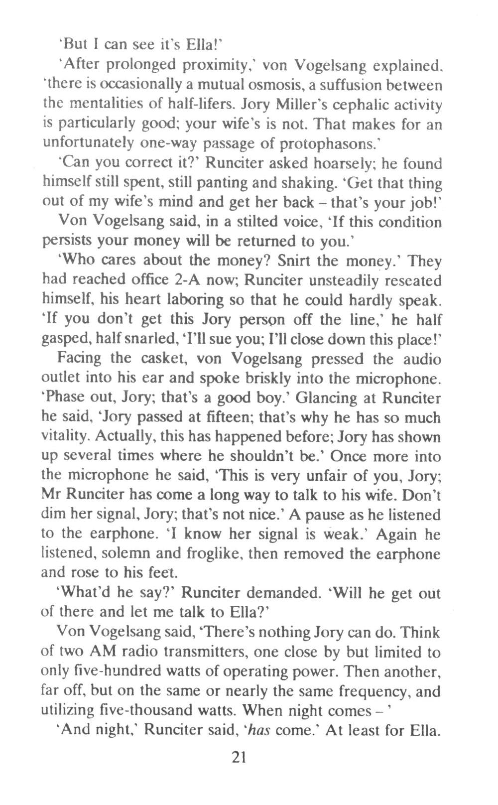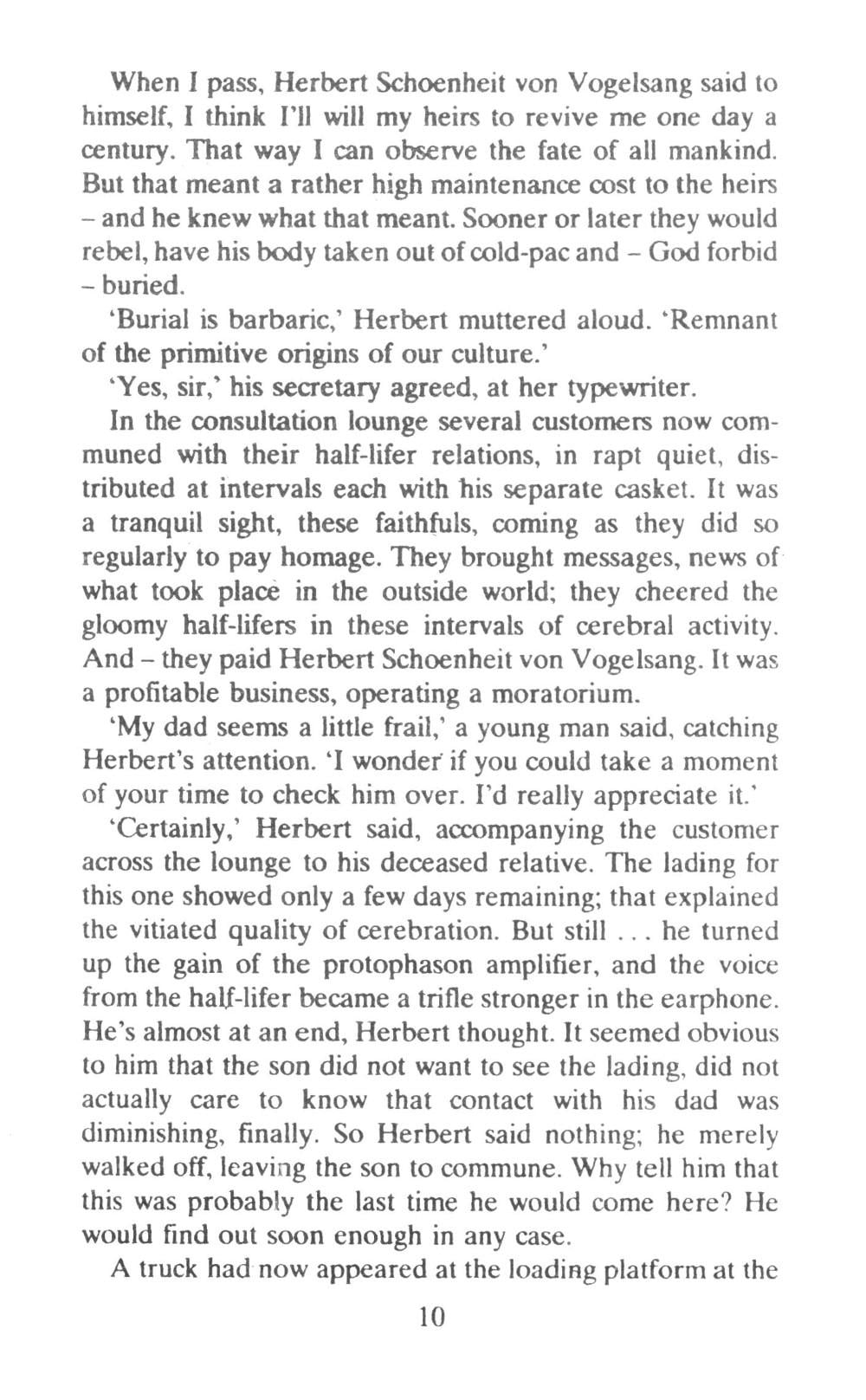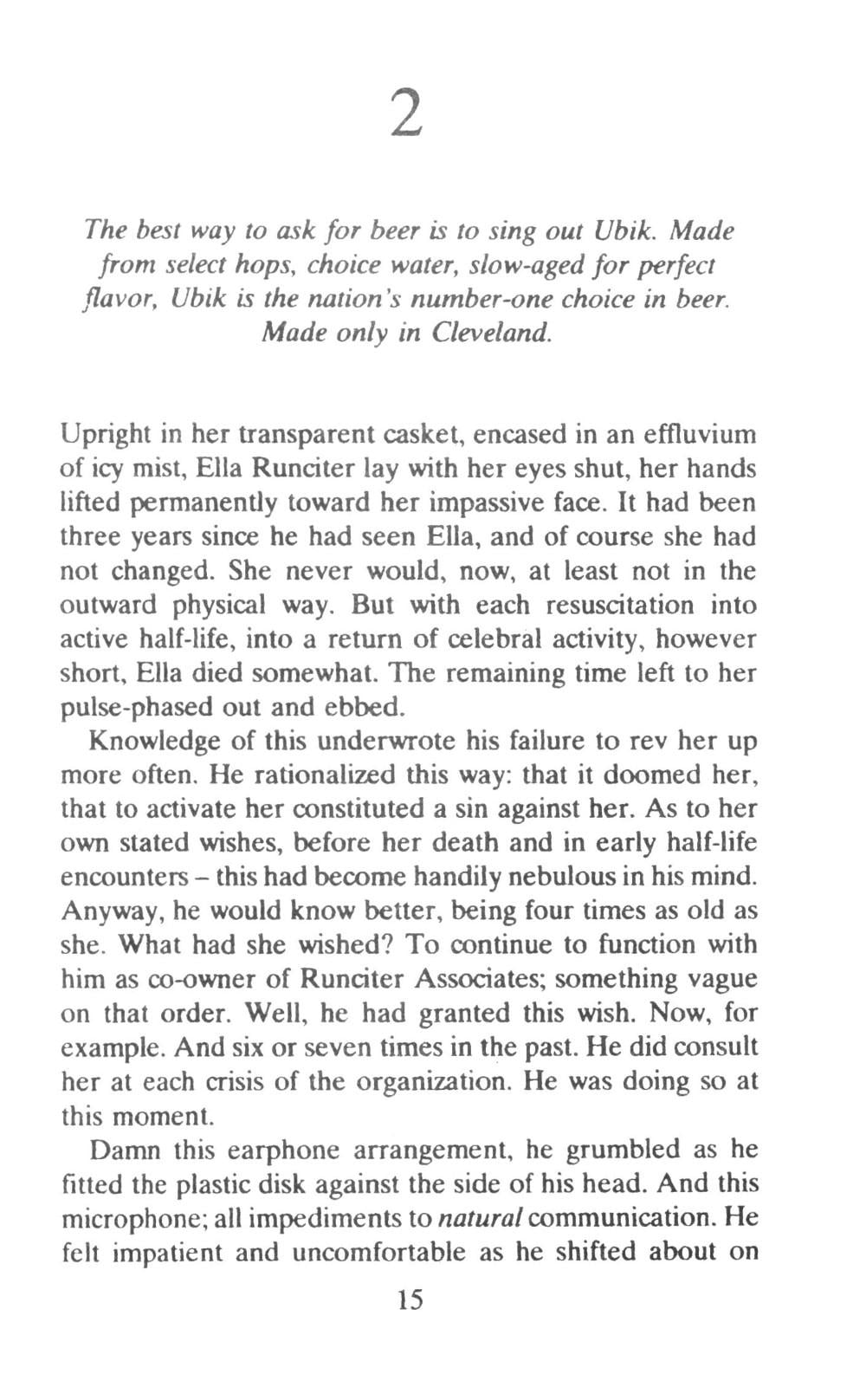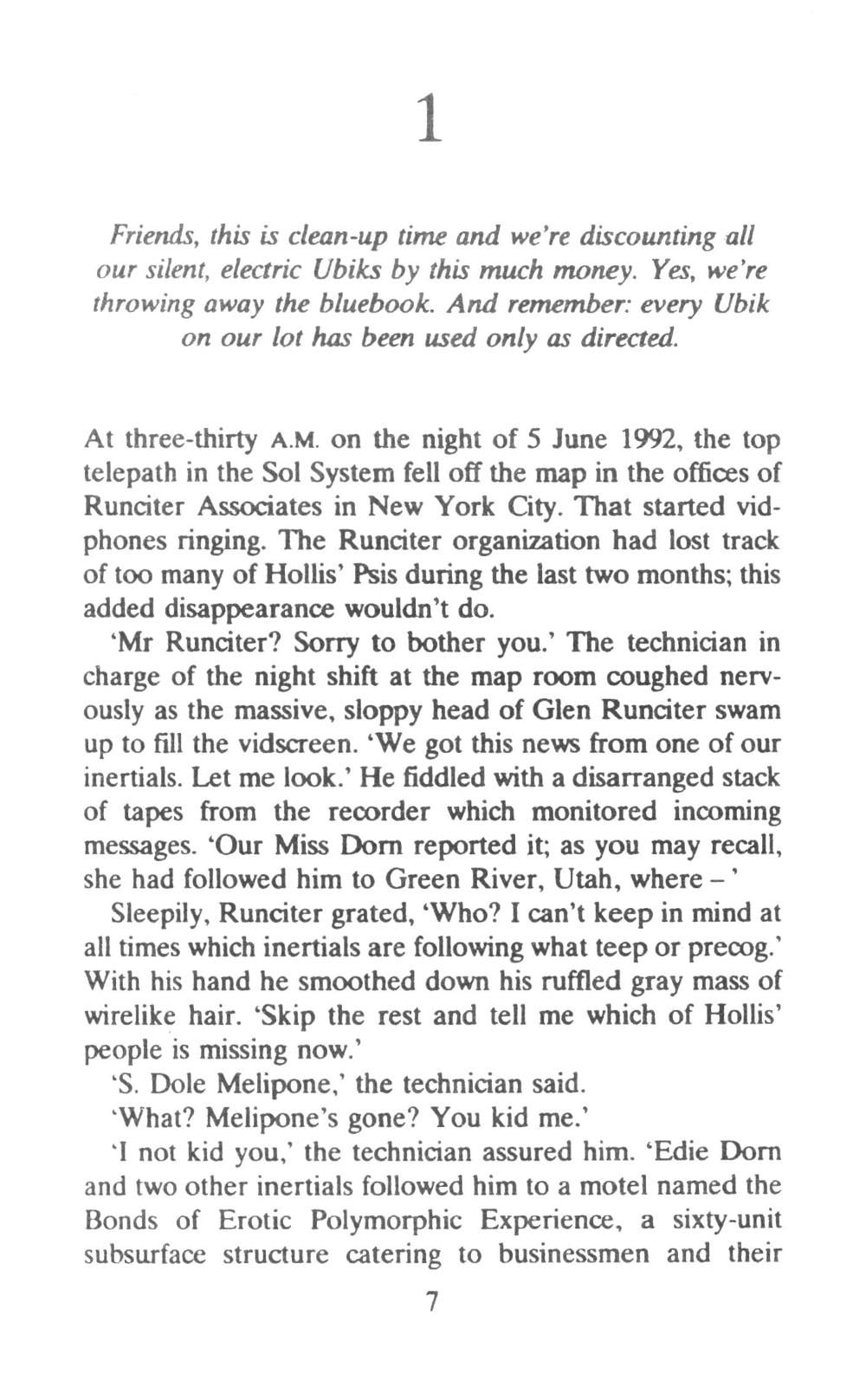 Glen Runciter runs a lucrative business - deploying his teams of anti-psychics to corporate clients who want privacy and security from psychic spies. But when he and his top team are ambushed by a rival, he is gravely injured and placed in «half-life,» a dreamlike state of suspended animation. Soon, though, the surviving members of the team begin experiencing some strange phenomena, such as Runciter's face appearing on coins and the world seeming to move backward in time. As consumables deteriorate and technology gets ever more primitive, the group needs to find out what is causing the shifts and what a mysterious product called Ubik has to do with it all.| Издательство | Orion |