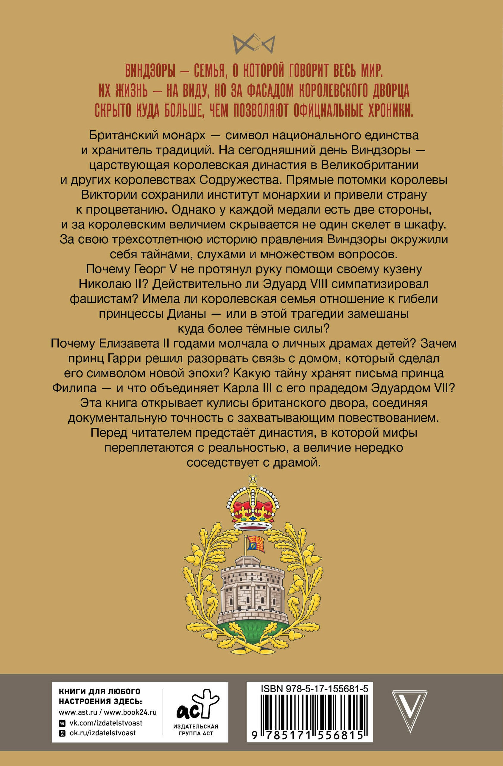 Виндзоры - семья, о которой говорит весь мир. Их жизнь - на виду, но за фасадом королевского дворца скрыто куда больше, чем позволяютофициальные хроники. Британский монарх - символ национального единства и хранитель традиций. На сегодняшний день Виндзоры - царствующая королевская династия в Великобритании и других королевствах Содружества. Прямые потомки королевы Виктории сохранили институт монархии и привели страну к процветанию. Однако у каждой медали есть две стороны, и за королевским величием скрывается не один скелет в шкафу. За свою трехсотлетнюю историю правления Виндзоры окружили себя тайнами, слухами и множеством вопросов. Почему Георг V не протянул руку помощи своему кузену Николаю II? Действительно ли Эдуард VIII симпатизировал фашистам? Имела ли королевская семья отношение к гибели принцессы Дианы - или в этой трагедии замешаны куда более темные силы? Почему Елизавета II годами молчала о личных драмах детей? Зачем принц Гарри решил разорвать связь с домом, который сделал его символом новой эпохи? Какую тайну хранят письма принца Филипа - и что объединяет Карла III с его прадедом Эдуардом VII? Эта книга открывает кулисы британского двора, соединяя документальную точность с захватывающим повествованием. Перед читателем предстаёт династия, в которой мифы переплетаются с реальностью, а величие нередко соседствует с драмой.