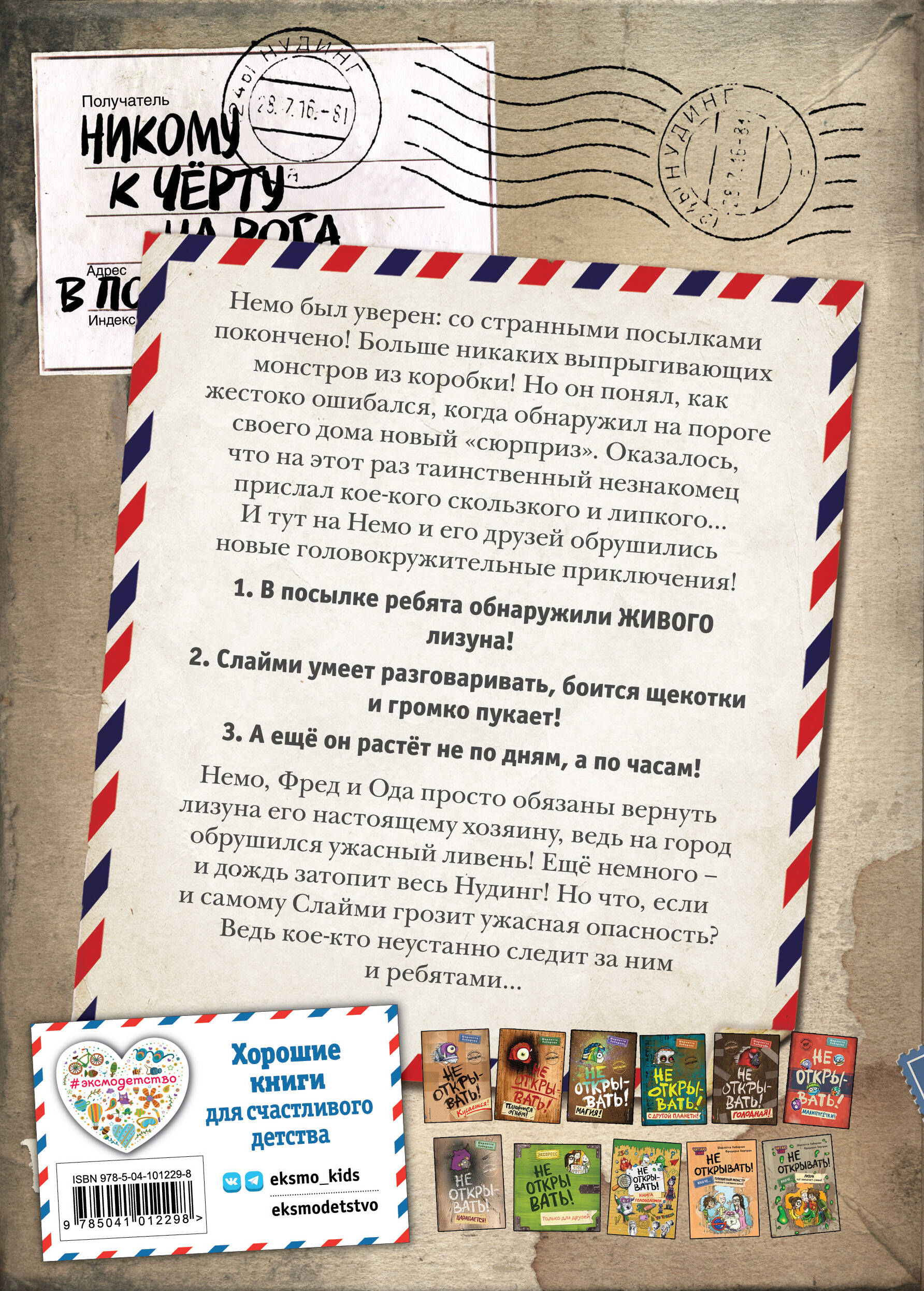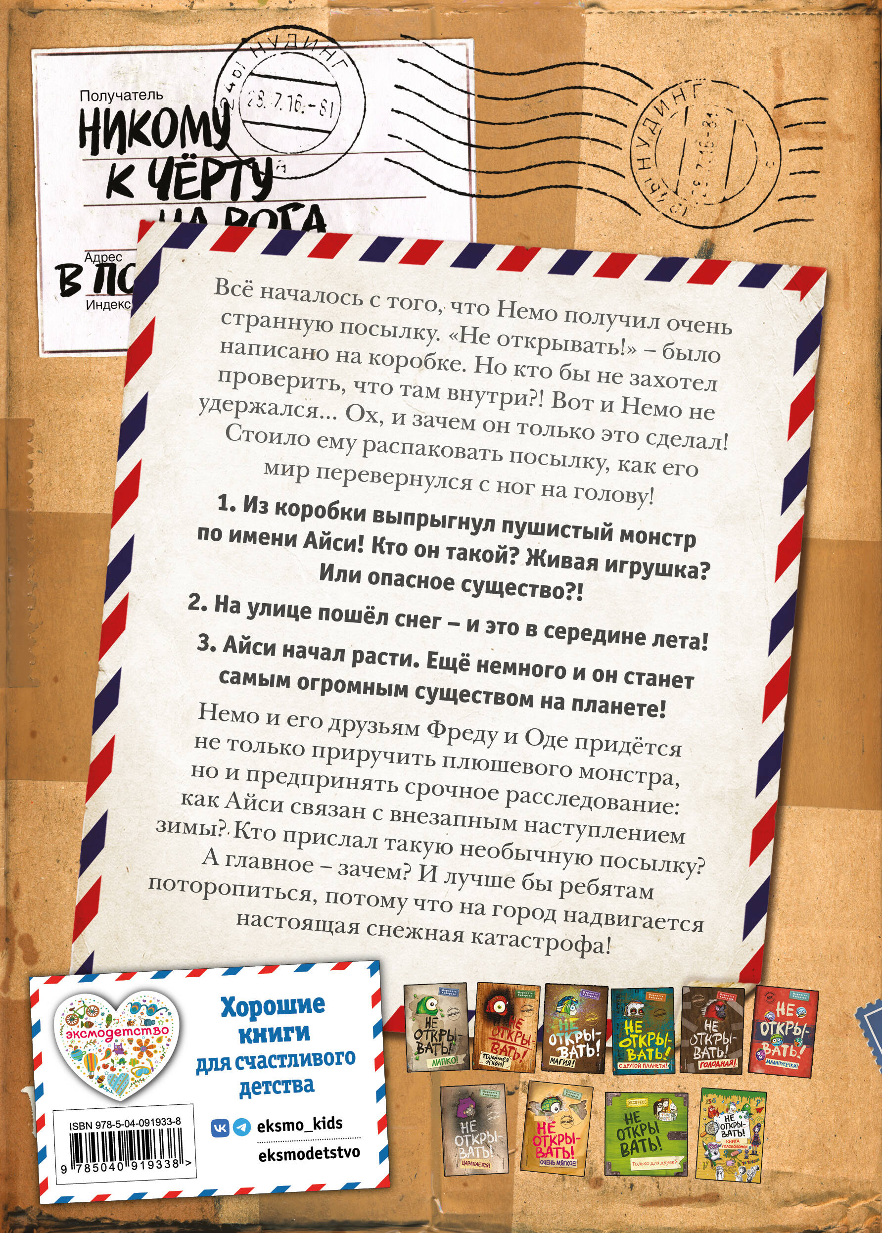 Комплект из 2-х книг. «Не открывать! Кусается» + «Липкко (#1 и 2)» Книги международной серии-бестселлера - только в России продано более 300 000 экземпляров! Увлекательная история с детективным сюжетом и стильными черно-белыми иллюстрациями. Эта книга создана для тех, кто считает, что читать - это скучно. Она не оставит никаких сомнений, что с книгами можно классно проводить время: подтверждено сотнями положительных отзывов родителей! Угораздило же Немо родиться в Нудинге, самом скучном городке на свете! А ведь он всю жизнь мечтал о приключениях - но разве в таком болоте случится что-нибудь интересное?! Однако мальчик и подумать не мог, какие головокружительные перемены его ждут… Все началось с того, что к нему в руки попала странная посылка с надписью «Не открывать!». Конечно же, Немо ни минуты не сомневался - эту коробку надо срочно открыть! И как же он удивился, когда обнаружил внутри плюшевого йети - живого и очень прожорливого! А тем временем на улице пошел снег - прямо в середине лета! Теперь Немо и его друзьям Фреду и Оде нужно выяснить: кто же такой этот йети? Как его приручить? А главное - кто и зачем его прислал? Ребятам придется поторопиться: еще немного - и в городе случится снежная катастрофа! У книги необычное оформление: в обложке есть дырка, сквозь которую выглядывает герой книги! Книги серии лучше читать по порядку. Этот комплект станет отличным подарком для ребенка на любой праздник!| Издательство | ООО "Издательство "Эксмо" |