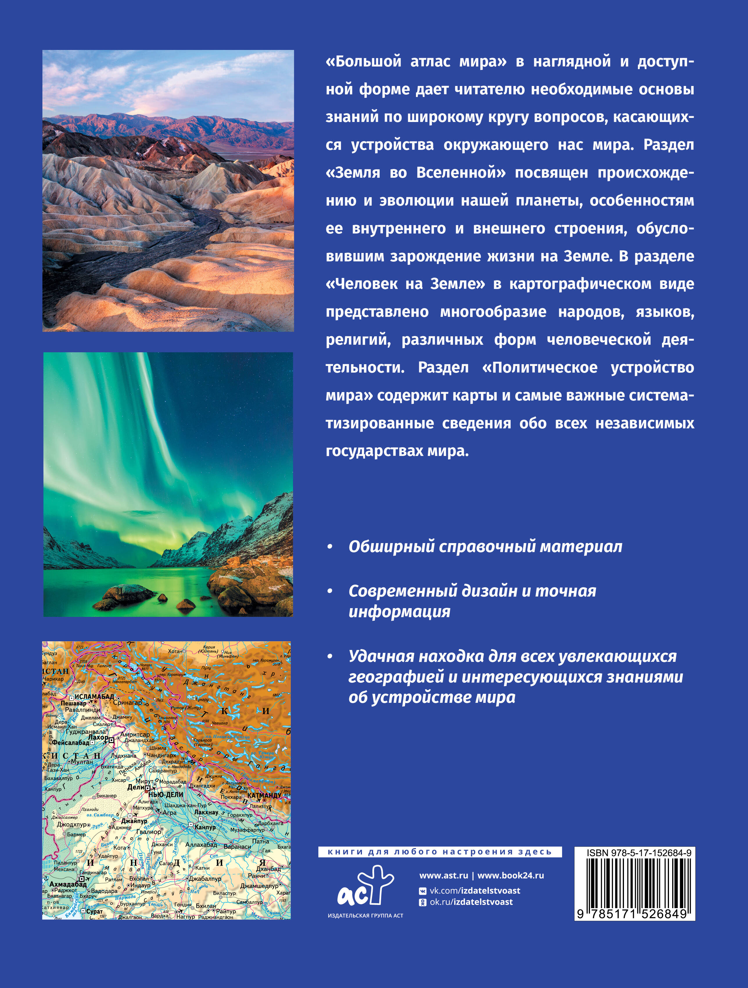 Подарочное издание при этом полезная книга - атлас в наглядной и доступной форме дает читателю необходимые основы знаний по широкому кругу вопросов, касающихся устройства окружающего нас мира. Раздел «Земля во Вселенной» посвящён происхождению и эволюции нашей планеты, особенностям ее внутреннего и внешнего строения, обусловившим зарождение жизни на Земле. В разделе «Человек на Земле» в картографическом виде представлено многообразие народов, языков, религий, различных форм человеческой деятельности. Раздел «Политическое устройство мира» содержит обновлённые карты, а также самые важные систематизированные сведения обо всех независимых государствах мира. Атлас предназначен как для школьников, так и для всех, интересующихся устройством современного мира.| Издательство | Издательство "АСТ" |