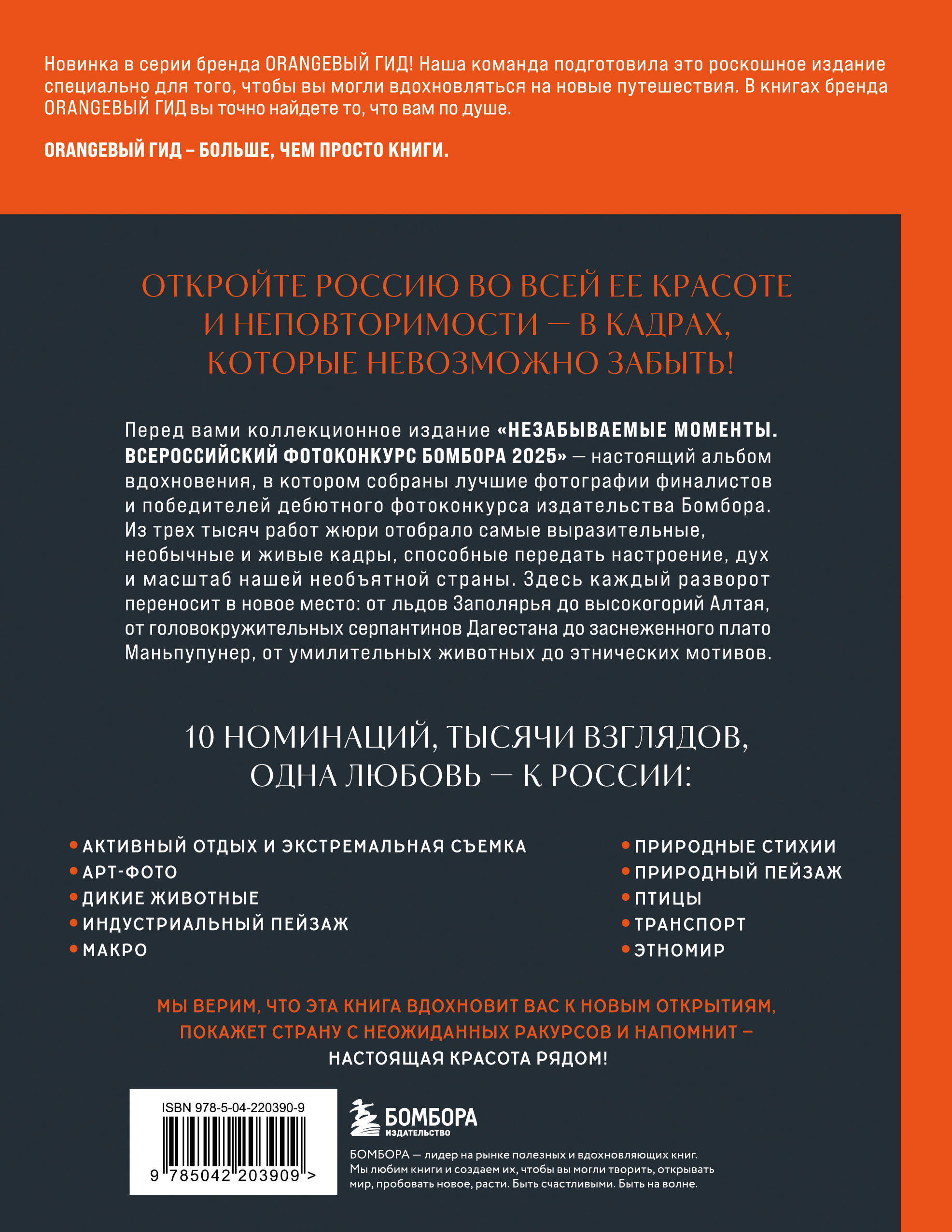 Откройте Россию - многогранную и бескрайнюю - в кадрах, которые невозможно забыть! Перед вами - коллекционное подарочное издание «Незабываемые моменты. Всероссийский фотоконкурс Бомбора 2025» - настоящий альбом вдохновения и признания в любви к стране, где каждый снимок становится откровением. Из более чем трех тысяч заявок жюри выбрало лучшие из лучших - самые выразительные, эмоциональные и неожиданные фотографии, в которых оживает настроение, дух и масштаб России. Каждый разворот - это путешествие: - от ледяных просторов Заполярья до залитых солнцем долин Алтая; - от серпантинов Дагестана до загадочного плато Маньпупунёр; - от умилительных животных и живых портретов до этнических мотивов и пейзажей, наполненных светом и смыслом. 10 номинаций. Тысячи взглядов. Одна любовь - к России. Эта книга - визуальная симфония и напоминание о том, как прекрасен мир вокруг. Пусть она вдохновит вас на новые путешествия и поможет вновь увидеть главное - настоящая красота ближе, чем кажется!| Издательство | ООО "Издательство "Эксмо" |
