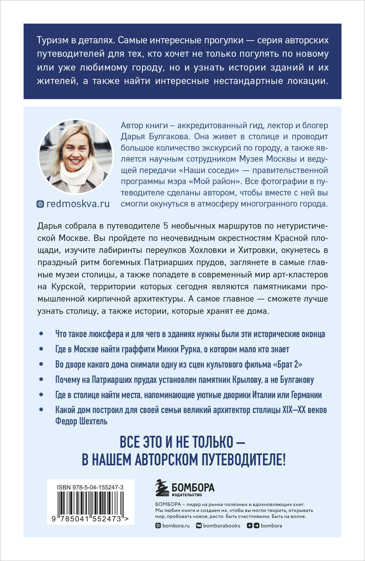 Новый авторский путеводитель серии «Туризм в деталях» позволит вам открыть для себя Москву с новой стороны, лучше узнать столицу и истории, которые хранят ее дома. Следуя по нашим маршрутам, вы сможете узнать: • Почему на Патриарших прудах установлен памятник Крылову, а не Булгакову. • Где в столице найти места, напоминающие уютные дворики Италии или Германии. • Во дворе какого дома снимали сцену из культового фильма «Брат-2». Все это и многое другое - на страницах нашего нового авторского путеводителя!| Издательство | ООО "Издательство "Эксмо" |