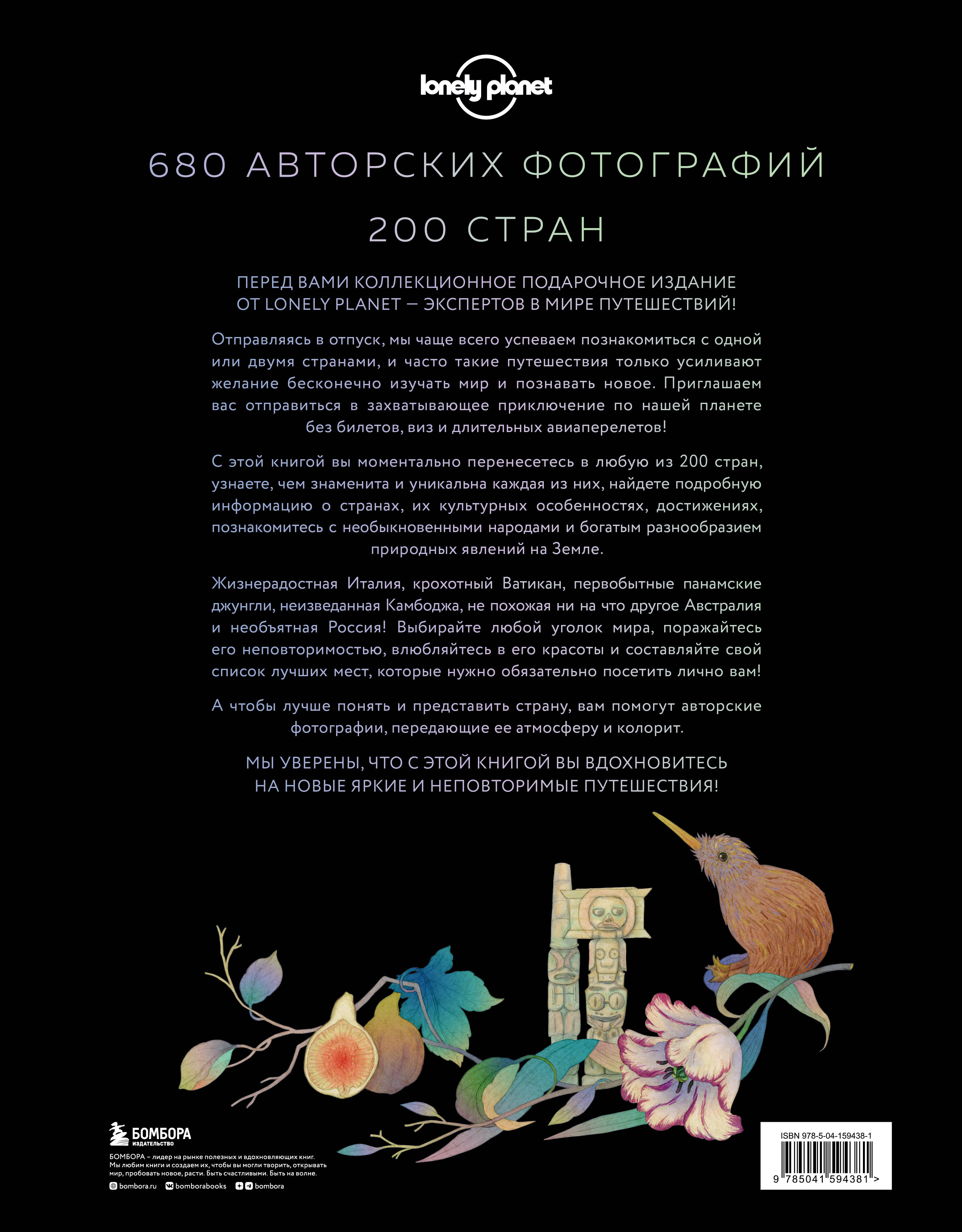 Перед вами коллекционное подарочное издание от Lonely Planet - экспертов в мире путешествий! Оправляясь в отпуск, мы чаще всего успеваем познакомиться с одной или двумя странами, и часто такие путешествия только усиливают желание бесконечно изучать мир и познавать новое. Приглашаем вас отправиться в захватывающее приключение по нашей планете без билетов, виз и длительных авиаперелетов! С этой книгой вы моментально перенесетесь в любую из 200 стран, узнаете, чем знаменита и уникальна каждая из них, найдете подробную информацию о странах, их культурных особенностях, достижениях, познакомитесь с необыкновенными народами и богатым разнообразием природных явлений на Земле. Жизнерадостная Италия, крохотный Ватикан, первобытные панамские джунгли, неизведанная Камбоджа, непохожая ни на что другое Австралия и необъятная Россия! Выбирайте любой уголок мира, поражайтесь его неповторимостью, влюбляйтесь в его красоты и составляйте свой список лучших мест, которые нужно обязательно посетить лично вам! А чтобы лучше понять и представить страну, вам помогут авторские фотографии, передающие ее атмосферу и колорит. Мы уверены, что с этой книгой вы вдохновитесь на новые яркие и неповторимые путешествия!| Издательство | ООО "Издательство "Эксмо" |