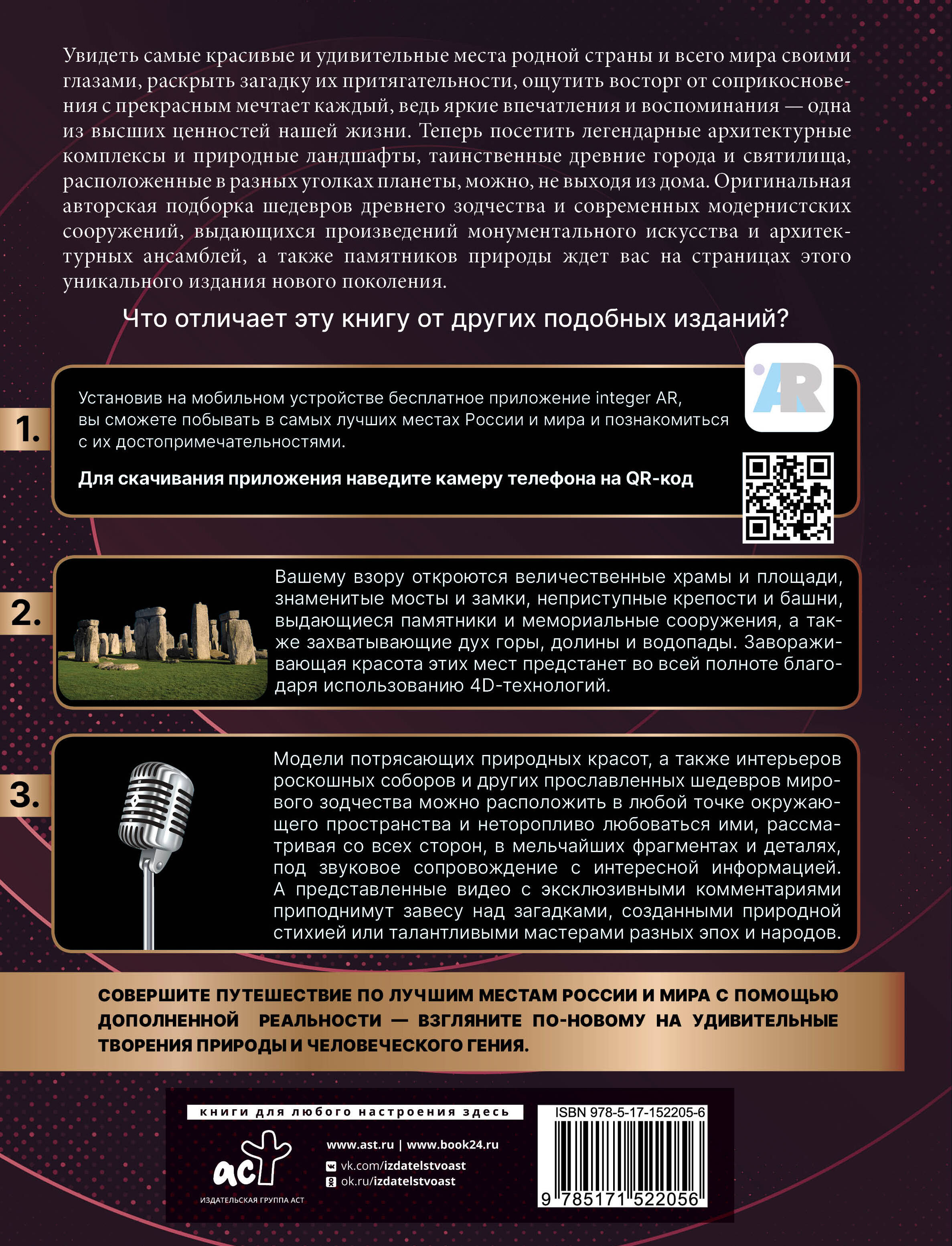 Вместе с этим уникальным изданием с дополненной реальностью вы сможете совершить яркое, запоминающееся путешествие по лучшим местам России и мира. Увлекательный рассказ на страницах книги сопровождают красочные изображения величественных дворцов и соборов, прославленных мостов и башен, загадочных древних святилищ и городов, великолепных памятников и мемориальных комплексов, потрясающих природных ландшафтов и живописных пейзажей. Более того, используя 4D-технологии, вы сможете сполна насладиться красотой всех этих мест, воочию оценив гармонию и совершенство творений природной стихии и человеческого гения. Установив бесплатное приложение integer AR, вы станете участником виртуального тура, включающего самые знаменитые и всемирно признанные достопримечательности, и получите возможность не только рассматривать их в мельчайших фрагментах и деталях, располагая модели и видео архитектурных сооружений, интерьеров и природных красот в любой точке окружающего вас пространства, но и прослушивать занимательную информацию о них. Побывайте в лучших местах России и мира, воспользовавшись возможностями 4D-технологий, взгляните на удивительные творения природы и человека и поверьте - вы не забудете их никогда!| Издательство | ИЗДАТЕЛЬСТВО "АСТ" |