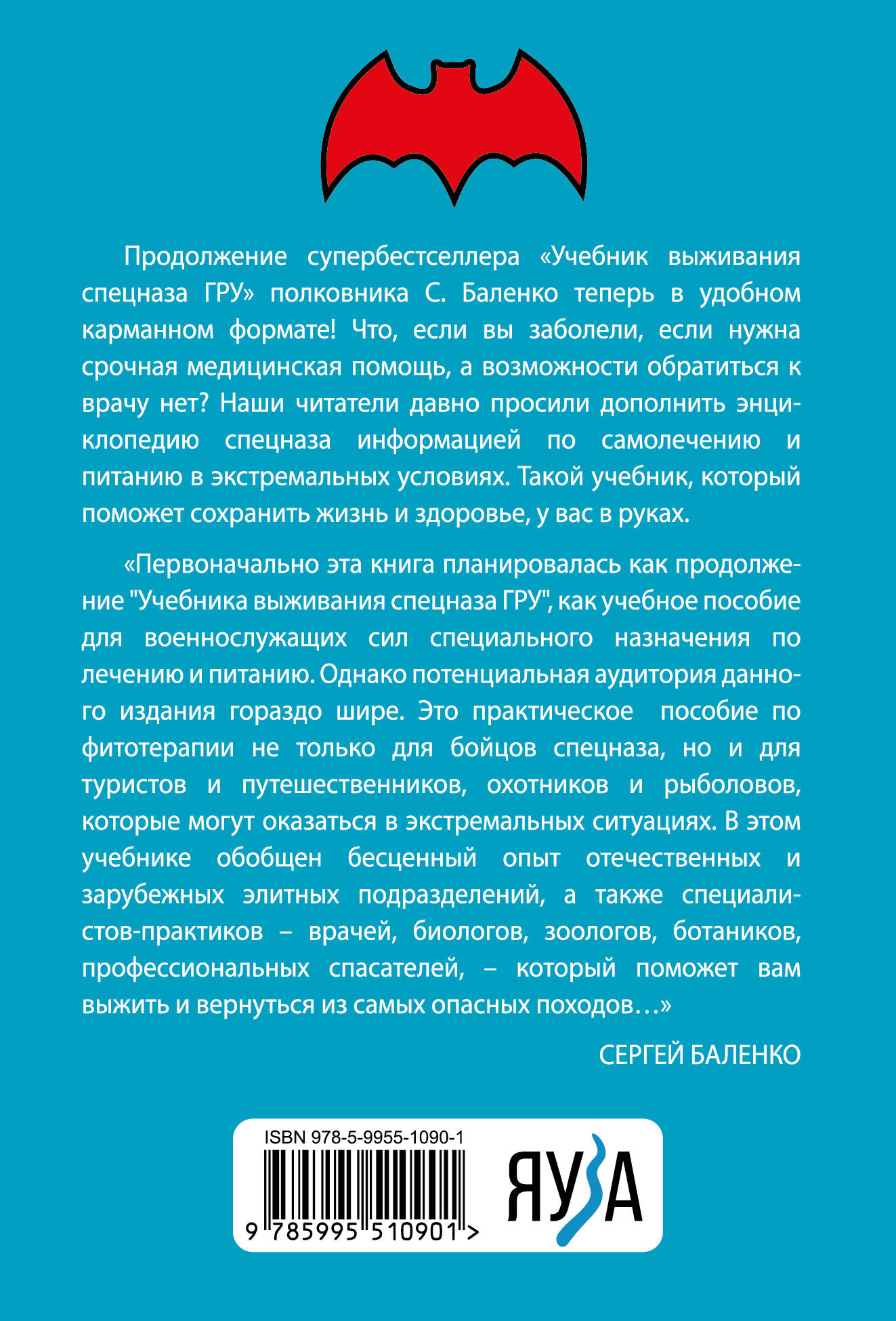 Продолжение супербестселлера «Учебник выживания спецназа ГРУ» полковника С. Баленко теперь в удобном карманном формате! Что, если вы заболели, если нужна срочная медицинская помощь, а возможности обратиться к врачу нет? Наши читатели давно просили дополнить энциклопедию спецназа информацией по самолечению и питанию в экстремальных условиях. Такой учебник, который поможет сохранить жизнь и здоровье, у вас в руках. «Первоначально эта книга планировалась как продолжение "Учебника выживания спецназа ГРУ", как учебное пособие для военнослужащих сил специального назначения по лечению и питанию. Однако потенциальная аудитория данного издания гораздо шире. Это - практическое пособие по фитотерапии не только для бойцов спецназа, но и для туристов и путешественников, охотников и рыболовов, которые могут оказаться в экстремальных ситуациях. В этом учебнике обобщен бесценный опыт отечественных и зарубежных элитных подразделений, а также специалистов-практиков - врачей, биологов, зоологов, ботаников, профессиональных спасателей, - который поможет вам выжить и вернуться из самых опасных походов…» - СЕРГЕЙ БАЛЕНКО