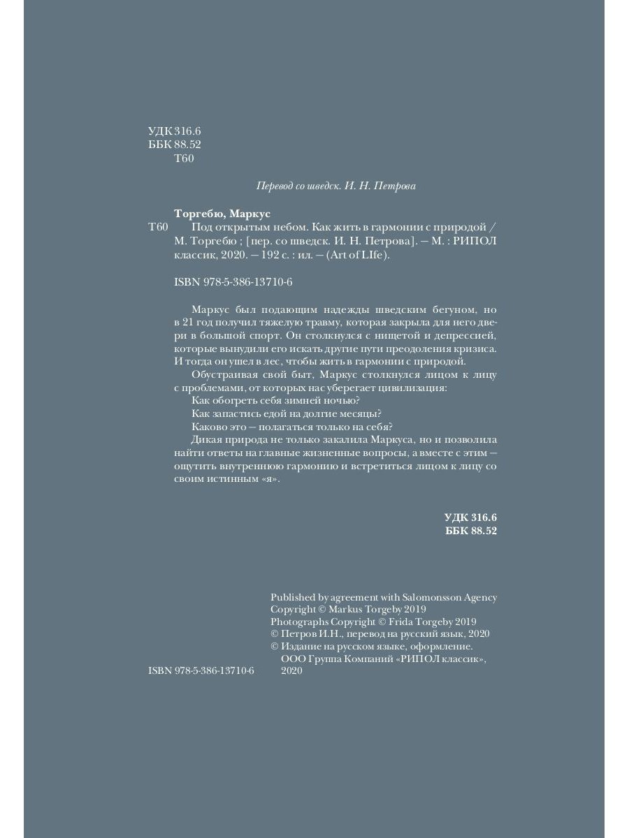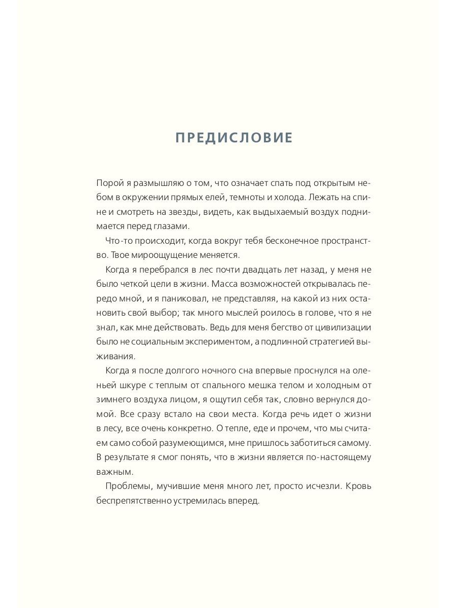 Маркус был подающим надежды шведским бегуном, но в 21 год получил тяжелую травму, которая закрыла для него двери в большой спорт. Он столкнулся с нищетой и депрессией, которые вынудили его искать другие пути преодоления кризиса. И тогда он ушел в лес, чтобы жить в гармонии с природой. Обустраивая свой быт, Маркус столкнулся лицом к лицу с проблемами, от которых нас уберегает цивилизация: Как обогреть себя зимней ночью? Как запастись едой на долгие месяцы? Каково это - полагаться только на себя? Дикая природа не только закалила Маркуса, но и позволила найти ответы на главные жизненные вопросы, а вместе с этим - ощутить внутреннюю гармонию и встретиться лицом к лицу со своим истинным «я».| Издательство | Рипол Классик |