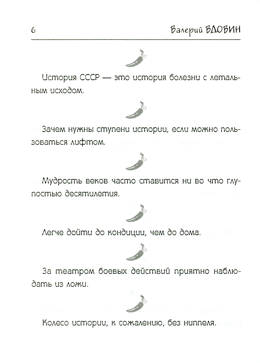 Валерий Вдовин - оптимистичный, жизнелюбивый человек с большим чувством юмора. Уже много лет подряд он собирает и сочиняет лаконичные, остроумные изречения. Все афоризмы, приведённые в этом сборнике, так или иначе прозвучали в его жизни: многое он изрёк сам, что-то подслушал, додумал и изменил. Бывает, что на авторство одного афоризма претендует несколько человек, но ведь даже знаменитые законы физики приходили одновременно в несколько светлых умов! Так что не исключено, что что-то вам покажется уже знакомым, но всё равно улыбнитесь, смех продлевает жизнь и улучшает самочувствие! Талантливые, искромётные стихи, навеянные афоризмами Вдовина, специально для этой книги написала подруга автора - Ялинз Серёгина.| Издательство | Центрполиграф |