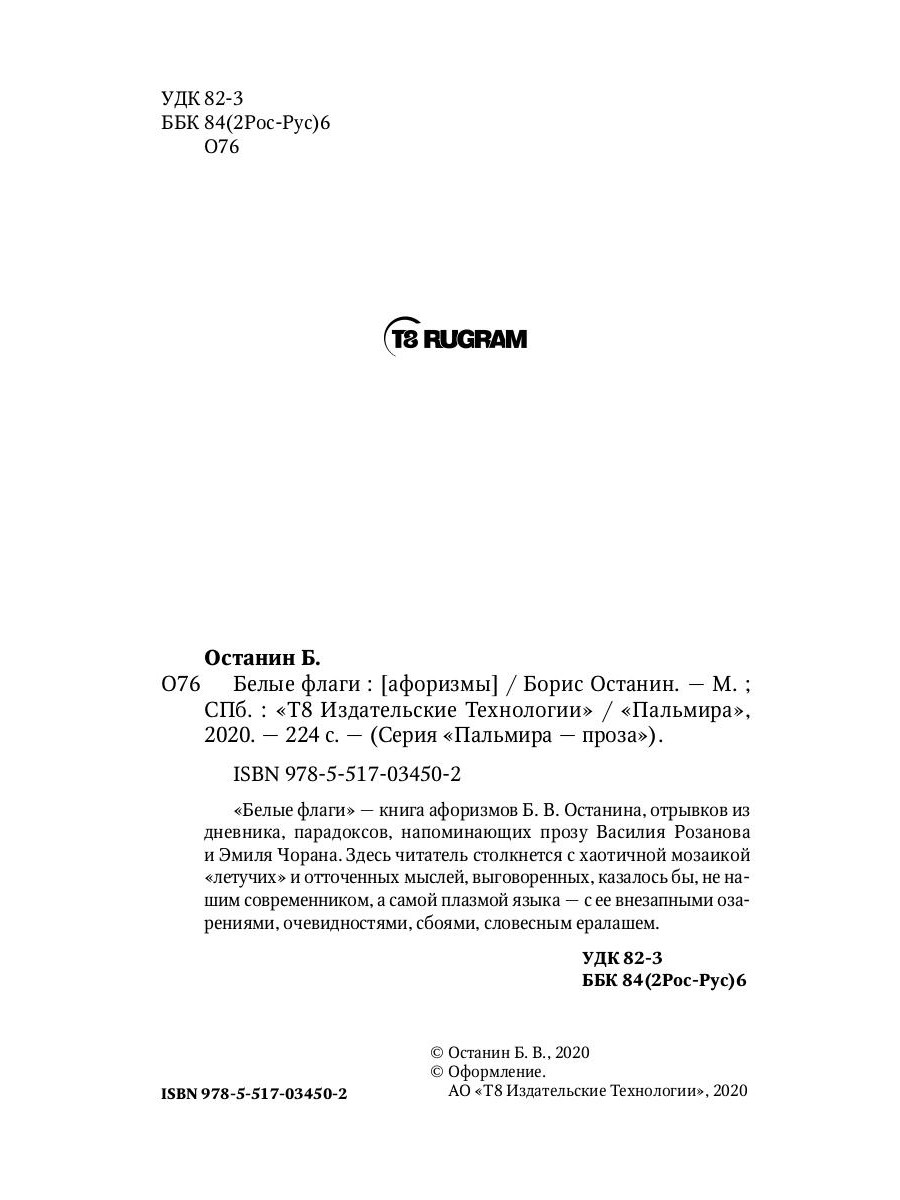 «Белые флаги» - книга афоризмов Б. В. Останина, отрывков из дневника, парадоксов, напоминающих прозу Василия Розанова и Эмиля Чорана. Здесь читатель столкнется с хаотичной мозаикой «летучих» и отточенных мыслей, выговоренных, казалось бы, не нашим современником, а самой плазмой языка с ее внезапными озарениями, очевидностями, сбоями, словесным ералашем.