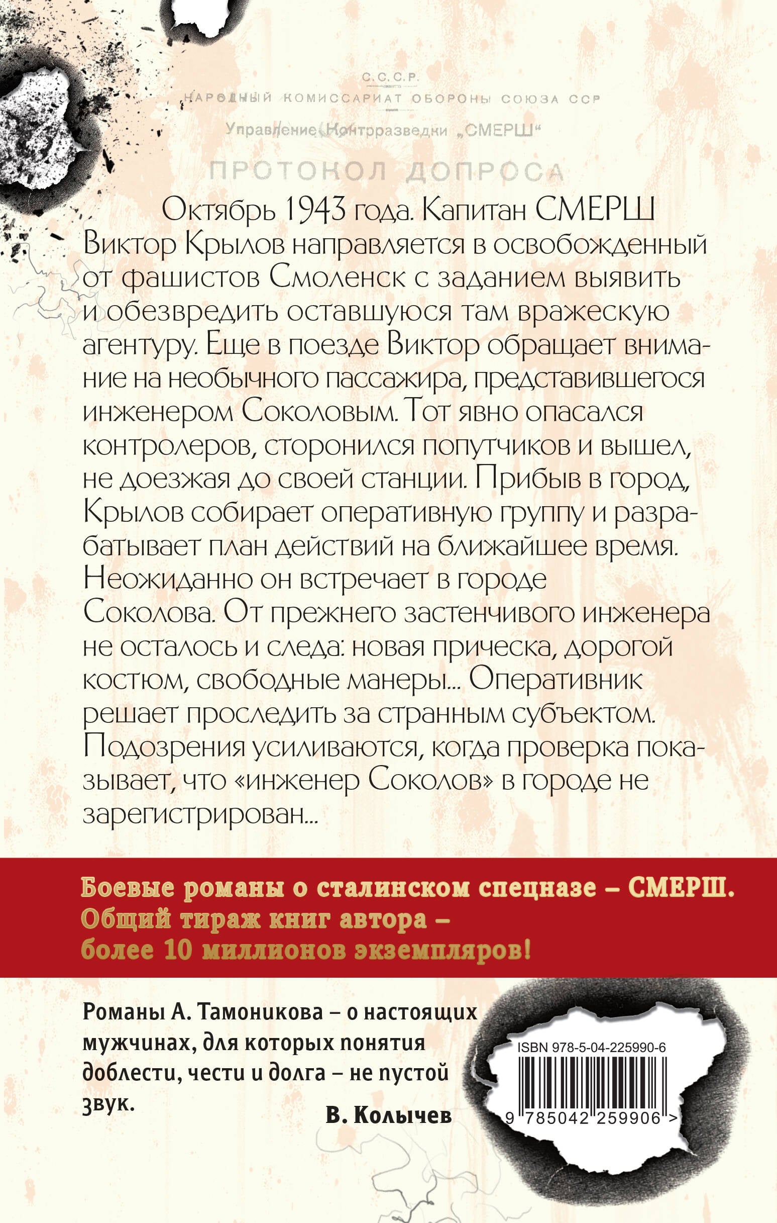 Самые интересные романы о сталинском спецназе - СМЕРШе. Октябрь 1943 года. Капитан СМЕРШа Виктор Крылов направляется в освобожденный от фашистов Смоленск с заданием выявить и обезвредить оставшуюся там вражескую агентуру. Еще в поезде Виктор обращает внимание на необычного пассажира, представившегося инженером Соколовым. Тот явно опасался контролеров, сторонился попутчиков и вышел, не доезжая до своей станции. Прибыв в город, Крылов собирает оперативную группу и разрабатывает план действий на ближайшее время. Неожиданно он встречает в городе Соколова. От прежнего застенчивого инженера не осталось и следа: новая прическа, дорогой костюм, свободные манеры… Оперативник решает проследить за странным субъектом. Подозрения усиливаются, когда проверка показывает, что «инженер Соколов» в городе не зарегистрирован… «Смерть шпионам!» (СМЕРШ) - это короткое и беспощадное название носило особое подразделение НКВД, подчинявшееся И. Сталину. Созданное в годы войны, оно состояло из проверенных в бою, честных и бесстрашных офицеров Красной Армии. СМЕРШа боялись все - и фашистские лазутчики, готовящие диверсии в наших боевых порядках, и гитлеровские приспешники, действующие в глубоком советском тылу. Враг знал: если на его след напали бойцы сталинского спецназа, справедливого и скорого суда не избежать. Романы серии «СМЕРШ - спецназ Сталина» - это каждый раз увлекательный динамичный сюжет и новые исторические знания, это экшен, написанный простым и понятным языком. Общий тираж книг А. Тамоникова - более 10 миллионов экземпляров! «Романы А. Тамоникова - о настоящих мужчинах, для которых понятия доблести, чести и долга - не пустой звук». - В. Колычев| Издательство | ООО "Издательство "Эксмо" |