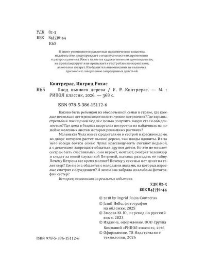 СОДЕРЖИТ ИНФОРМАЦИЮ О НАРКОТИЧЕСКИХ ИЛИ ПСИХОТРОПНЫХ ВЕЩЕСТВАХ, УПОТРЕБЛЕНИЕ КОТОРЫХ ОПАСНО ДЛЯ ЗДОРОВЬЯ. ИХ НЕЗАКОННЫЙ ОБОРОТ ВЛЕЧЕТ УГОЛОВНУЮ ОТВЕТСТВЕННОСТЬ. Маленькая Чула живет с родителями и сестрой в красивом доме, во дворе которого растет Пьяное дерево, чьи плоды ядовиты. Из-за него соседи боятся семью Чулы: красавицу-мать считают ведьмой и запрещают другим детям общаться с сестрами. Но это не мешает девочкам быть счастливыми: они играют, мечтают, смотрят телевизор и следят за новой служанкой Петроной, пытаясь разгадать ее тайну. Почему Петрона все время молчит? Почему у ее семьи нет денег на телевизор? Зачем она общается с молодыми людьми, на которых взрослые смотрят с осуждением? И зачем она забрала из альбома фотографии сестер?| Издательство | Рипол Классик |