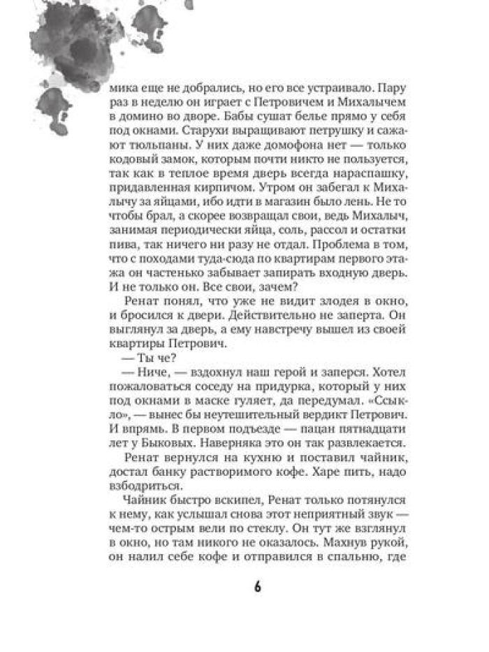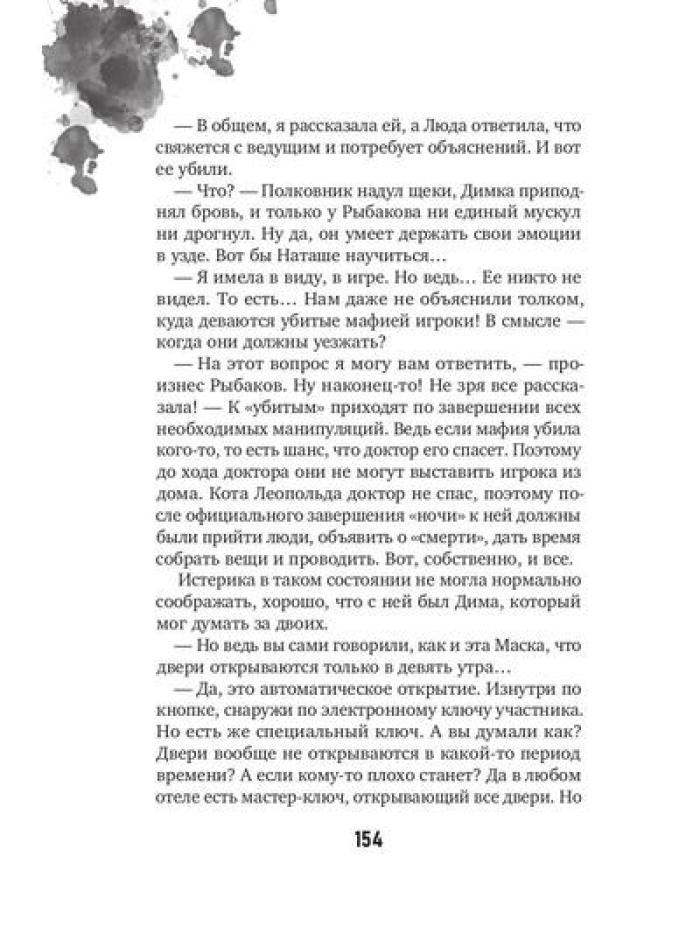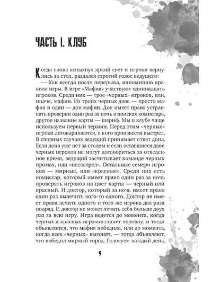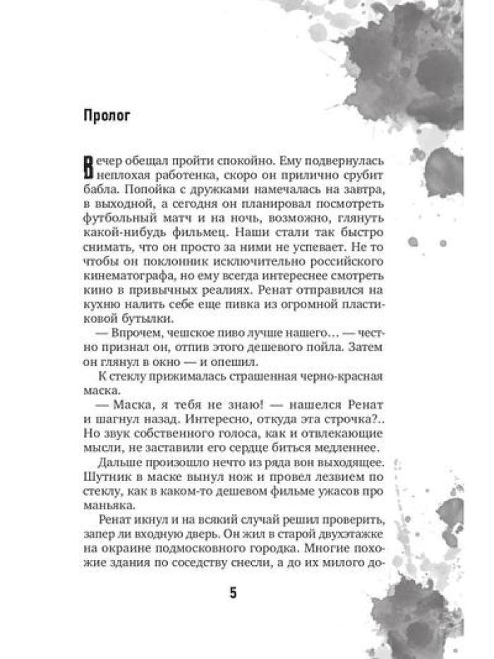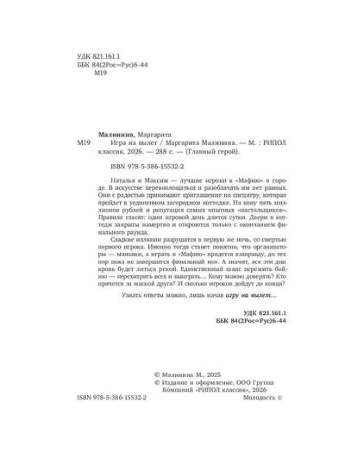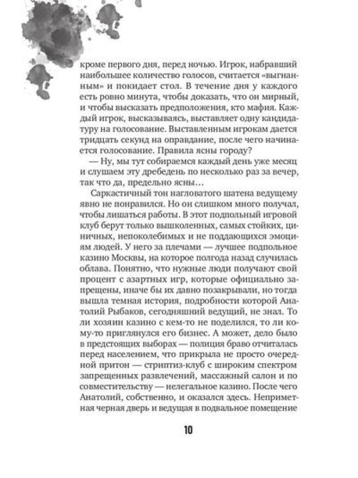 Наталья и Максим - лучшие игроки в «Мафию» в городе. В искусстве перевоплощаться и разоблачать им нет равных. Они с радостью принимают приглашение на специгру, которая пройдет в уединенном загородном коттедже. На кону пять миллионов рублей и репутация самых опытных «настольщиков». Правила гласят: один игровой день длится сутки. Двери в коттедж закрыты намертво и откроются только с окончанием финального раунда. Сладкие иллюзии разрушатся в первую же ночь, со смертью первого игрока. Именно тогда станет понятно, что организаторы - маньяки, а играть в «Мафию» придется взаправду, до тех пор пока не завершится финальный кон. А значит, все эти дни кровь будет литься рекой. Единственный шанс пережить бойню - перехитрить всех и выиграть… Кому можно доверять? Кто прячется за маской друга? И сколько игроков дойдут до конца? Узнать ответы можно, лишь начав игру на вылет…| Издательство | Рипол Классик |