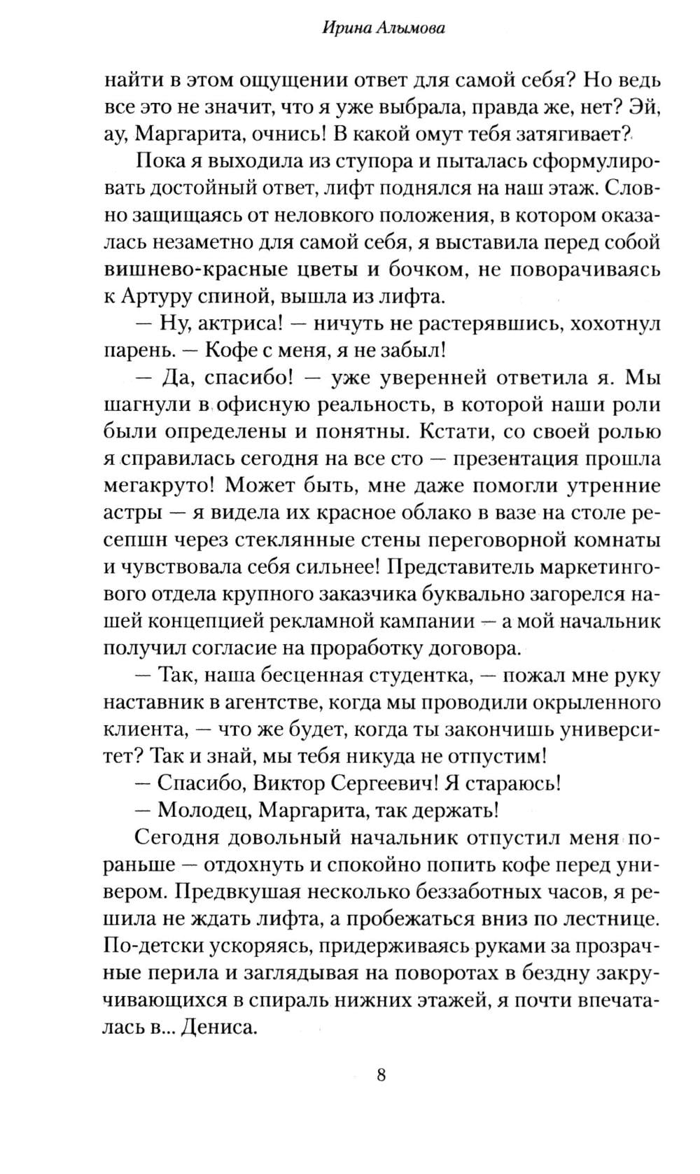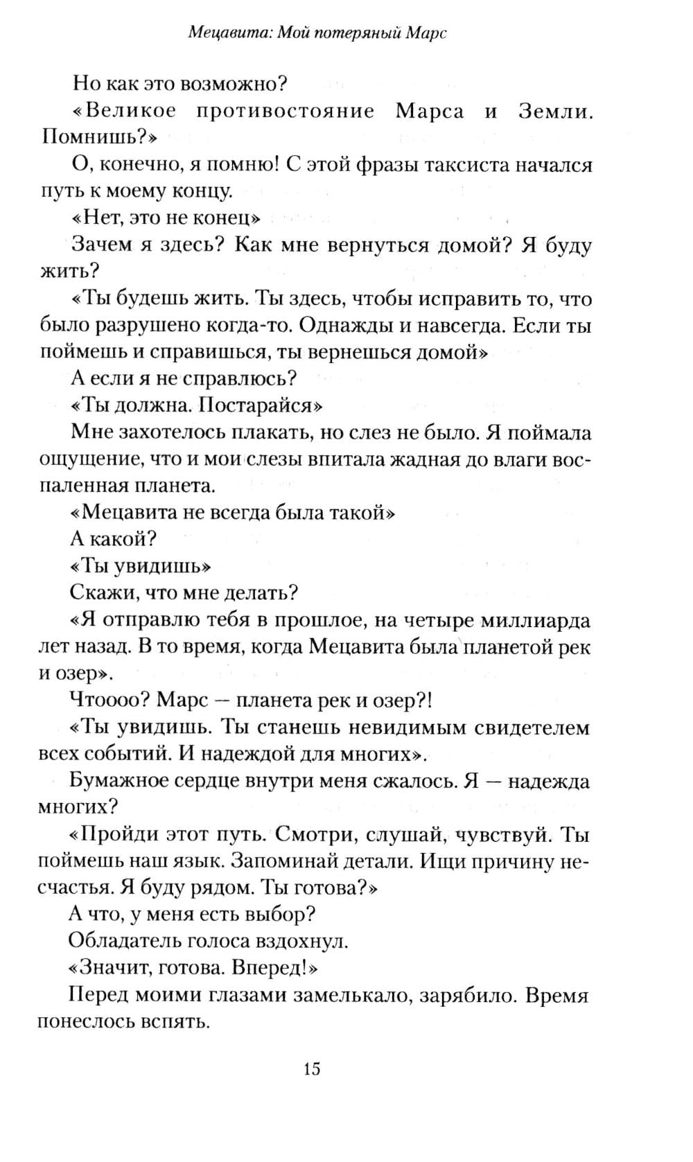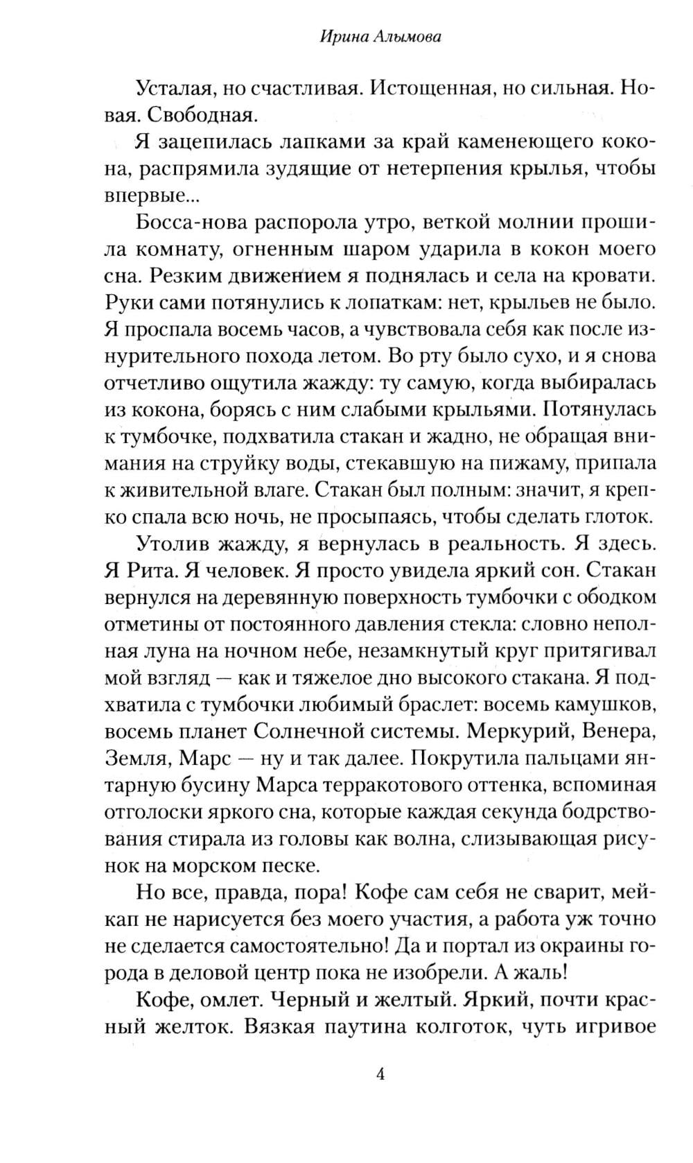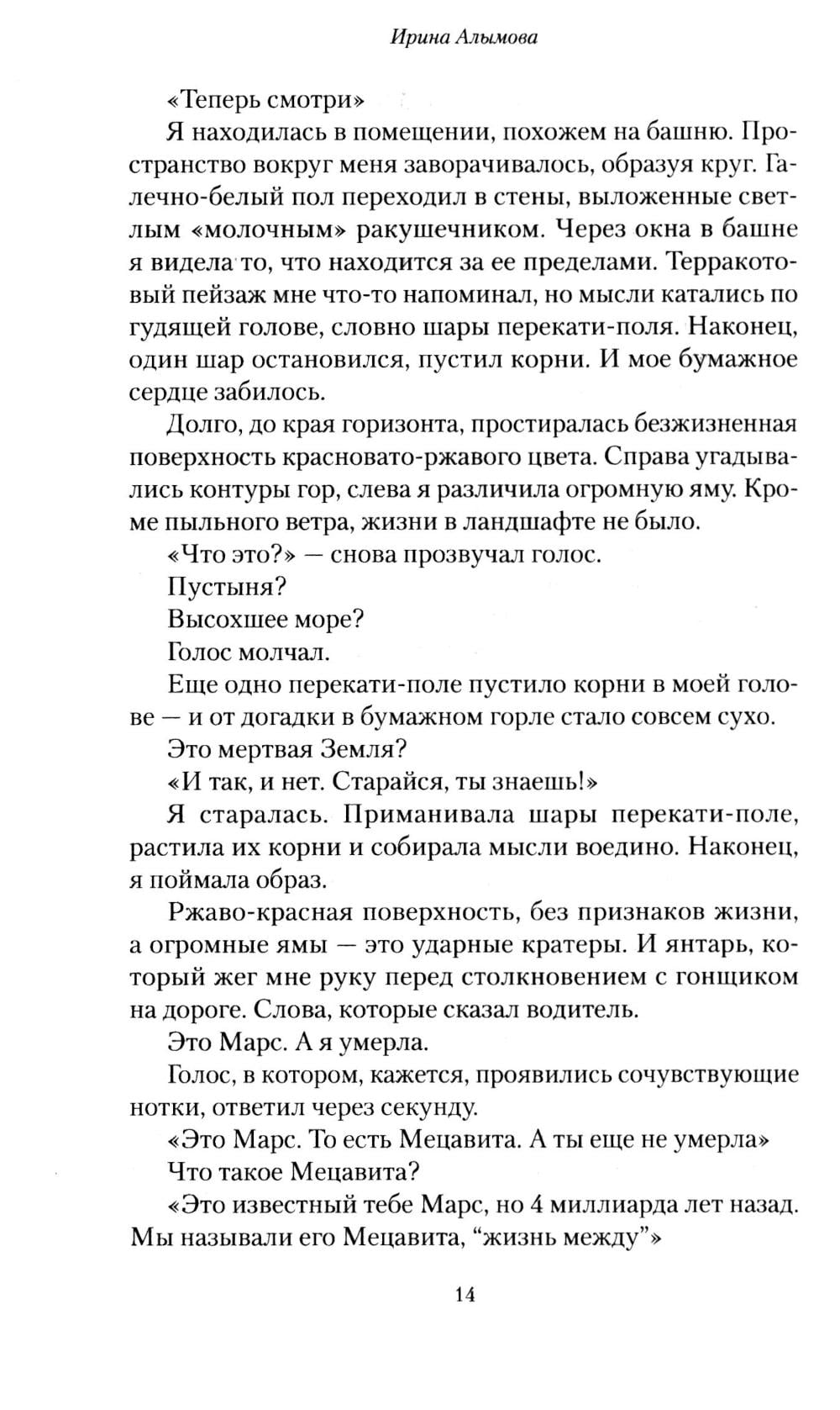 Восходящая юная звезда рекламного агентства Маргарита попадает в аварию и... ее душа оказывается на Древнем Марсе. Чтобы вернуться в земное тело, девушка должна сыграть загадочную роль в судьбе юной марсианки Лэйф, которая мечтает стать толковательницей языка древних рек и вырвать у жизни право на взаимную любовь. Только вот на ее пути встают опасные противники: старейшины и вожди, смертоносный Царь лесов, стремительное течение бездонного Лабиринта, женщина-змея с даром ворожбы. Да и сама планета скрывает горькую тайну, не разгадав которую все жители будут обречены... Ирина Алымова - автор более двадцати книг с общим тиражом 150 000 экземпляров. Победитель конкурса историй про колонизацию Дальнего Космоса издательства «Wizart Comics», конкурса мистических рассказов «Маяк» издательства «Вече», финалист Волошинского фестиваля, конкурса фантастики «Кубок Рея Брэдбери».