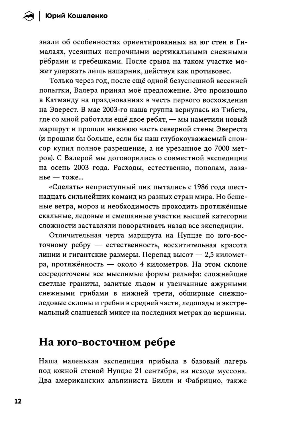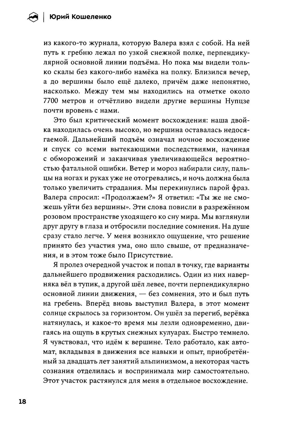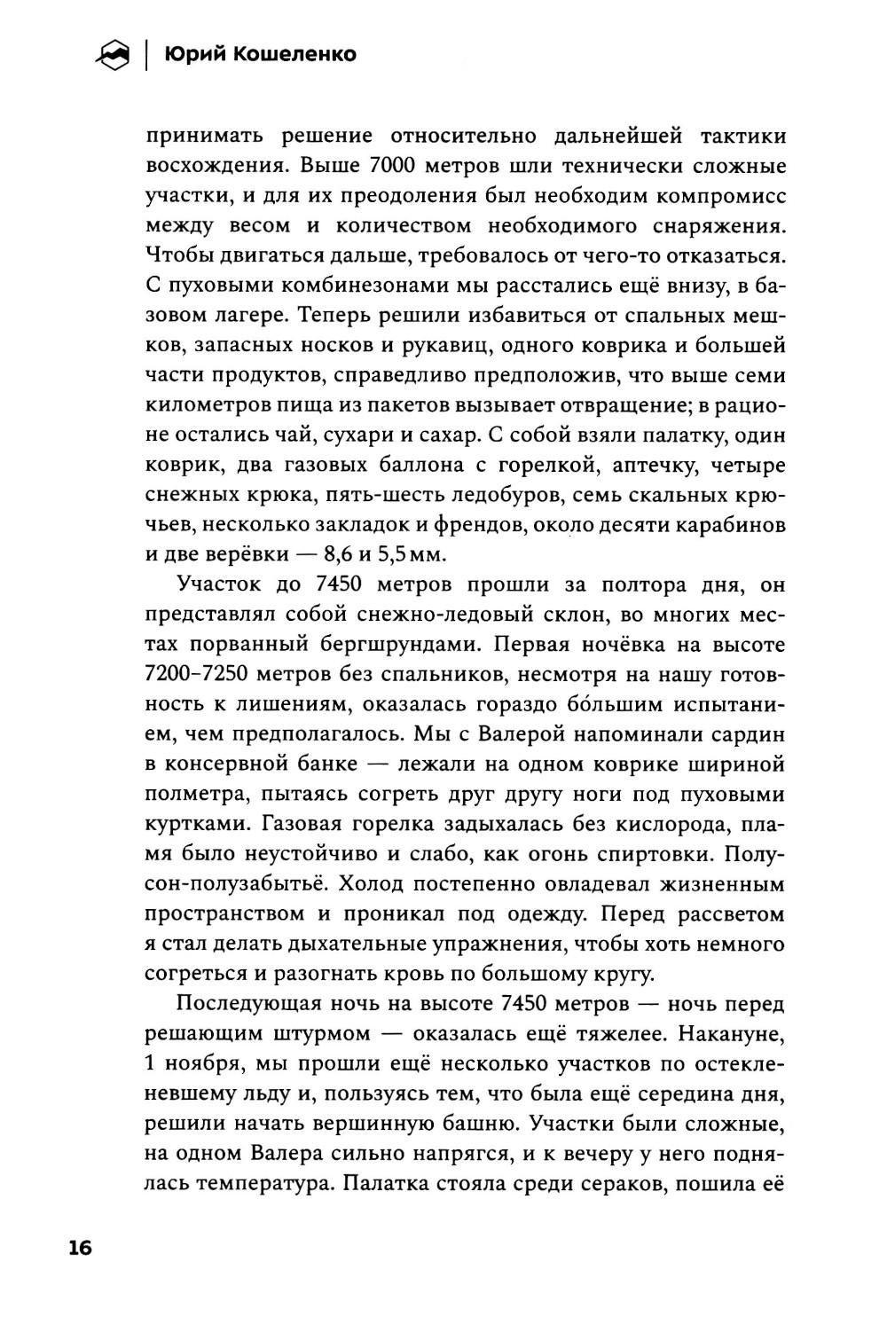 Альпинистская книжка - персональный «зал славы» всякого своего обладателя. И в то же время очень личный документ, в котором раскрывается не только череда спортивных побед, но и отчасти характер человека и широта его стремлений. Перед вами такая альпкнижка - «Книжка альпиниста». Более 40 лет Юрий Кошеленко исследует альпинизм и пределы возможного в горах. В своей книге автор размышляет о предназначении альпинизма и делится переживаниями собственного духовного роста по мере обретения опыта и трансформации представлений о том, что сам Юрий считает краеугольным камнем альпинистской науки, - стиле восхождений. «Книжка альпиниста» - это не список всех совершённых Юрием восхождений в хронологическом порядке, а вдохновляющий рассказ о его пути на мировую арену альпинизма. От дебютных восхождений на Кавказе, закрытия третьего разряда в Узунколе, первых счастливых опытах в команде второразрядников до крупных международных проектов, смелых первопроходов по всему миру, награды Piolets d'Or и определения для себя понятия «чистого стиля».| Издательство | Библиотека Спорт-Марафон |
