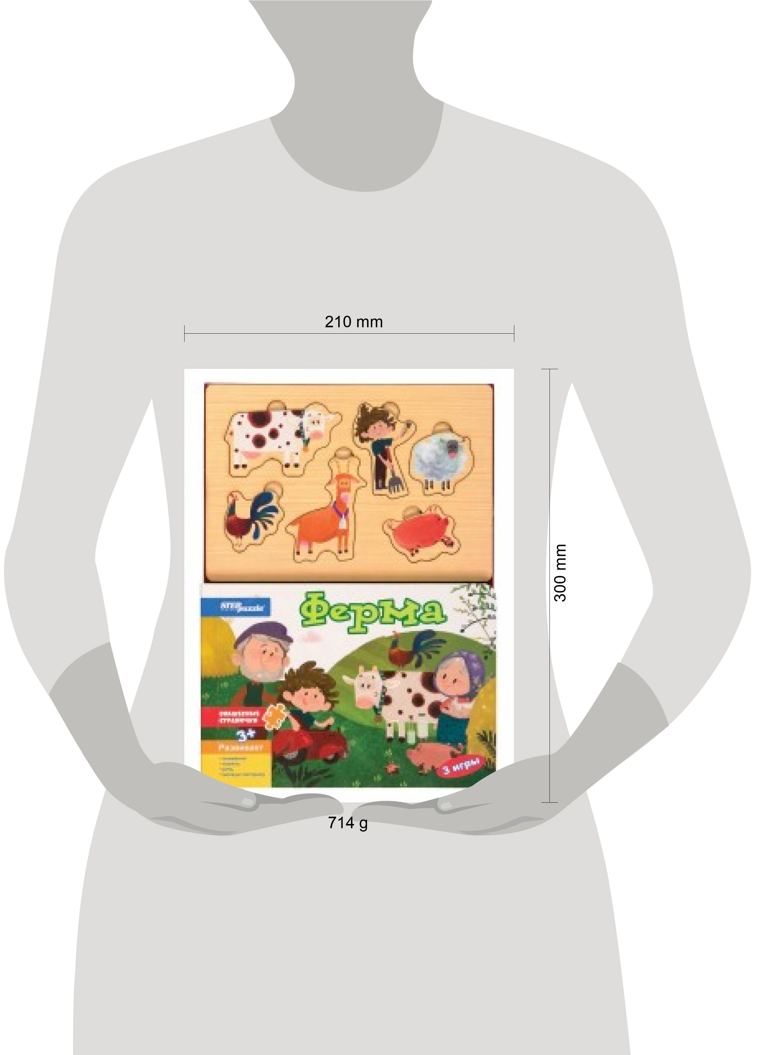 Книжка-игрушка "Ферма" познакомит малыша с животными фермы и расширит представление ребёнка об окружающем мире. Пазлы в книжке и планшете ориентированы на активное развитие мелкой моторики, сенсорики, речи, памяти, внимания, логического и образного мышления. Характеристики игры: - яркое, качественное изображение; - средние по размеру детали (эргономичны для детской руки, детали вставляются и вынимаются из планшета легко); - экологически чистые, нетоксичные материалы (игра состоит из дерева и плотного картона). Для кого подходит? Игра понравится детям от 3х лет. Чем полезна игра? - помогает в игровой форме выучить названия животных фермы; - развивает мелкую моторику, внимание; - развивает познавательную активность, аналитические способности ребенка; - способствует развитию образного и логического мышления; - учит самостоятельно придумывать варианты игры на планшете; - развивает основные психические функции ребенка. Что входит в состав игры? - деревянный планшет (размер игрового планшета 21 х 14,5 см, толщина 8 мм); - 6 пазлов-вкладышей в планшете (коровка, овечка, козочка, петушок, свинка, мальчик); - книжка игрушка (размер книжки-игрушки 21 х 15 см, толщина 2 см); - 6 пазлов-вкладышей в книжке-игре (коровка, овечка, козочка, петушок, свинка, мальчик). Общий размер книжки + игры - 30 х 21,5 см, толщина 2,2 см. Внимание! Книжка состоит из 8 страниц (4 разворота). Последняя страница приклеена к картонке-подложке. Страницы у книжки толстые и склеены специально. Не пытайтесь их разорвать. Как играть? - 1-я игра: дополните картинки деревянными фигурками; - 2-я игра: соберите фигурки из картона; - 3-я игра: найдите отличия картонных и деревянных фигурок. Материалы. Картон, дерево. В серии "Волшебные странички": - Книжка-игрушка "Животные жарких стран" - Книжка-игрушка "Подводный мир" - Книжка-игрушка "Лесные друзья бельчонка"| Издательство | Степ Пазл ЗАО |