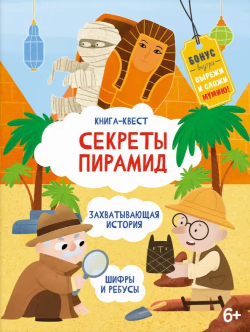 Маленькому игроку предстоит пройти захватывающий квест, перемещаясь по маршруту из отгадок и ключей, спрятанных внутри. Разгадывая головоломки, ребусы и задачи, ребёнок раскроет «тайну» и получит в подарок бонус: фигурку из бумаги одного из героев книги - мумию, попугая или дракона. Её легко собрать по схеме без клея.