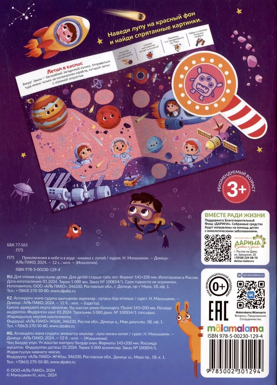 Серия "Искалочка" - это занимательная книга с лупой, с помощью которой можно искать предметы на специальных зашифрованных участках страниц. Книга "Приключения в небе и в воде" позволит малышу отправить в завораживающий полёт к далёким звёздам и нырнуть в морские глубины! Рассматривая картинки, ребёнок сможет выполнять задания и находить новые детали с помощью красной лупы. Задания развивают внимательность, логику, помогают потренировать счёт. Развиваться весело вместе с Malamalama!| Издательство | Производитель сторонней продукции |