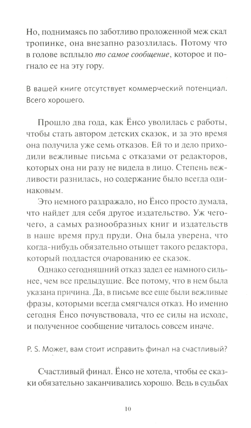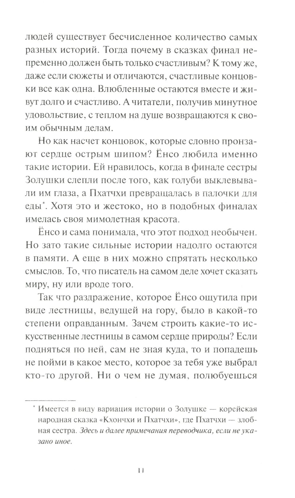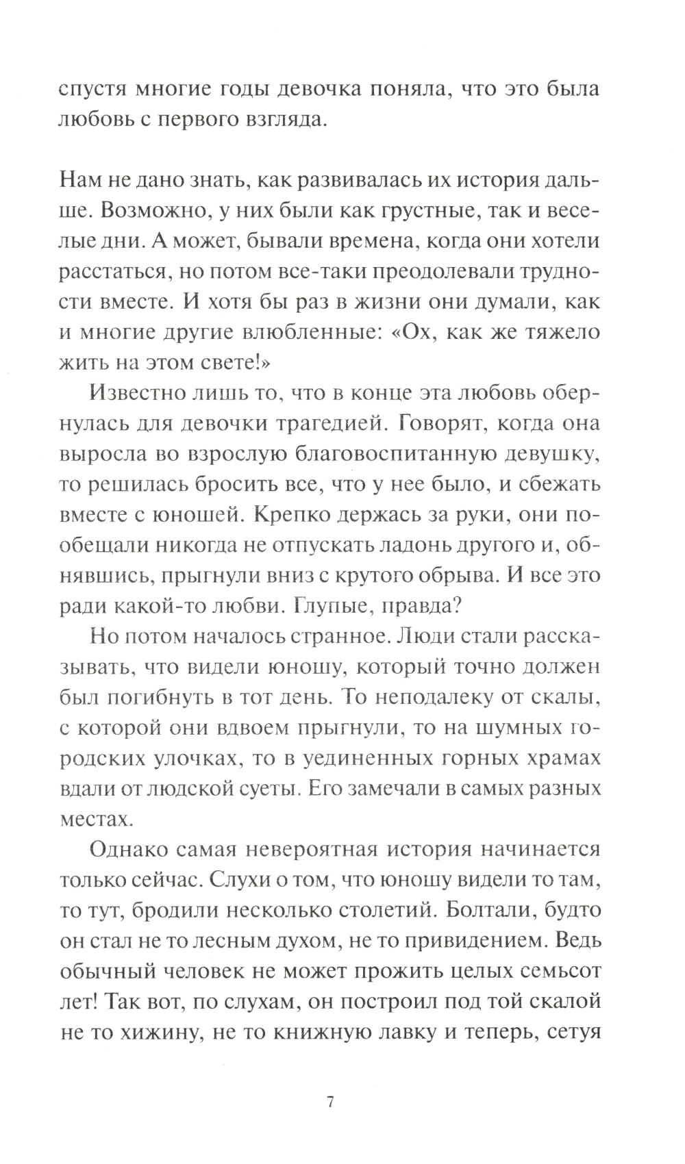 Прошло два года, как Ёнсо бросила офисную работу, чтобы стать детской писательницей. И с тех самых пор ее преследует неудача: ни одно издательство не хочет публиковать ее сказки с плохим концом. Но ведь жизнь, убеждена Ёнсо, полна самых разных историй - и это нормально, что некоторые из них грустные. Однажды, раздосадованная очередным отказом, девушка отправляется на прогулку и набредает на странную книжную лавку, спрятанную среди скал. Еще более странный - ее хозяин. Он молод, но ведет себя так, будто провел на земле уже тысячу лет, а еще читает вслух каждому посетителю. Знакомство с ним чуть не обернулось для Ёнсо гибелью, но девушке придется вернуться в магазинчик, чтобы разгадать главную загадку: почему же ей кажется, что она встречала этого мужчину раньше?..| Издательство | Манн, Иванов и Фербер |