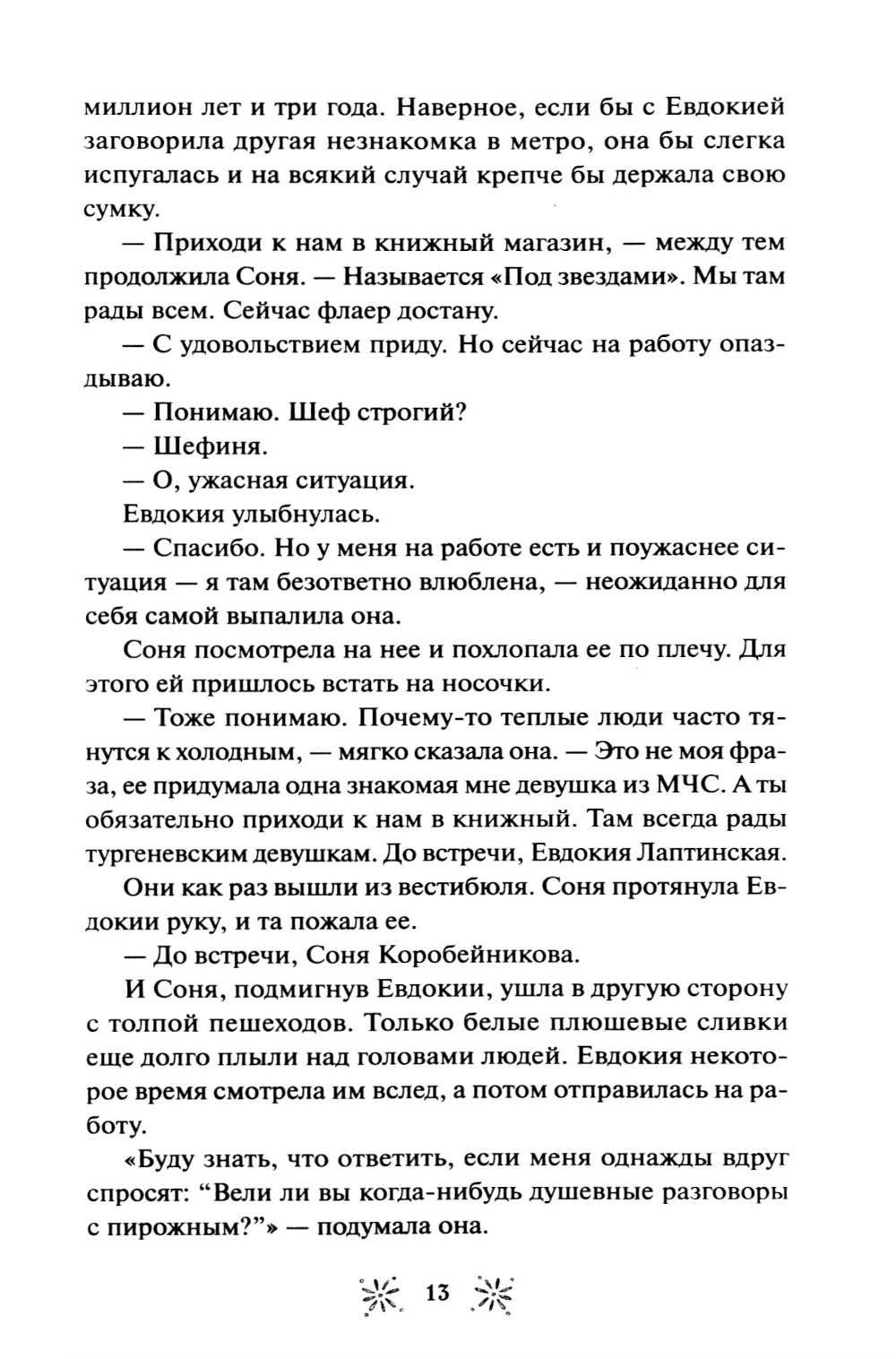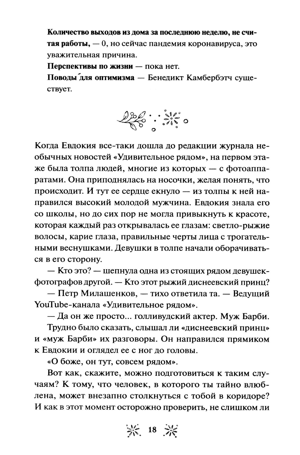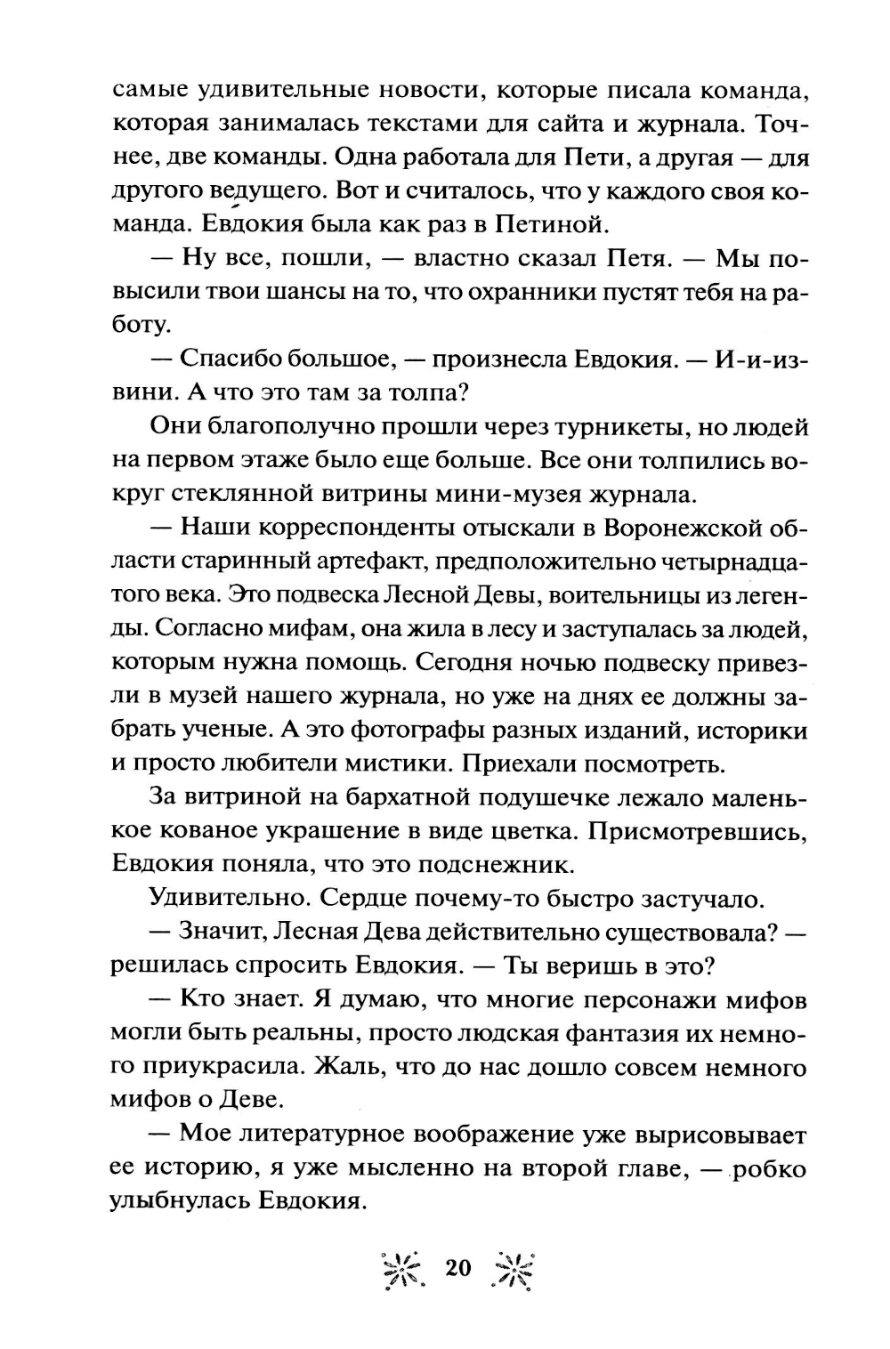 Евдокия Лаптинская - скромная журналистка, которая привыкла прятаться в тени начальницы-тирана и безответно вздыхать по красавцу-коллеге. Но что если ее скучная жизнь - всего лишь иллюзия? Когда случай приводит Досю в книжный магазин «Под звездами», где персонажи книг оживают, она обнаруживает в себе редкий дар, способный менять реальность. Теперь Досе предстоит разгадать тайну исчезнувшей подвески Лесной Девы, научиться управлять своими способностями и выяснить - куда пропала ее любимая писательница и почему за ней следит загадочный исследователь Марк Снежин? Как связаны ночные кошмары сотрудников и странный дом в лесу? И кто на самом деле ее начальница? В загадочном магазинчике Дося находит не только подруг, но и то, что скрывается за книжными полками. Хватит ли у нее смелости принять свою новую жизнь, где даже любовь может оказаться не такой, как в ее мечтах?| Издательство | Манн, Иванов и Фербер |