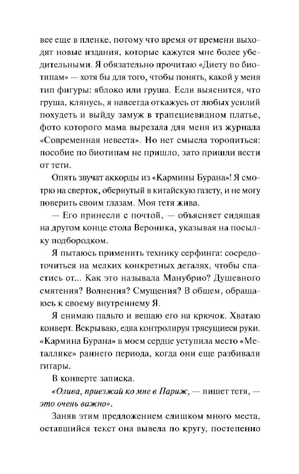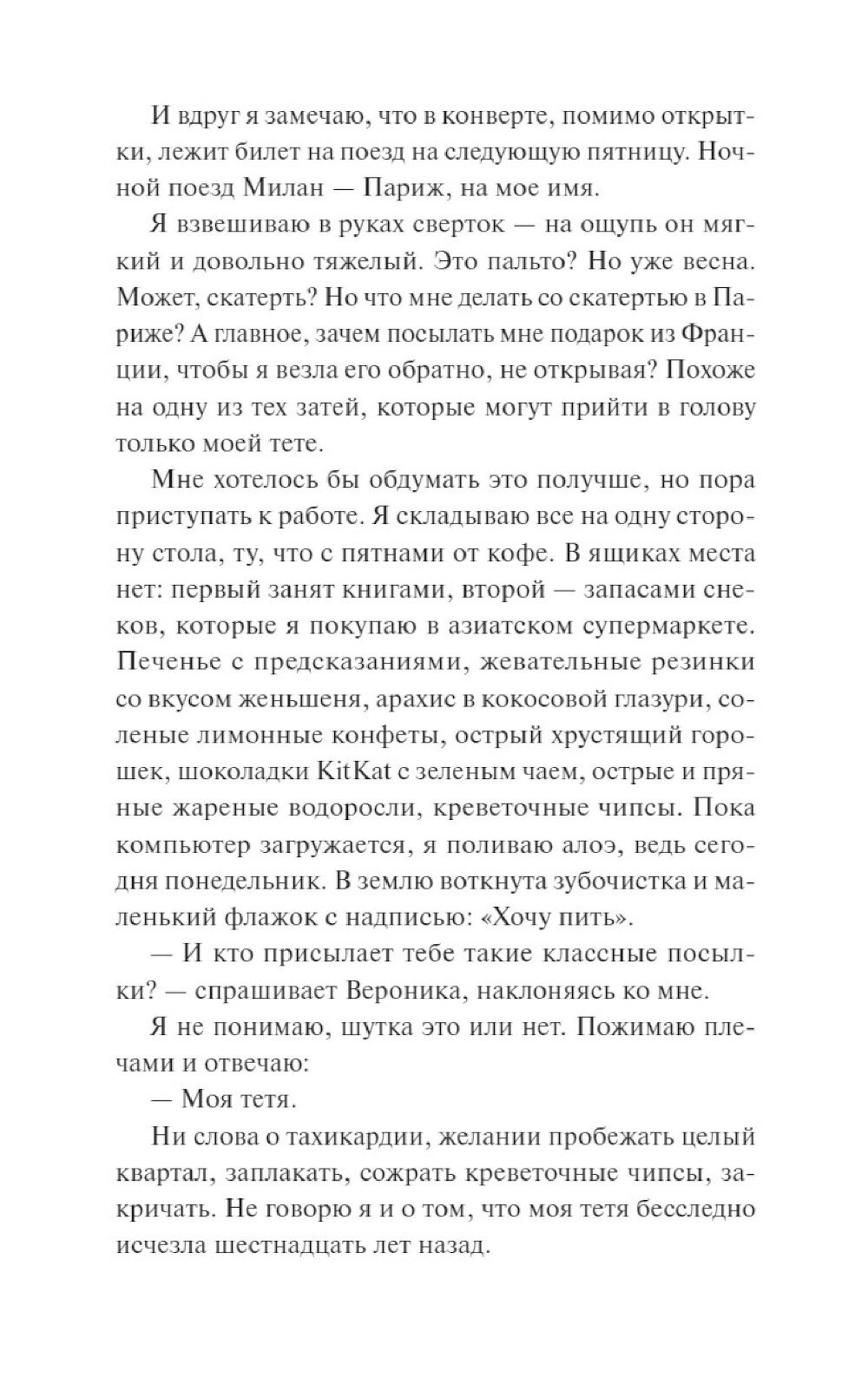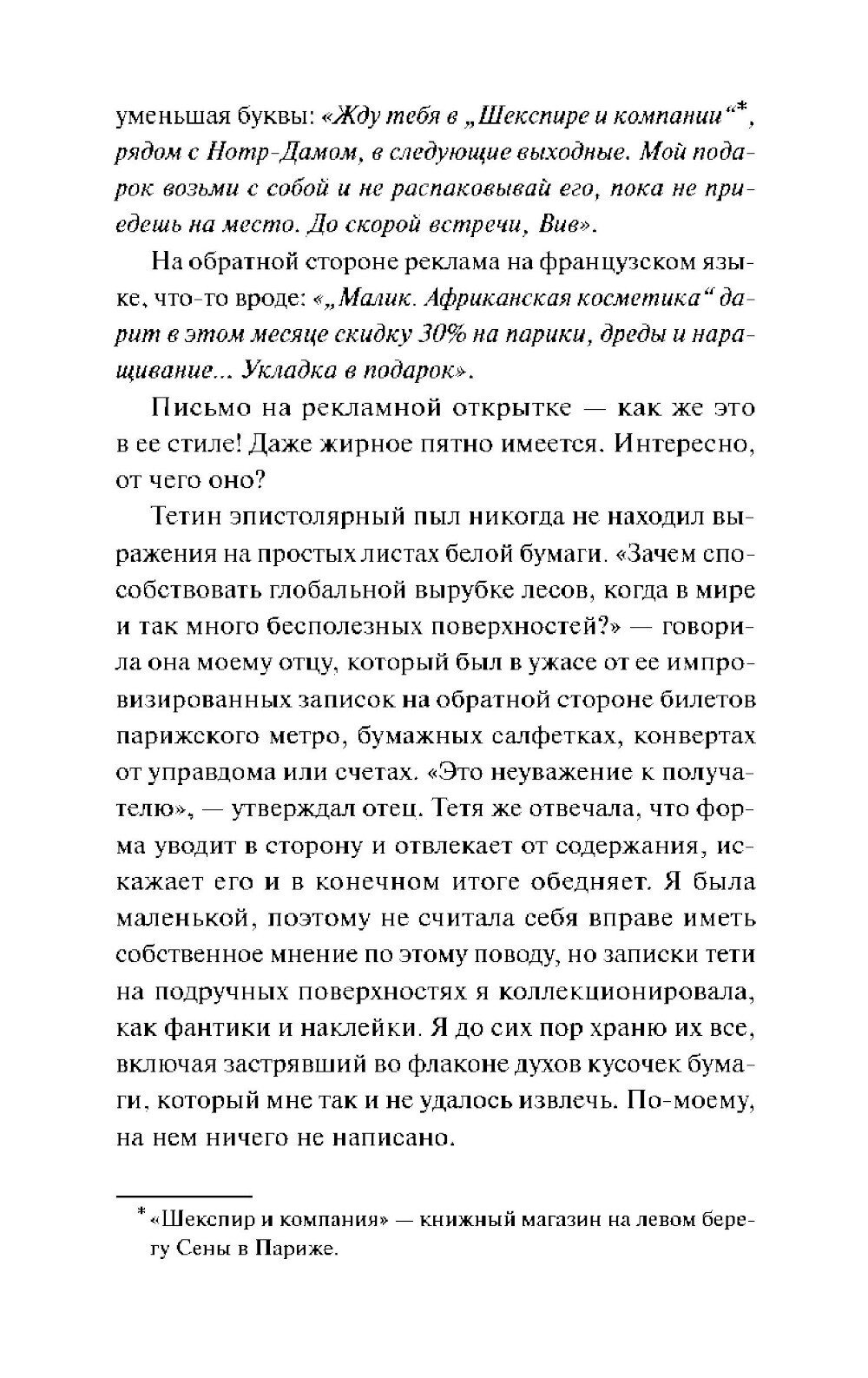Оливе тридцать, у нее нет стабильной работы и определенных планов на будущее. Она живет с родителями, а еще страдает бессонницей и временами чувствует непреодолимую пустоту. Все переворачивается с ног на голову, когда Олива неожиданно получает письмо от своей эксцентричной тети Вивьен, исчезнувшей шестнадцать лет назад, с приглашением в Париж. Так она оказывается в одном из старейших книжных на левом берегу Сены в компании местной богемы, вот только Вивьен не является на встречу... Скоро Оливе придется решить - продолжить ли поиски неуловимой тети или вернуться домой, но прежде всего - делать ли ей то, чего ожидают от нее другие, или последовать за собственной мечтой.| Издательство | Манн, Иванов и Фербер |