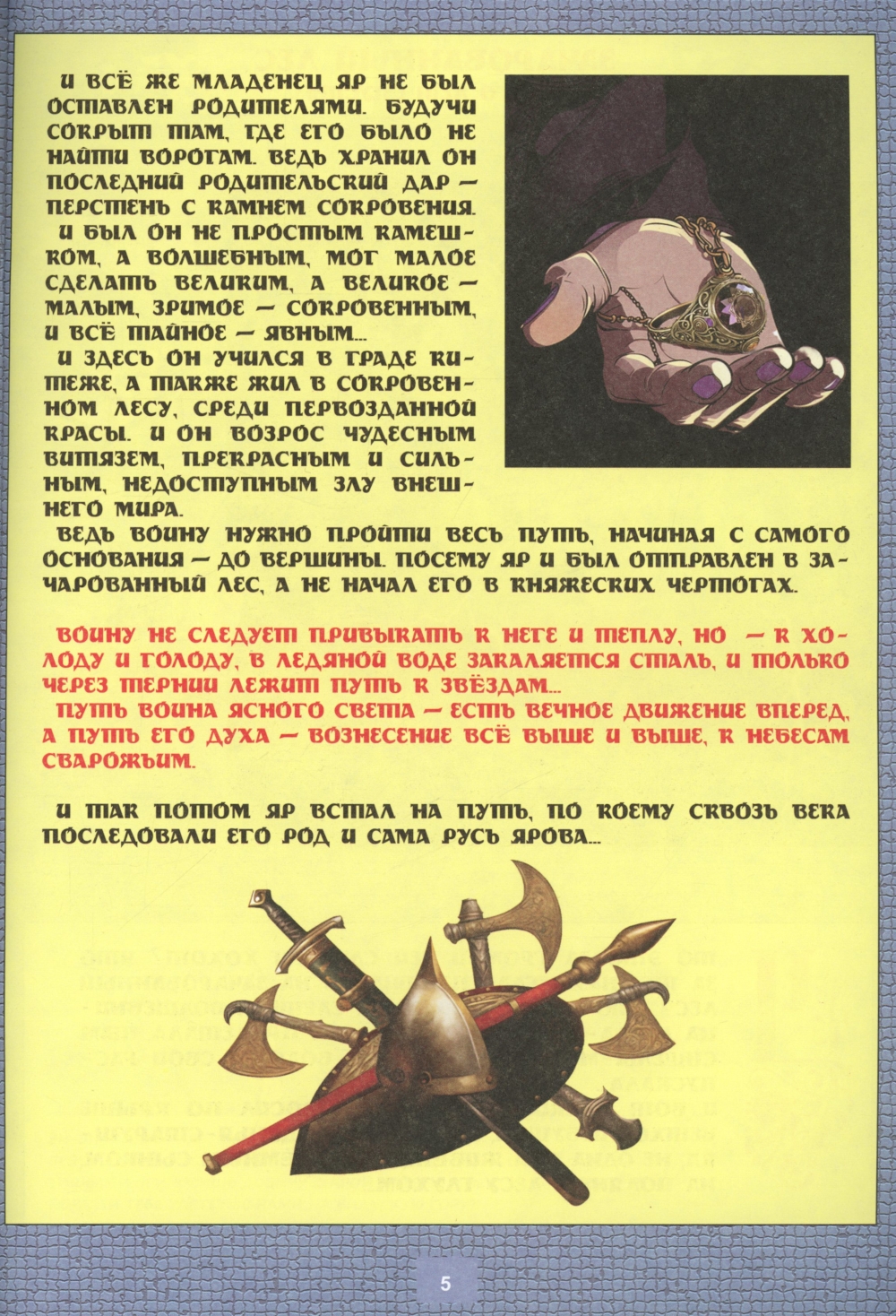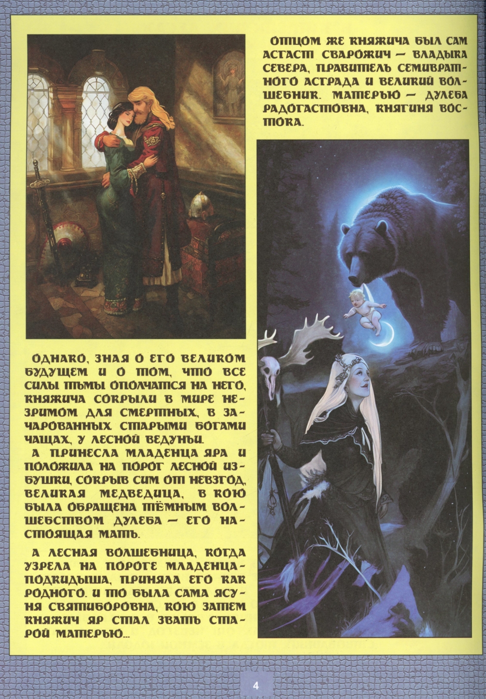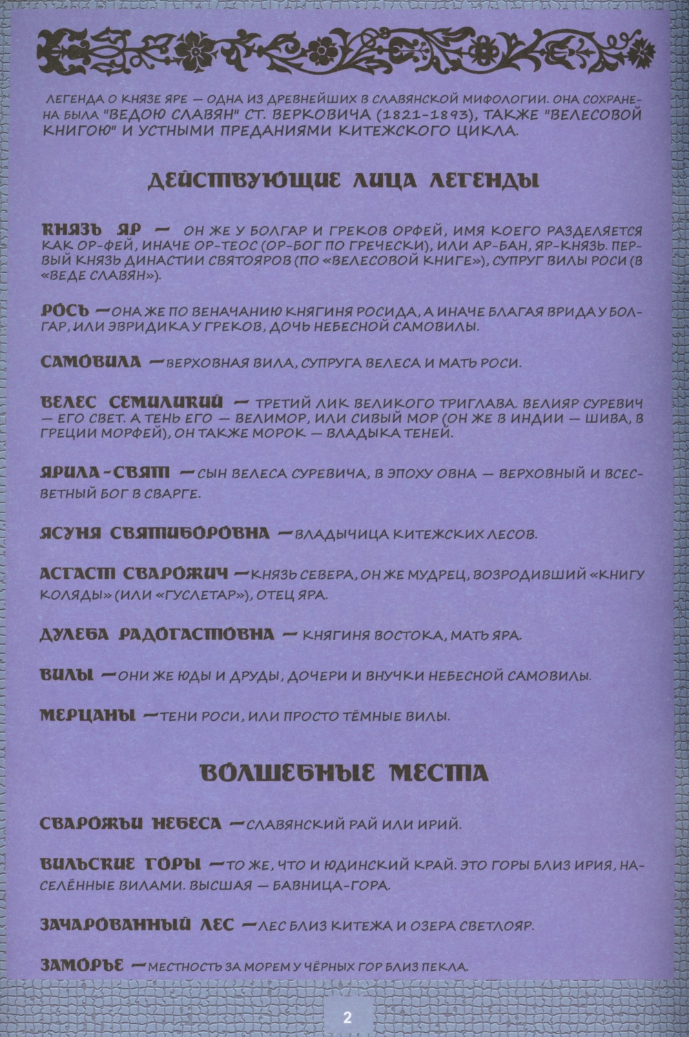 Предание о Первом князе Яре и о виле Роси, сохранённое южно-славянскою «Ведою славян» и «Велесовой книгою», повествует о родоначальнике древнейшей княжеской династии славян и русов. Это предание входит в цикл легенд о князе Яре (из «Сказаний славян о волхвах, князьях и родовичах» и др.). Также оно является продолжением мистерии о его отце Асгасте Сварожиче и о его супруге Дулебе Радогастовне («Сказание о Волшебнике из Асграда»). Данное лубочное издание является переложением-пересказом и отчасти переводом древней поэтической легенды, мистерии, которую ставили в древних театрах и на народных праздниках. И которая позволяет перенестись во времена, отстоящие от нас на многие тысячелетия, когда рождалась Русь Ярова.