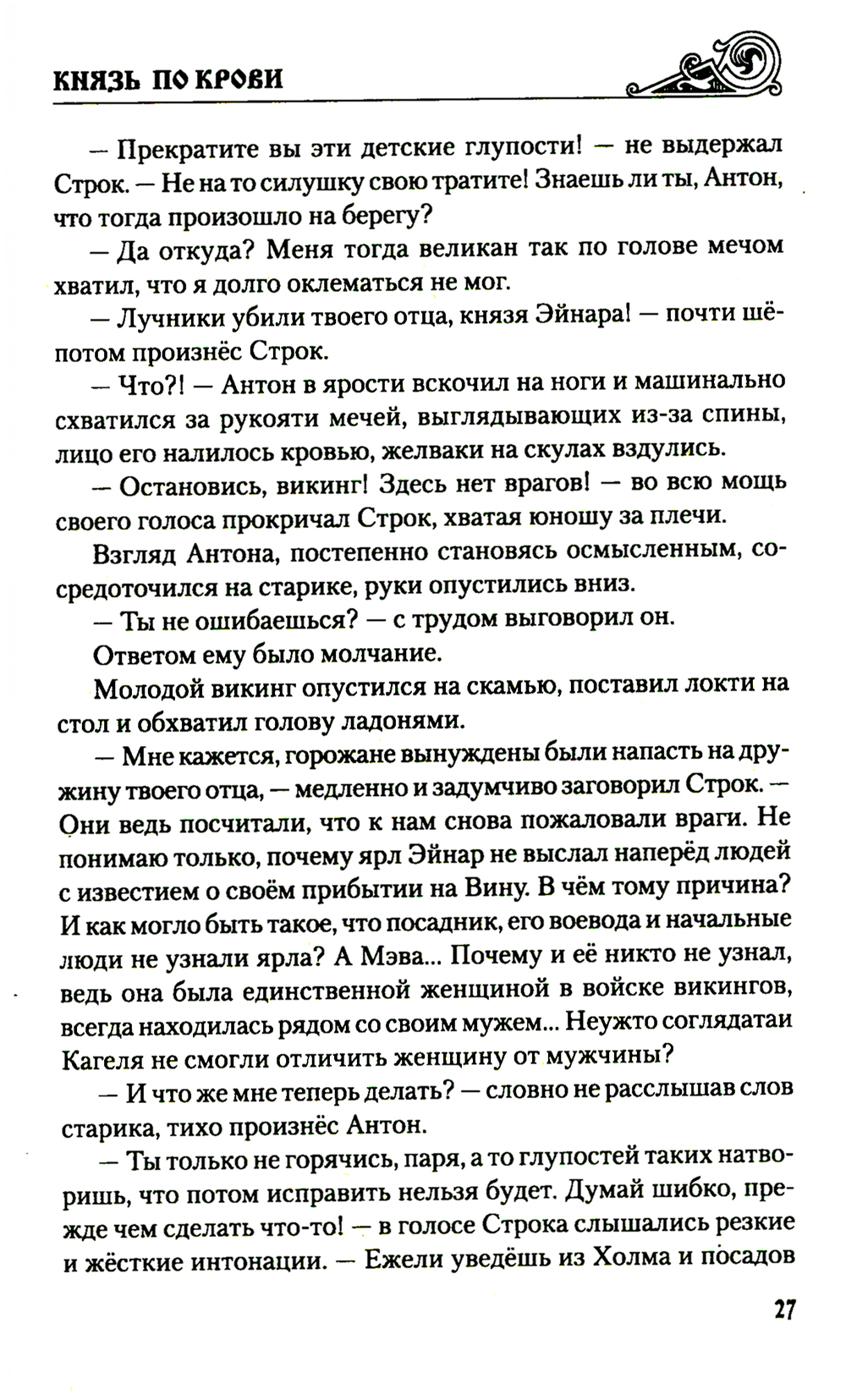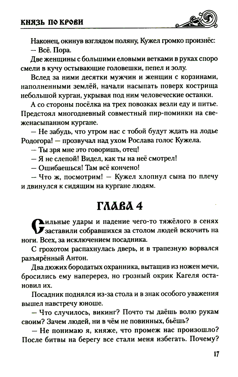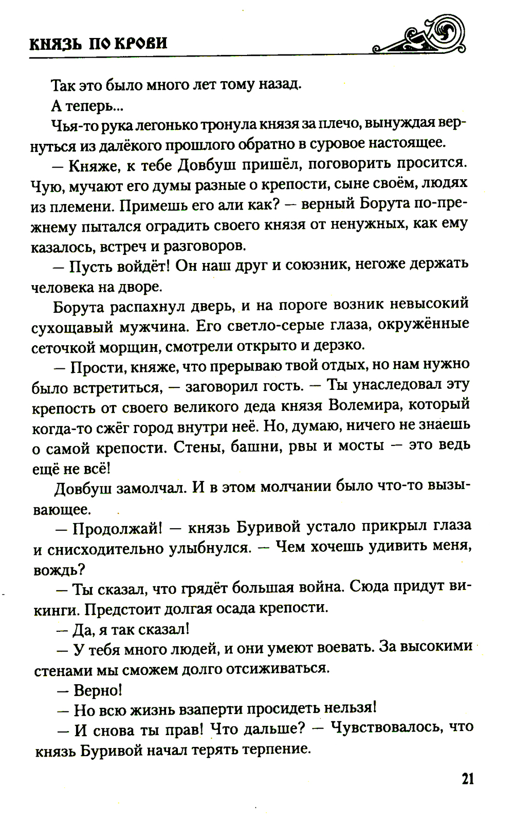 IX век. Между викингами и дружиной престарелого князя Буривоя возобновляется война за город Холм - отдалённый форпост древнего Новогорода. Буривой даже не догадывается, что викингов возглавляет его племянник, много лет назад пропавший в Варяжском море, а теперь носящий чужеземное имя Клепп. Князь терпит несколько поражений подряд, однако его сын - Гостомысл - во главе большой рати приходит на помощь отцу, окружает викингов на суше и начинает кровавую сечу. Остановить её может только смерть предводителей враждующих сторон, но захотят ли боги принять эту жертву и позволят ли наступить тишине и миру? «Князь по крови» - продолжение романов Арсения Втюрина «Первый среди равных» и «Путь воина», ранее опубликованных в серии «У истоков Руси» и входящих в цикл «Кто же ты, Рюрик?».