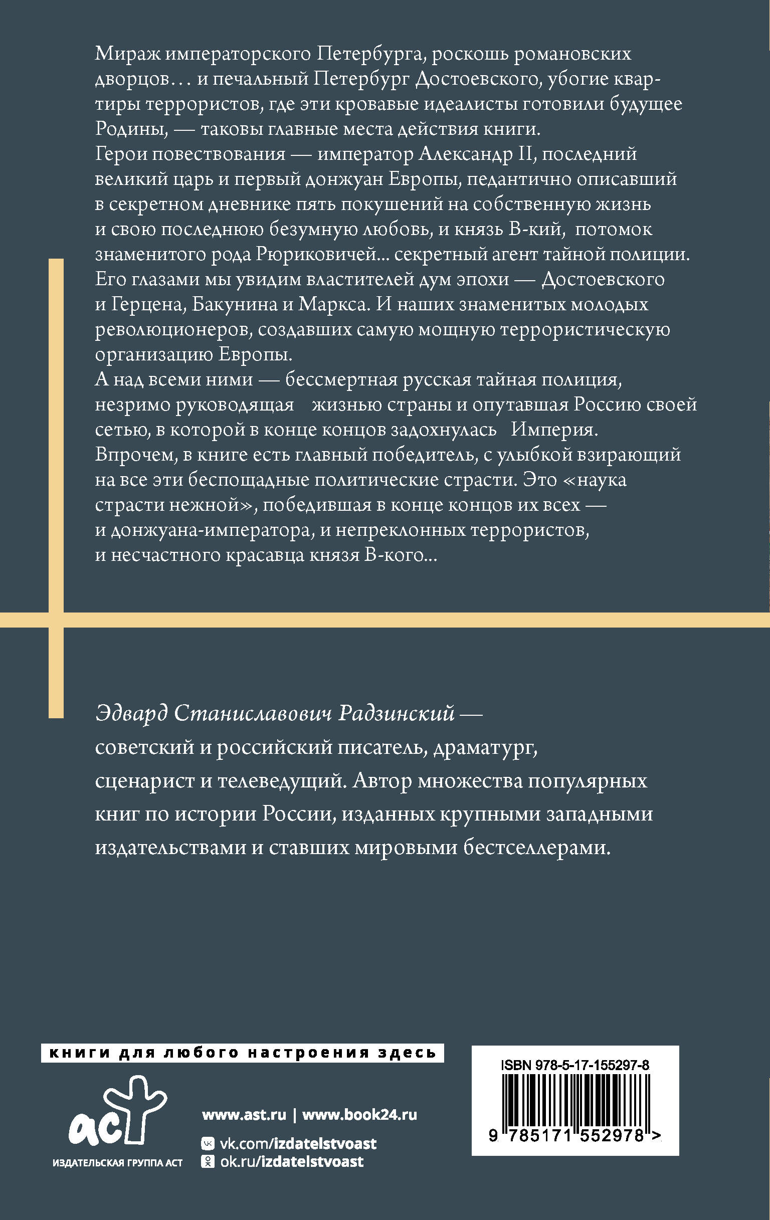 Мираж императорского Петербурга, роскошь романовских дворцов… и печальный Петербург Достоевского, убогие квартиры террористов, где эти кровавые идеалисты готовили будущее Родины, - таковы главные места действия книги. Герои повествования - император Александр II, последний великий царь и первый донжуан Европы, педантично описавший в секретном дневнике пять покушений на собственную жизнь и свою последнюю безумную любовь, и князь В-кий, потомок знаменитого рода Рюриковичей... секретный агент тайной полиции. Его глазами мы увидим властителей дум эпохи - Достоевского и Герцена, Бакунина и Маркса. И наших знаменитых молодых революционеров, создавших самую мощную террористическую организацию Европы. А над всеми ними - бессмертная русская тайная полиция, незримо руководящая жизнью страны и опутавшая Россию своей сетью, в которой в конце концов задохнулась Империя. Впрочем, в книге есть главный победитель, с улыбкой взирающий на все эти беспощадные политические страсти. Это "наука страсти нежной", победившая в конце концов их всех - и донжуана-императора, и непреклонных террористов, и несчастного красавца князя В-кого...| Издательство | Издательство "АСТ" |