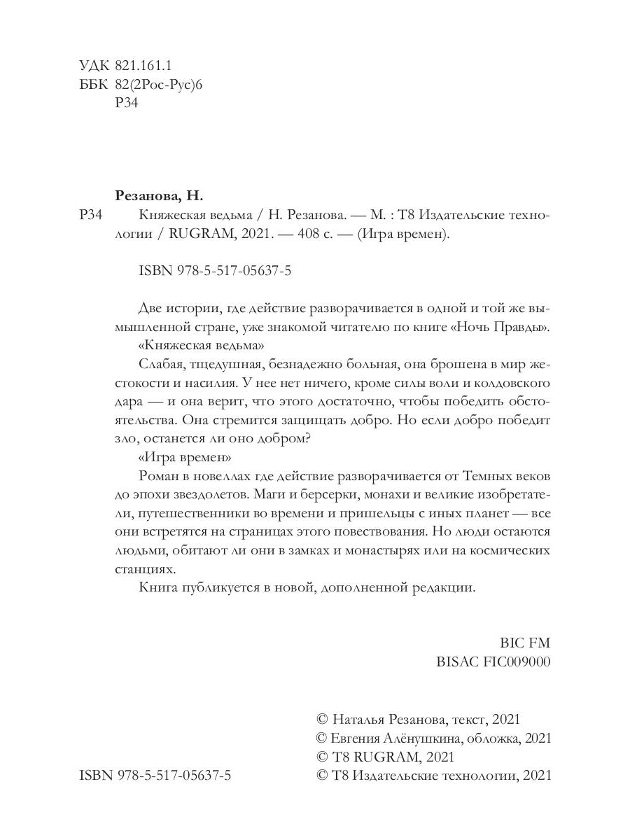 Две истории, где действие разворачивается в одной и той же вымышленной стране, уже знакомой читателю по книге «Ночь Правды». «Княжеская ведьма» Слабая, тщедушная, безнадежно больная, она брошена в мир жестокости и насилия. У нее нет ничего, кроме силы воли и колдовского дара - и она верит, что этого достаточно, чтобы победить обстоятельства. Она стремится защищать добро. Но если добро победит зло, останется ли оно добром? «Игра времен» Роман в новеллах где действие разворачивается от Темных веков до эпохи звездолетов. Маги и берсерки, монахи и великие изобретатели, путешественники во времени и пришельцы с иных планет - все они встретятся на страницах этого повествования. Но люди остаются людьми, обитают ли они в замках и монастырях или на космических станциях. Книга публикуется в новой, дополненной редакции.| Издательство | Т8 RUGRAM |