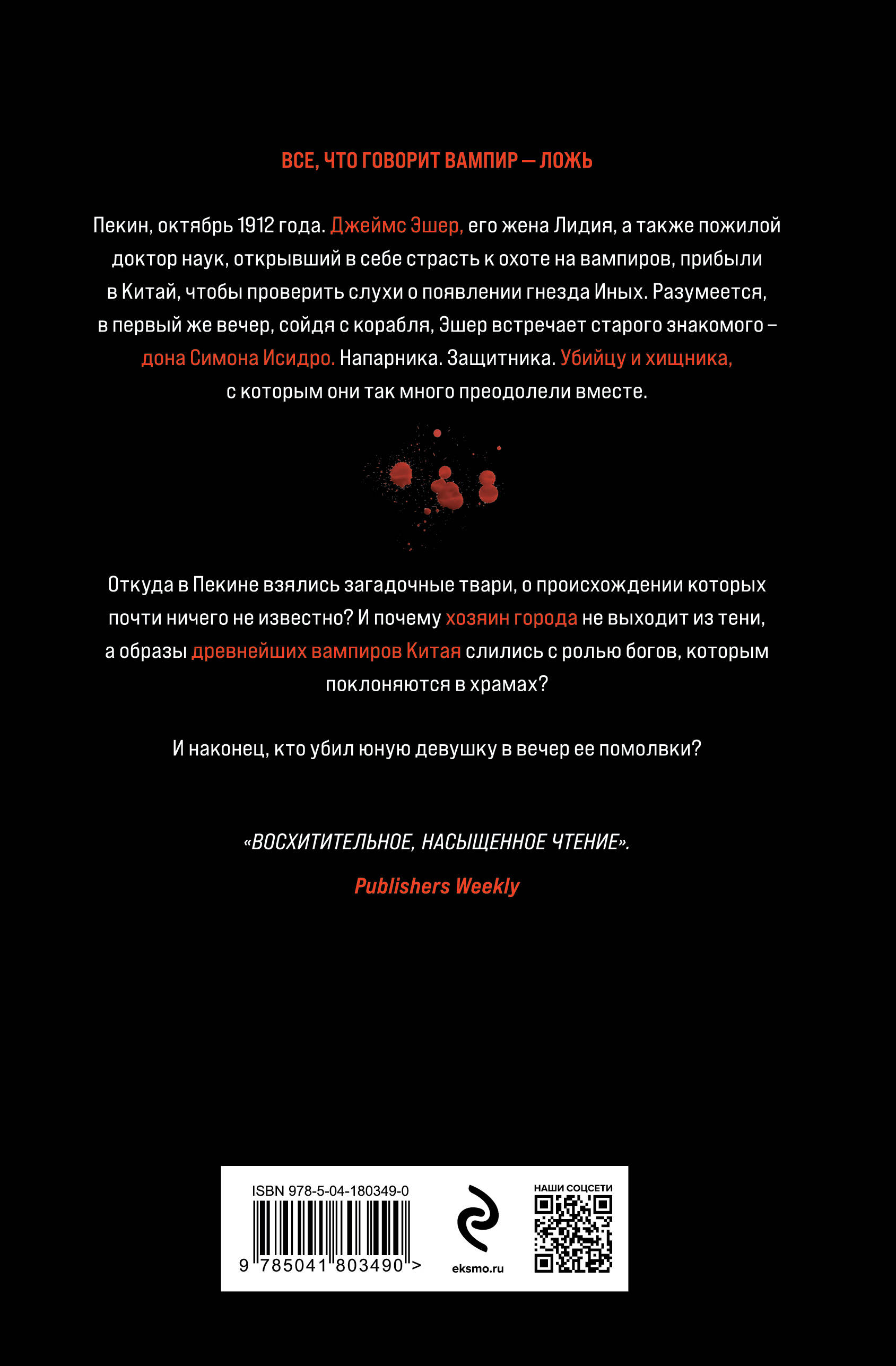 Пекин, октябрь 1912 года. Джеймс Эшер, его жена Лидия, а также пожилой доктор наук, открывший в себе страсть к охоте на вампиров, прибыли в Китай, чтобы проверить слухи о появлении гнезда Иных. Разумеется, в первый же вечер, сойдя с корабля, Эшер встречает старого знакомого ― дона Симона Исидро. Напарника. Защитника. Убийцу и хищника, с которым они так много преодолели вместе. Откуда в Пекине взялись загадочные твари, о происхождении которых почти ничего неизвестно? И почему хозяин города не выходит из тени, а образы древнейших вампиров Китая слились с ролью богов, которым поклоняются в храмах? И, наконец, кто убил юную девушку в вечер ее помолвки? Впервые на русском языке!| Издательство | ООО "Издательство "Эксмо" |