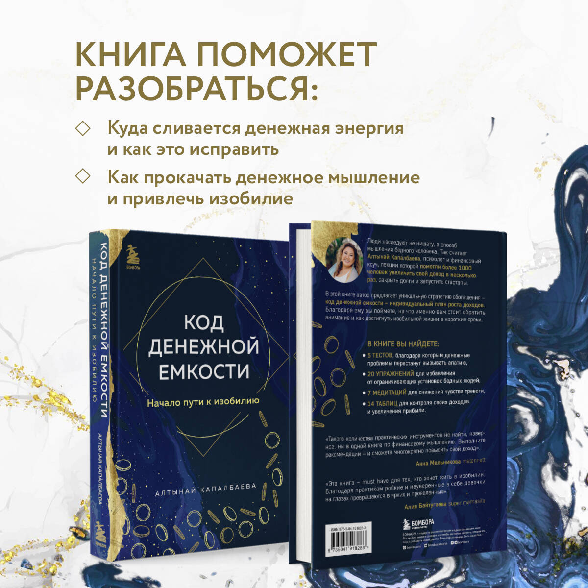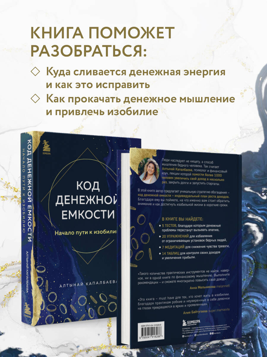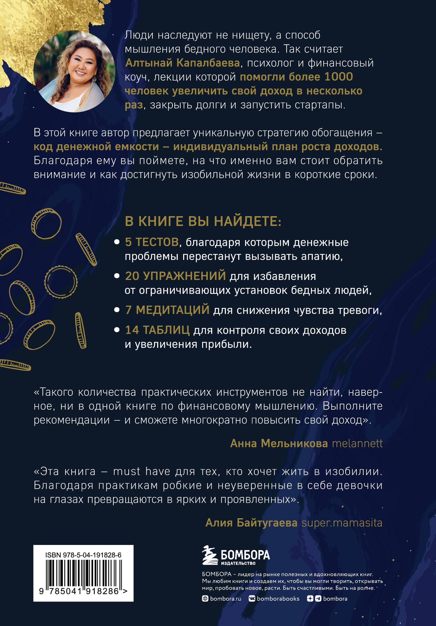 Люди наследуют не нищету, а способ мышления бедного человека. Так считает Алтынай Капалбаева, психолог и финансовый коуч, лекции которой помогли более 1000 человек увеличить свой доход в несколько раз, закрыть долги и запустить стартапы. В этой книге автор предлагает уникальную стратегию обогащения - код денежной емкости - индивидуальный план роста доходов. Благодаря ему вы поймете, куда именно вам стоит инвестировать деньги и как достигнуть изобильной жизни в короткие сроки. В книге вы найдете: - 5 тестов, благодаря которым денежные проблемы перестанут вызывать апатию, - 20 упражнений для избавления от ограничивающих установок бедных людей, - 7 медитаций для снижения чувства тревоги, - 14 таблиц для контроля своих доходов и увеличения прибыли. «Такого количества практических инструментов не найти, наверное, ни в одной книге по финансовому мышлению. Выполните рекомендации - и сможете многократно повысить свой доход». Анна Мельникова melannett «Эта книга - must have для тех, кто хочет жить в изобилии. Благодаря практикам робкие и неуверенные в себе девочки на глазах превращаются в ярких и проявленных». Алия Байтугаева super.mamasita