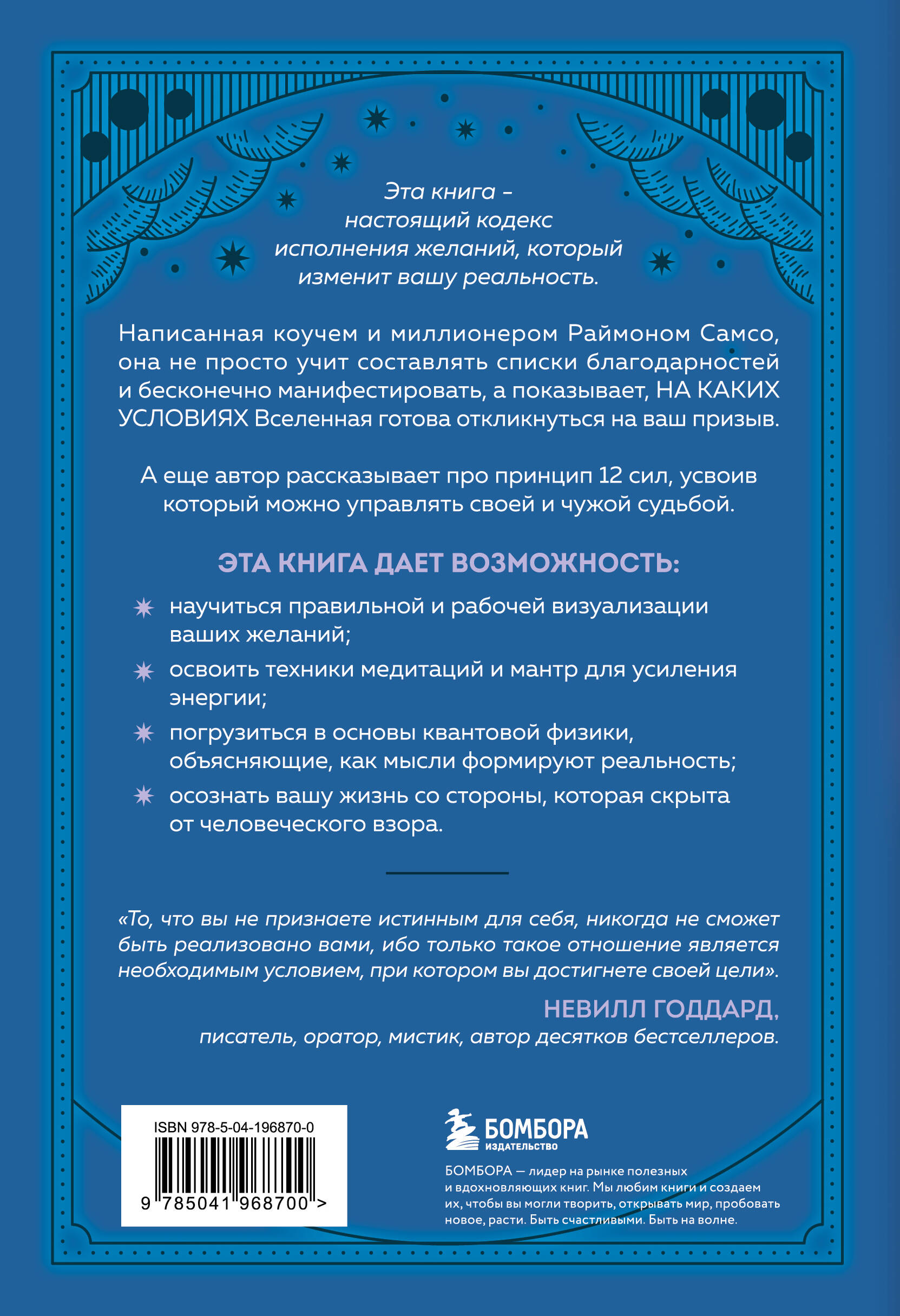 Эта книга - настоящий кодекс исполнения желаний, который изменит вашу реальность. Написанная коучем и миллионером Раймоном Самсо, она не просто учит составлять списки благодарностей и бесконечно манифестировать, а показывает, НА КАКИХ УСЛОВИЯХ Вселенная готова откликнуться на ваш призыв. А еще автор рассказывает про принцип Двенадцати сил, усвоив который, можно управлять своей и чужой судьбой. Эта книга дает возможность: - научиться правильно формулировать и визуализировать свои желания; - освоить техники медитаций и мантр для усиления энергии; - погрузиться в основы квантовой физики, объясняющие, как мысли формируют реальность; - осознать вашу жизнь со стороны, скрытой от человеческого взора. «То, что вы не признаете истинным для себя, никогда не сможет быть реализовано вами, ибо только такое отношение является необходимым условием, при котором вы достигнете своей цели». - Невилл Годдард, писатель, оратор, мистик, автор десятков бестселлеров| Издательство | ООО "Издательство "Эксмо" |