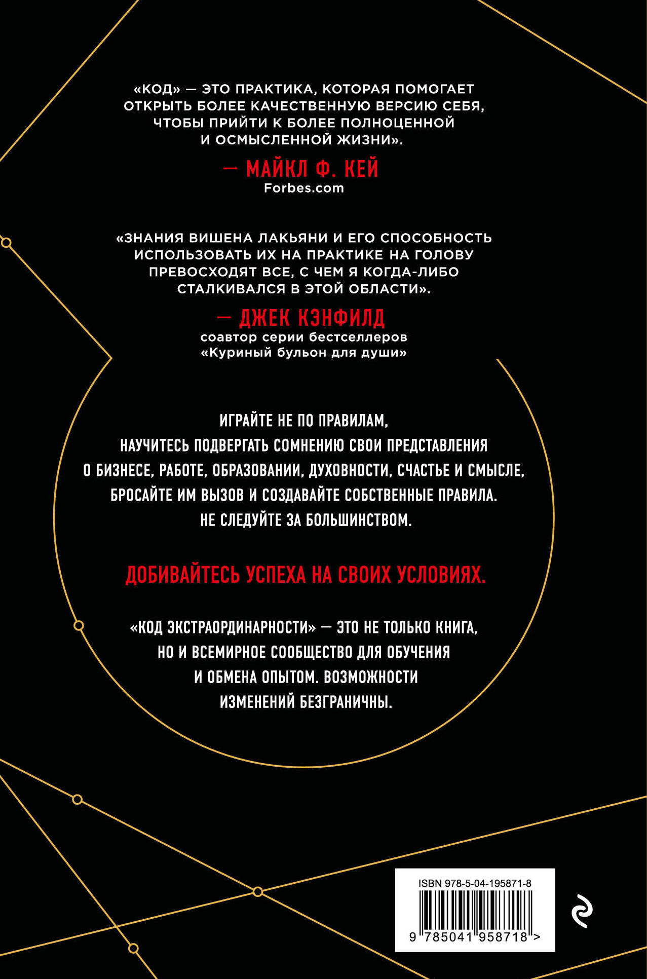 Эта книга поможет заново взглянуть на свою жизнь. Она станет картой, которая поведет читателя от счастья и здоровья к смыслу и силе, и раскроет в нем все самые лучшие, самые выдающиеся качества. Интригующая история автора перемежается с техниками, которые ведут вас к новым вершинам успеха. Автор - Вишен Лакьяни, создатель компании MindValley, которая входят в топ мировых компаний мира, меняющих стандартное представление об офисной работе. В 2018 году книга стала финалистом премии «Деловая книга года в России». «Знания Вишена Лакьяни и его способность использовать их на практике - на голову превосходит все, с чем я когда-либо сталкивался в этой области». - Джэк Кенфилд, соавтор серии бестселлеров «Куриный бульон для души». «Код - это практика, которая помогает открыть более качественную версию себя, чтобы прийти к более полноценной и осмысленной жизни». - Майкл Ф. Кей, Forbes.com| Издательство | ООО "Издательство "Эксмо" |