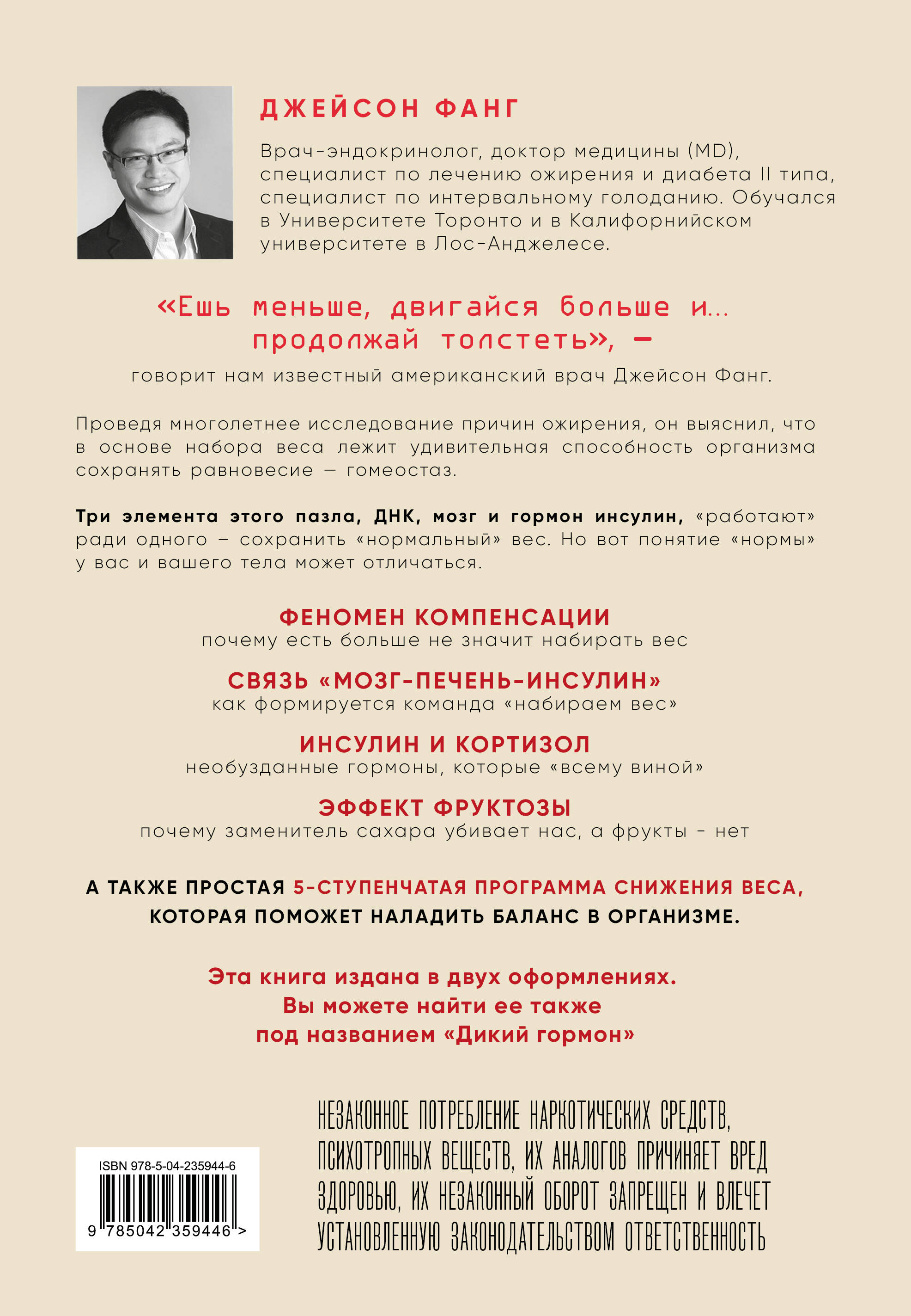 НЕЗАКОННОЕ ПОТРЕБЛЕНИЕ НАРКОТИЧЕСКИХ СРЕДСТВ, ПСИХОТРОПНЫХ ВЕЩЕСТВ, ИХ АНАЛОГОВ ПРИЧИНЯЕТ ВРЕД ЗДОРОВЬЮ, ИХ НЕЗАКОННЫЙ ОБОРОТ ЗАПРЕЩЕН И ВЛЕЧЕТ УСТАНОВЛЕННУЮ ЗАКОНОДАТЕЛЬСТВОМ ОТВЕТСТВЕННОСТЬ. Почему люди толстеют? Привычная парадигма заключается в предположении, что мы много едим и мало двигаемся, отсюда и результат. А ну-ка попробуйте больше двигаться и меньше есть! Получилось похудеть? Конечно, нет. Особенно, когда речь идет об абдоминальном ожирении (жирок на животе и внутренних органах). Тут и на диету садятся, и голодают, а результат держится только в момент самоистязания. Доктор-нефролог, всемирно известный специалист по лечению ожирения и диабета доктор Фанг на основании 30-летних исследований доказывает нам, что причина лишнего веса кроется не в личной неспособности сдерживать себя. Главный виновник лишнего веса - гормон инсулин. Именно его деятельность дает мозгу неправильно заданное значение веса. Проще говоря, мозг считает нормой завышенный вес тела, а потому оберегает его от любых посягательств со стороны. Потому и диеты не работают в долгосрочной перспективе! Данная книга продается также в другом оформление под названием «Дикий гормон». - Как же убедить мозг снизить заданное значение веса? - Как договориться со своей гормоналкой? - И почему так опасна фруктоза? Революционная книга, многолетний бестселлер во всем мире, дает ответы на эти и другие вопросы. Но главное - она помогает снизить свой вес до реальной нормы и убедить мозг дать команду организму похудеть.| Издательство | ООО "Издательство "Эксмо" |
