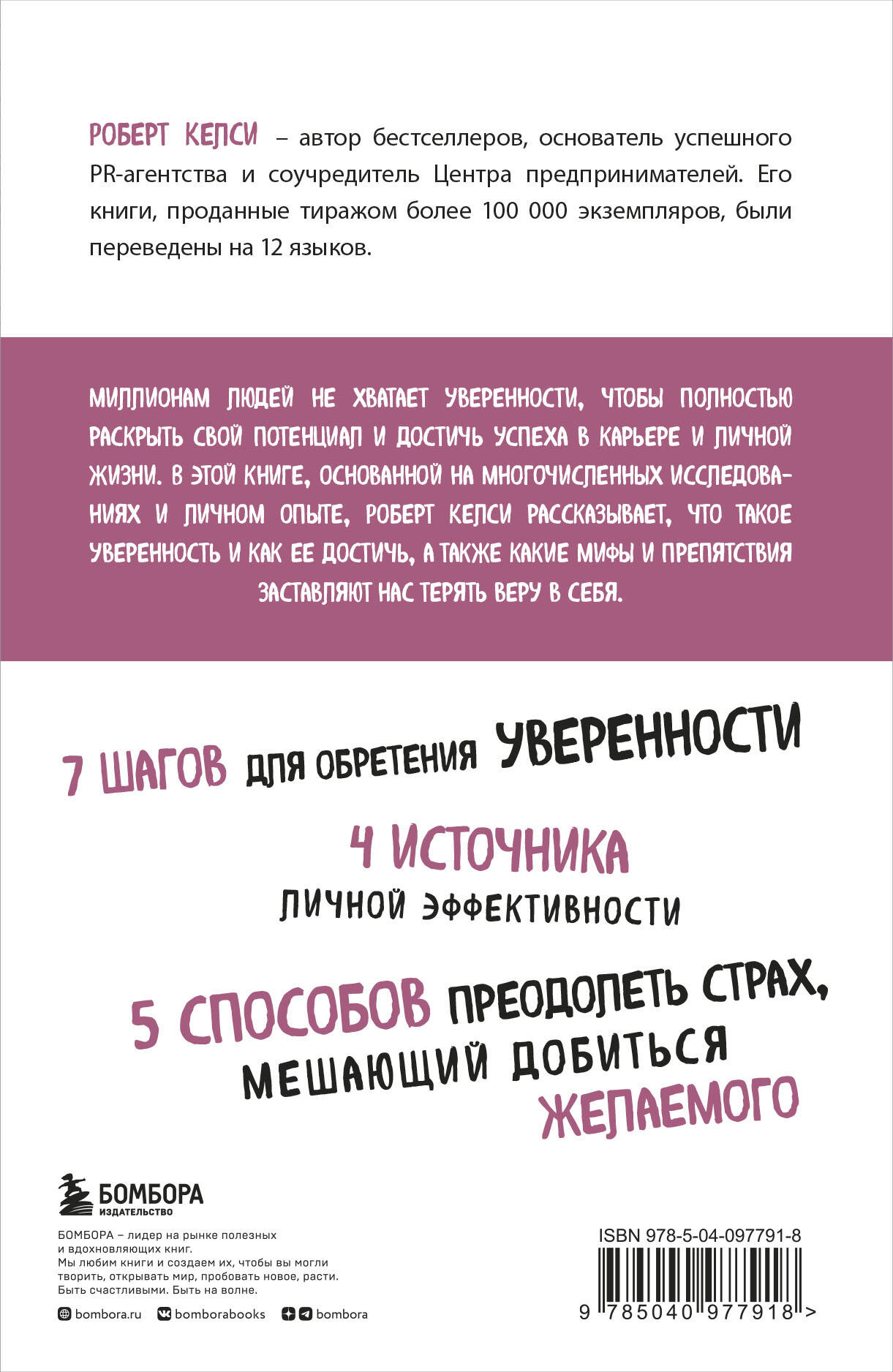 В книге: - 4 источника личной эффективности; - 5 способов преодолеть страх, мешающий добиться желаемого; - 7 шагов для обретения уверенности. Отзывы: «Наконец-то: книга о том, как обрести уверенность, написана человеком, который сам боролся с неуверенностью. Личный опыт Роберта Келси помог ему добраться до сути основных правил, позволяющих обрести уверенность в себе». - Роман Крознарик, автор книги How to Find Fulfilling Work и соучредитель «Школы жизни» «Это вам не банальное "средство от всех болезней", способное помочь лишь тому, кто его продает, - с помощью Келси вы действительно добьетесь значительных перемен». - Оливер Джеймс, автор книги They F*** You Up! «Замечательная книга! Она так сильно добавляет уверенности, что даже не хотел после нее писать отзыв. Началась мания величия=))) Эта книга поднимает уровень уверенности в два раза. Так что будьте осторожны». - Ицхак Пинтосевич, автора бестселлера «Действуй! 10 заповедей успеха»| Издательство | ООО "Издательство "Эксмо" |
