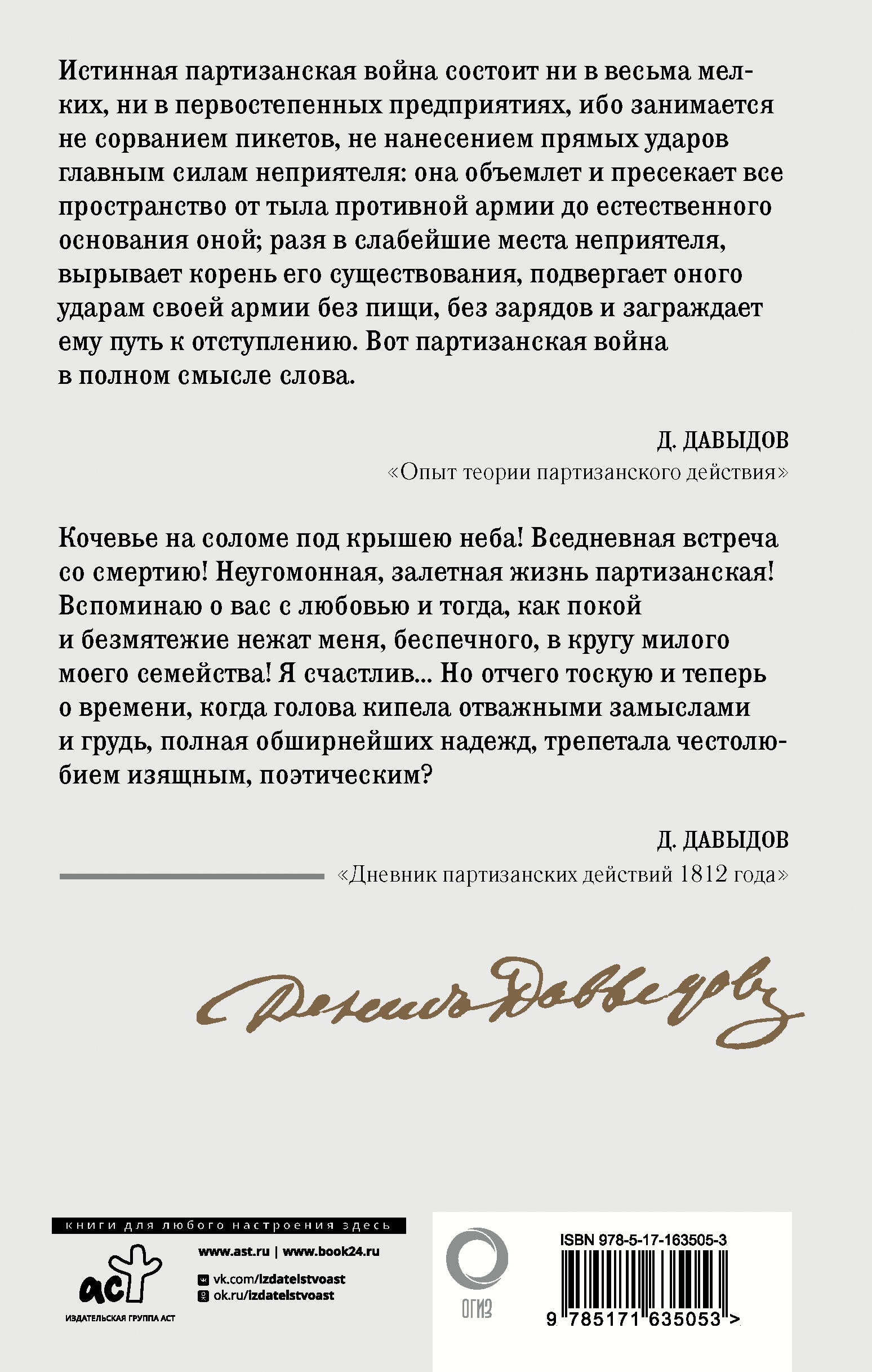 Денис Давыдов - генерал-лейтенант, герой Отечественной войны 1812 года, а также легендарный поэт и мемуарист, - был одним из инициаторов и руководителей партизанского движения. Воспоминания, записки, очерки и статьи Давыдова, вошедшие в книгу, являются важным источником по истории Наполеоновских войн и памятником русской литературы 20-30 гг. XIX века. В книге опубликован также главный труд Дениса Давыдова "Опыт теории партизанского действия", в котором он оставил теоретическую разработку организации партизанского движения в тылу врага. В качестве иллюстраций в издании использовались гравюры из книг XIX века, посвященных Отечественной войне 1812 года.| Издательство | Издательство "АСТ" |