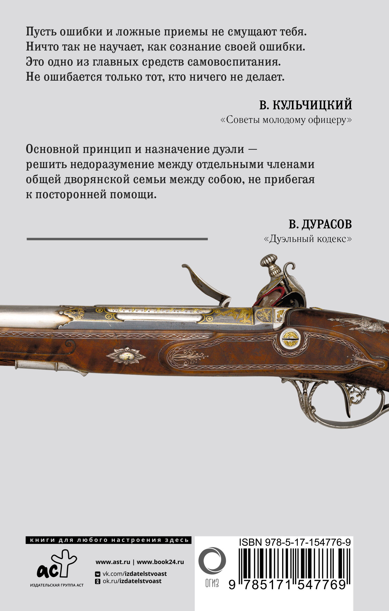 В русской армии офицерское звание всегда определяло принадлежность не к социальной группе, но к касте, которая жила по своим неписаным законам - по кодексу чести. В том случае, если уложения армейских уставов вступали в конфликт с положениями кодекса, выбор офицера был очевиден - в пользу кодекса чести. Офицерский суд чести был авторитетней военного трибунала, "ибо лучше быть сосланным, разжалованным, чем утратить достоинство". Во время Русско-японской войны ротмистр Валентин Кульчицкий написал "Советы молодому офицеру", которые обобщили выработанный годами свод правил, он и стал "Кодексом чести русского офицера". Продолжением офицерского кодекса был "Дуэльный кодекс" Василия Дурасова. С той разницей, что он определял правила дуэлей (поединков чести) как для военных чинов, так и для штатских.| Издательство | ИЗДАТЕЛЬСТВО "АСТ" |