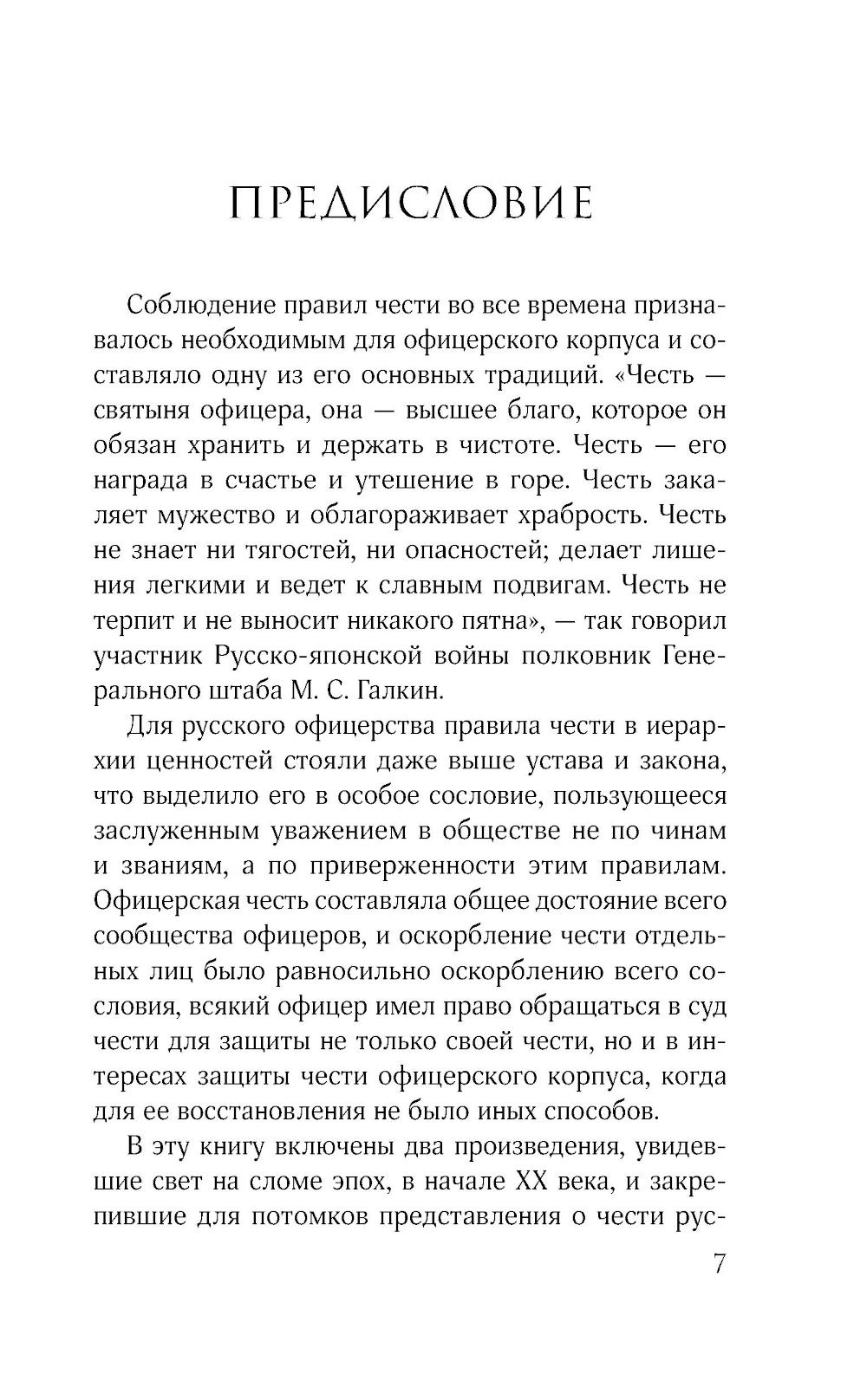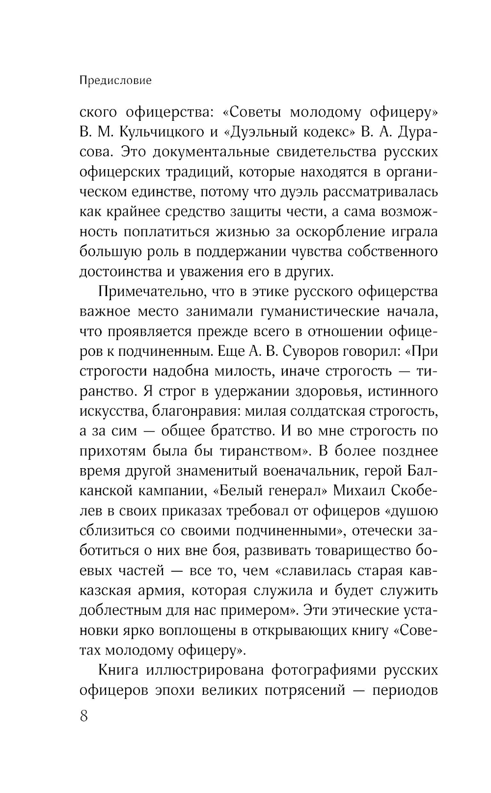 Для русского офицерства правила чести в иерархии ценностей стояли выше устава и закона, что выделило его в особое сословие, пользующееся заслуженным уважением в обществе не по чинам и званиям, а по приверженности этим правилам. В книгу включены «Советы молодому офицеру» В.М. Кульчицкого и «Дуэльный кодекс» В.А. Дурасова, известные под общим названием «Кодекс чести русского офицера» и закрепившие для потомков представления о чести русского офицерства, где дуэль рассматривалась как крайнее средство защиты чести, а возможность поплатиться жизнью за оскорбление играла большую роль в поддержании чувства собственного достоинства и уважения его в других. Книга будет хорошим подарком военнослужащему и любому, кто интересуется историей Отечества.