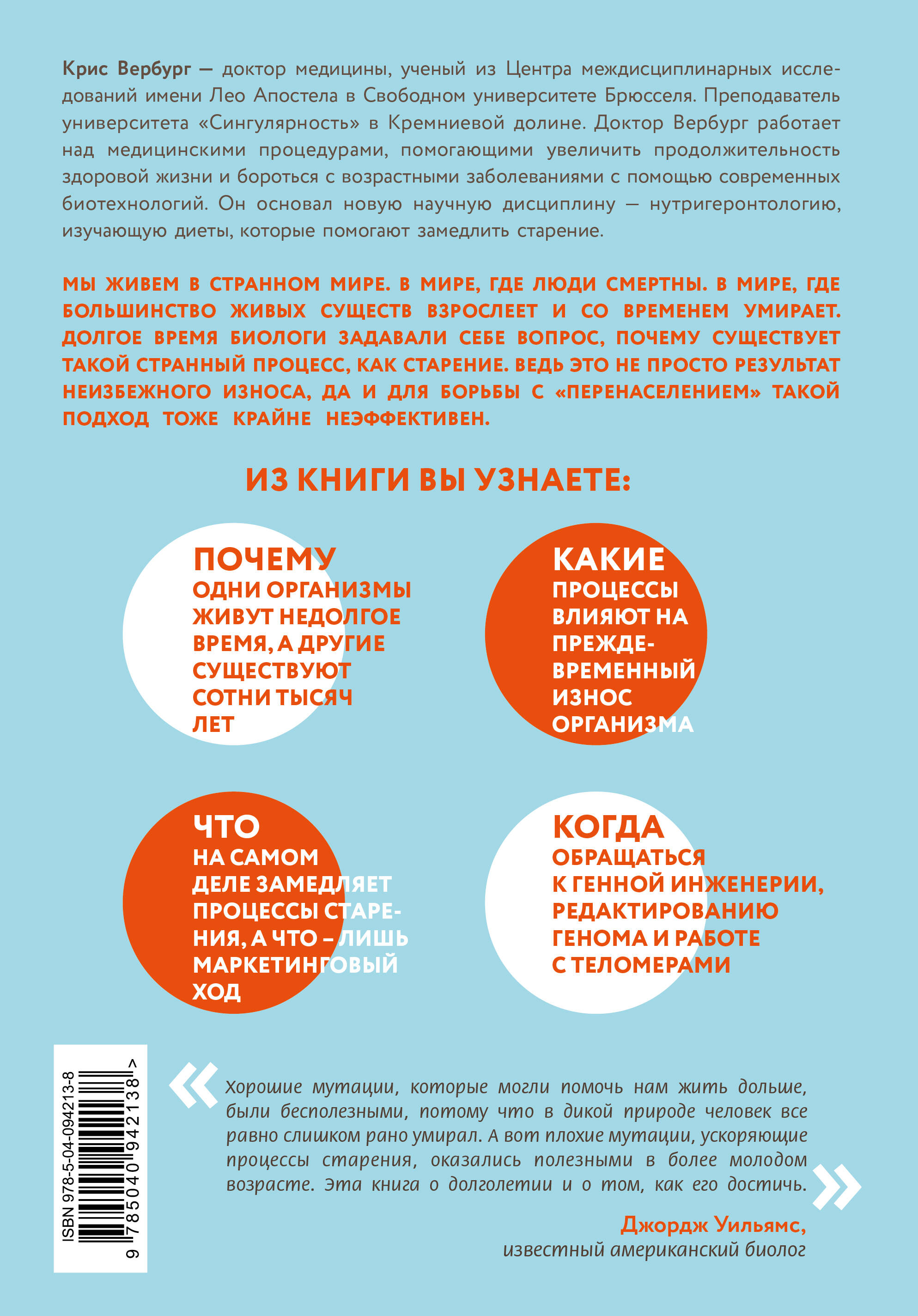 Почему некоторые виды животных почти не стареют, в то время как другие стареют и умирают очень быстро? Как действуют механизмы, которые медленно, но верно вызывают старение нашего организма, делая нас восприимчивыми к сердечному приступу, инсульту, раку, пневмонии и слабоумию. Доктор Вербург рассказывает, что можно сделать, чтобы замедлить процессы старения. Он представляет и оценивает широкий спектр передовых разработок в области антивозрастных технологий, которые когда-то были только научной фантастикой, а сегодня стали реальностью: - новые типы вакцин; - использование митохондриальной ДНК; - редактирование гена с помощью белков CRISPR; - использование стволовых клеток и многого другого.| Издательство | ООО "Издательство "Эксмо" |