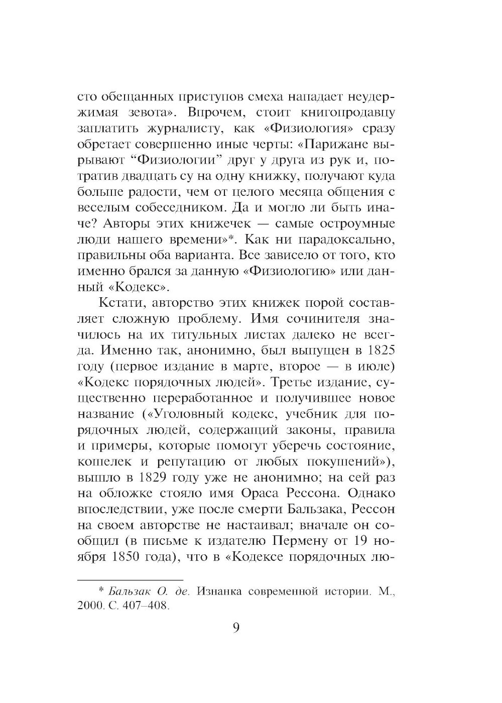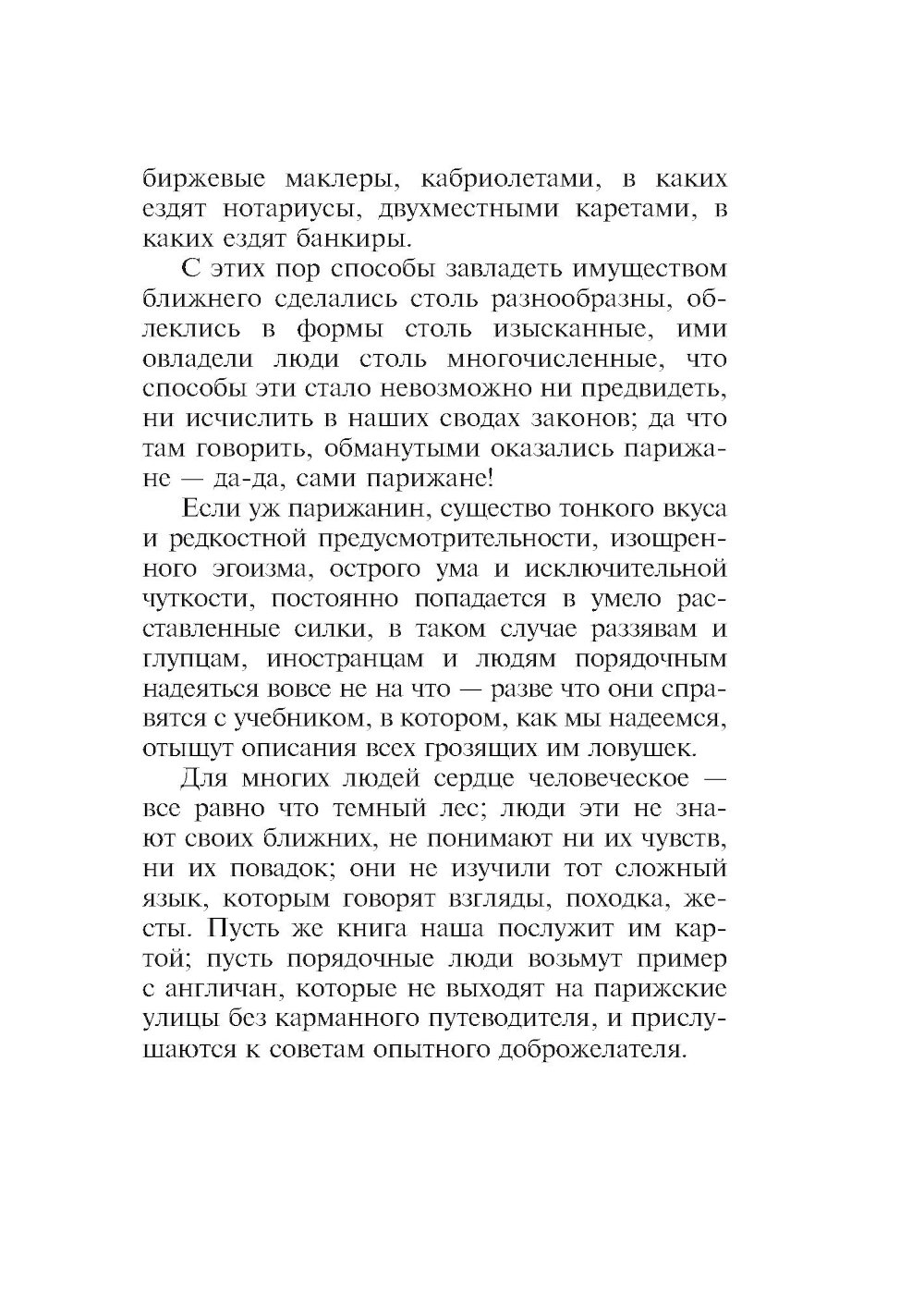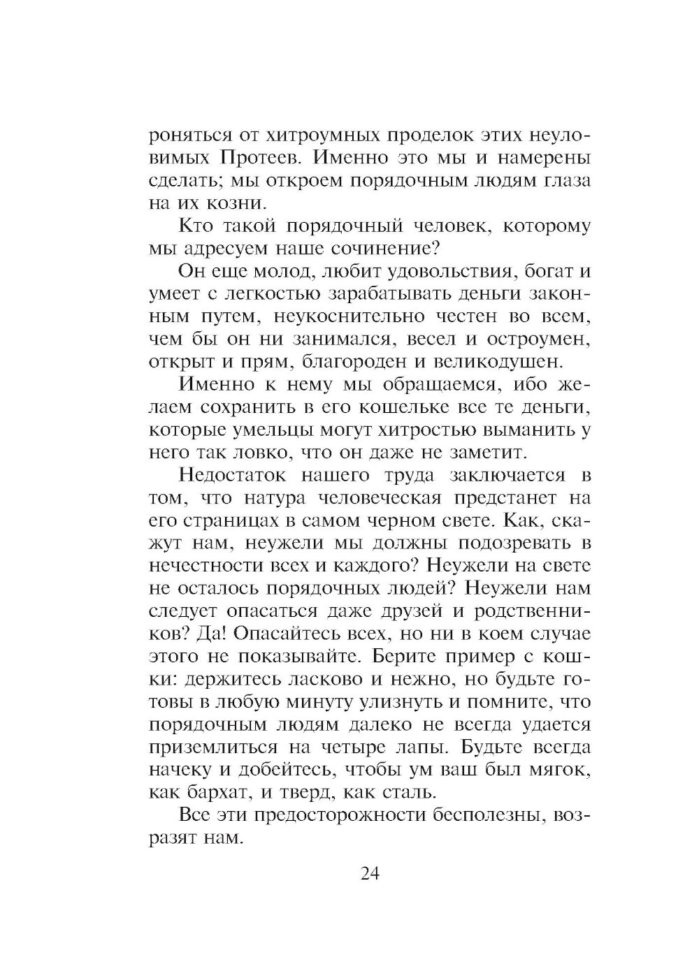 Переиздание знаменитого иронического трактата о том, как не попасться на удочку мошенникам. Великого романиста Оноре де Бальзака (1799-1850) называют еще и первым французским социологом, его «Кодекс порядочных людей...» - умные и смешные картинки нравов, написанные с блеском и остроумием. Многие из рекомендаций, которые автор дает читателям, жившим два века назад, остаются в силе и поныне, поскольку мы и сегодня так же доверчивы, а мошенники по-прежнему изворотливы и изобретательны. Прежде чем начать выставлять на титульном листе свое имя, Оноре де Бальзак (1799-1850) опубликовал немало сочинений под псевдонимами или вовсе без подписи. Последующие произведения автора «Человеческой комедии» заслонили его раннюю прозу, а между тем многие особенности позднейшей манеры писателя присутствуют уже в этих сочинениях. Таков «Кодекс порядочных людей» (1825). «Все дело в том, что на свете есть великое множество дураков, и добрая половина вещей в подлунном мире производится в расчете на них. Но вы-то ведь не дурак; иначе вы бы не читали эту книгу...» «...Кто такой порядочный человек, которому мы адресуем наше сочинение? Он еще молод, любит удовольствия, богат и умеет с легкостью зарабатывать деньги законным путем, неукоснительно честен во всем, чем бы он ни занимался, весел и остроумен, открыт и прям, благороден и великодушен. Именно к нему мы обращаемся, ибо желаем сохранить в его кошельке все те деньги, которые умельцы могут хитростью выманить у него так ловко, что он даже не заметит...» «...Берите пример с кошки: держитесь ласково и нежно, но будьте готовы в любую минуту улизнуть и помните, что порядочным людям далеко не всегда удается приземлиться на четыре лапы...» (Бальзак «Кодекс порядочных людей...») На русский язык книга впервые переведена Верой Мильчиной, а также дополнена вступительной статьей и примечаниями.| Издательство | Текст |