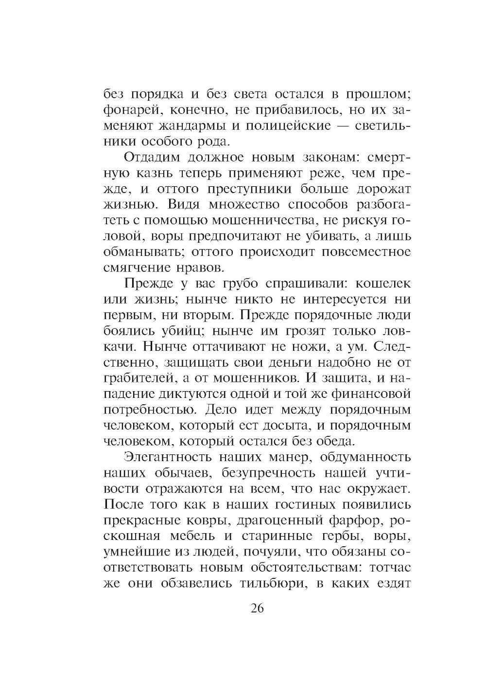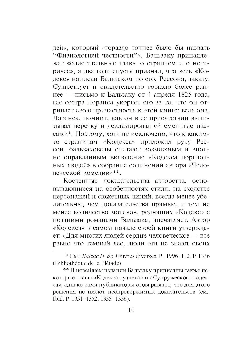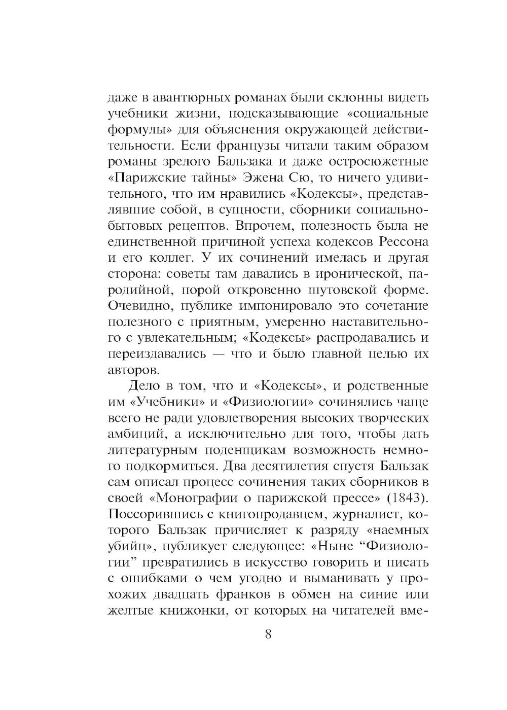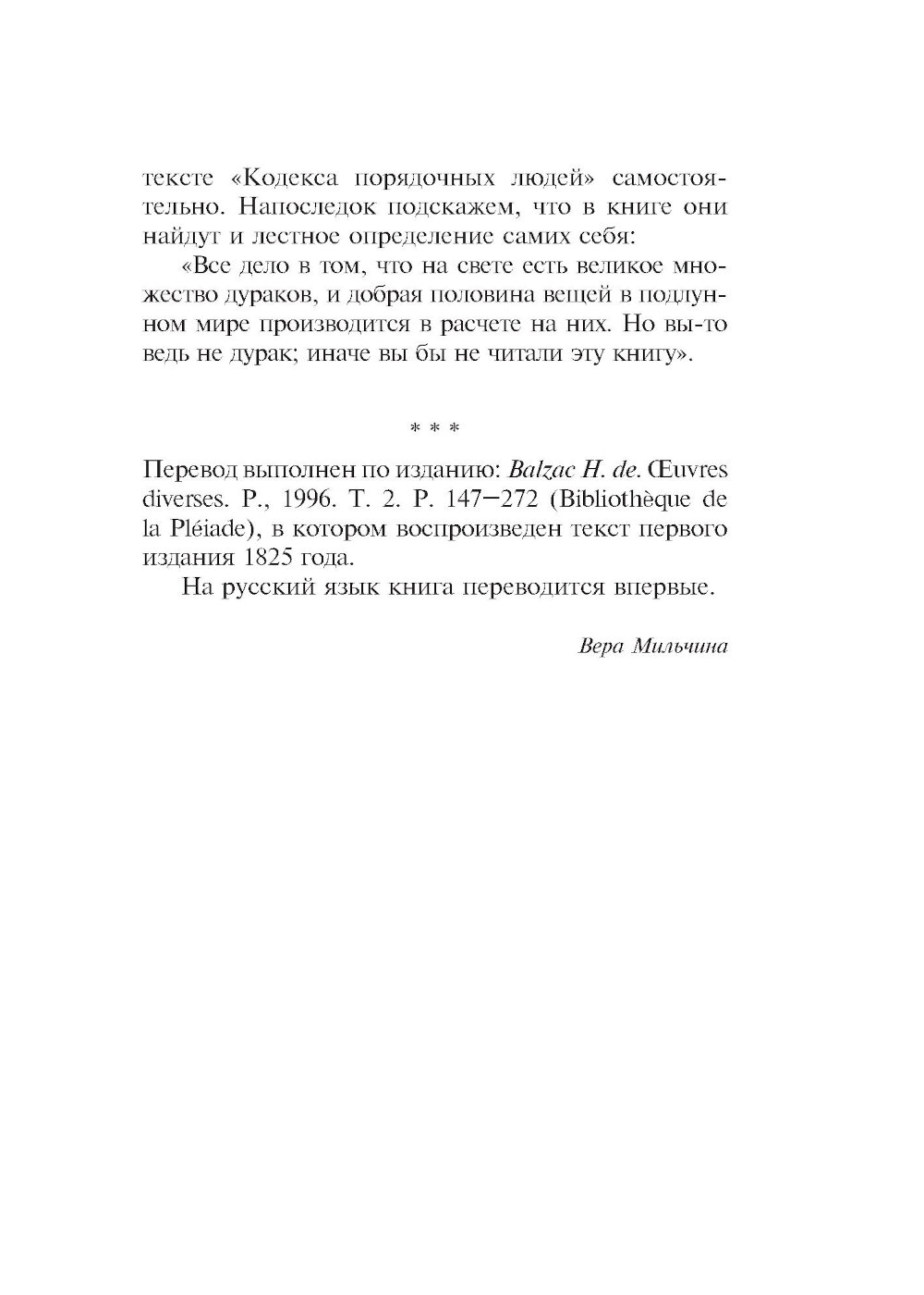 Переиздание знаменитого иронического трактата о том, как не попасться на удочку мошенникам. Великого романиста Оноре де Бальзака (1799-1850) называют еще и первым французским социологом, его «Кодекс порядочных людей...» - умные и смешные картинки нравов, написанные с блеском и остроумием. Многие из рекомендаций, которые автор дает читателям, жившим два века назад, остаются в силе и поныне, поскольку мы и сегодня так же доверчивы, а мошенники по-прежнему изворотливы и изобретательны. Прежде чем начать выставлять на титульном листе свое имя, Оноре де Бальзак (1799-1850) опубликовал немало сочинений под псевдонимами или вовсе без подписи. Последующие произведения автора «Человеческой комедии» заслонили его раннюю прозу, а между тем многие особенности позднейшей манеры писателя присутствуют уже в этих сочинениях. Таков «Кодекс порядочных людей» (1825). «Все дело в том, что на свете есть великое множество дураков, и добрая половина вещей в подлунном мире производится в расчете на них. Но вы-то ведь не дурак; иначе вы бы не читали эту книгу...» «...Кто такой порядочный человек, которому мы адресуем наше сочинение? Он еще молод, любит удовольствия, богат и умеет с легкостью зарабатывать деньги законным путем, неукоснительно честен во всем, чем бы он ни занимался, весел и остроумен, открыт и прям, благороден и великодушен. Именно к нему мы обращаемся, ибо желаем сохранить в его кошельке все те деньги, которые умельцы могут хитростью выманить у него так ловко, что он даже не заметит...» «...Берите пример с кошки: держитесь ласково и нежно, но будьте готовы в любую минуту улизнуть и помните, что порядочным людям далеко не всегда удается приземлиться на четыре лапы...» (Бальзак «Кодекс порядочных людей...») На русский язык книга впервые переведена Верой Мильчиной, а также дополнена вступительной статьей и примечаниями.| Издательство | Текст |