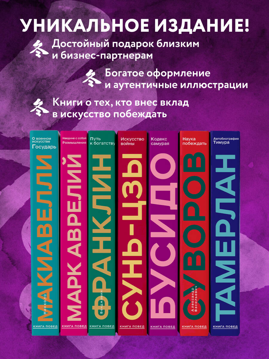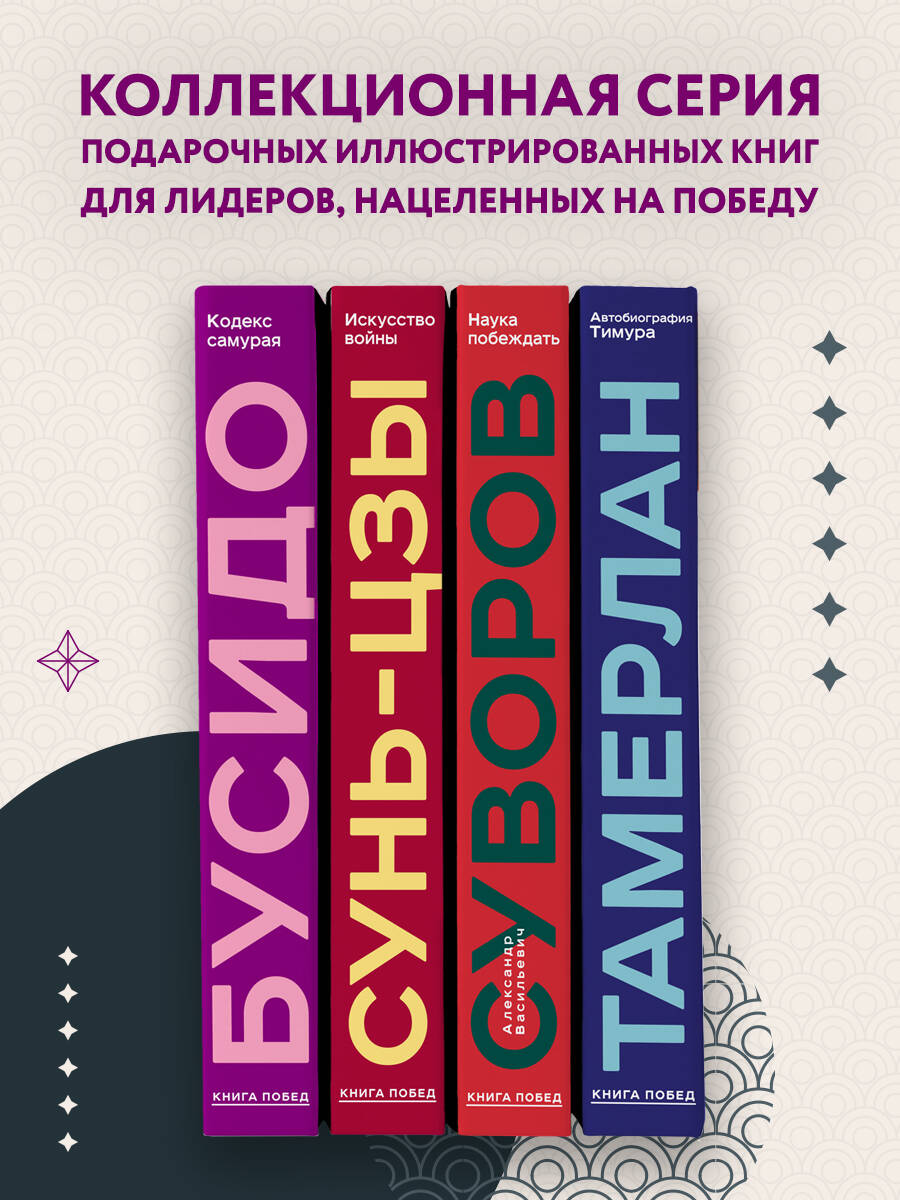 Это уникальное издание по праву можно назвать сокровищницей литературы о самурайской культуре. Книги, собранные под одной обложкой, в полной мере отражают величайшую самобытность этой традиции, поскольку представляют собой рассказы из первых уст - от самих японских мастеров меча. Каков нравственный облик идеального воина, как жили, служили и сражались самураи, о чем размышляли и каким мечтам предавались в редкие часы покоя - ответы на эти и другие вопросы дают они сами в книге «Кодекс самурая. Хагакурэ Бусидо. Книга Пяти Колец». О серии «Книга побед» - коллекционная серия подарочных иллюстрированных книг, объединившая фигуры легендарных исторических личностей, которые внесли каждый свой вклад в искусство побеждать. Издания, вошедшие в серию, посвящены не только премудростям военной науки, тактике, стратегии, но и воспитанию духа, воли и качеств настоящего лидера, необходимых для победы. Собеседниками и учителями выступают легендарные полководцы, мыслители, государственные деятели. Каждая книга серии выполнена в уникальном дизайне с удлиненным форзацем, имитирующим печать на обрезе, и сопровождена большим количеством цветных и черно-белых иллюстраций, которые позволяют полнее проникнуться духом славной эпохи и лучше усвоить уроки великих. Серия в качественном полиграфическом исполнении станет настоящим украшением домашней и деловой библиотеки истинных книголюбов и собирателей редких книг, достойным подарком близким и бизнес-партнерам, а также ценным источником для всех, кто интересуется военной историей и ее ключевыми фигурами, историей государственного управления, ролью личности в истории.| Издательство | ООО "Издательство "Эксмо" |