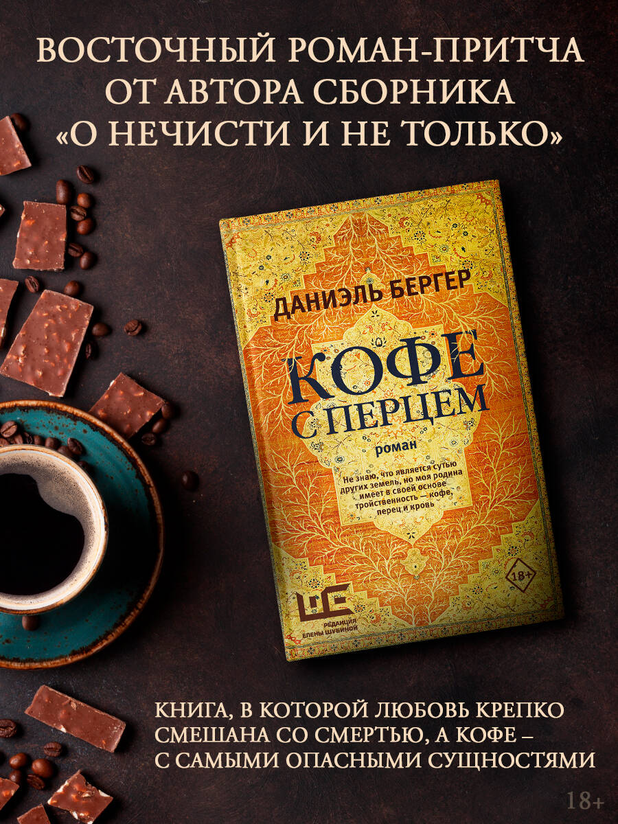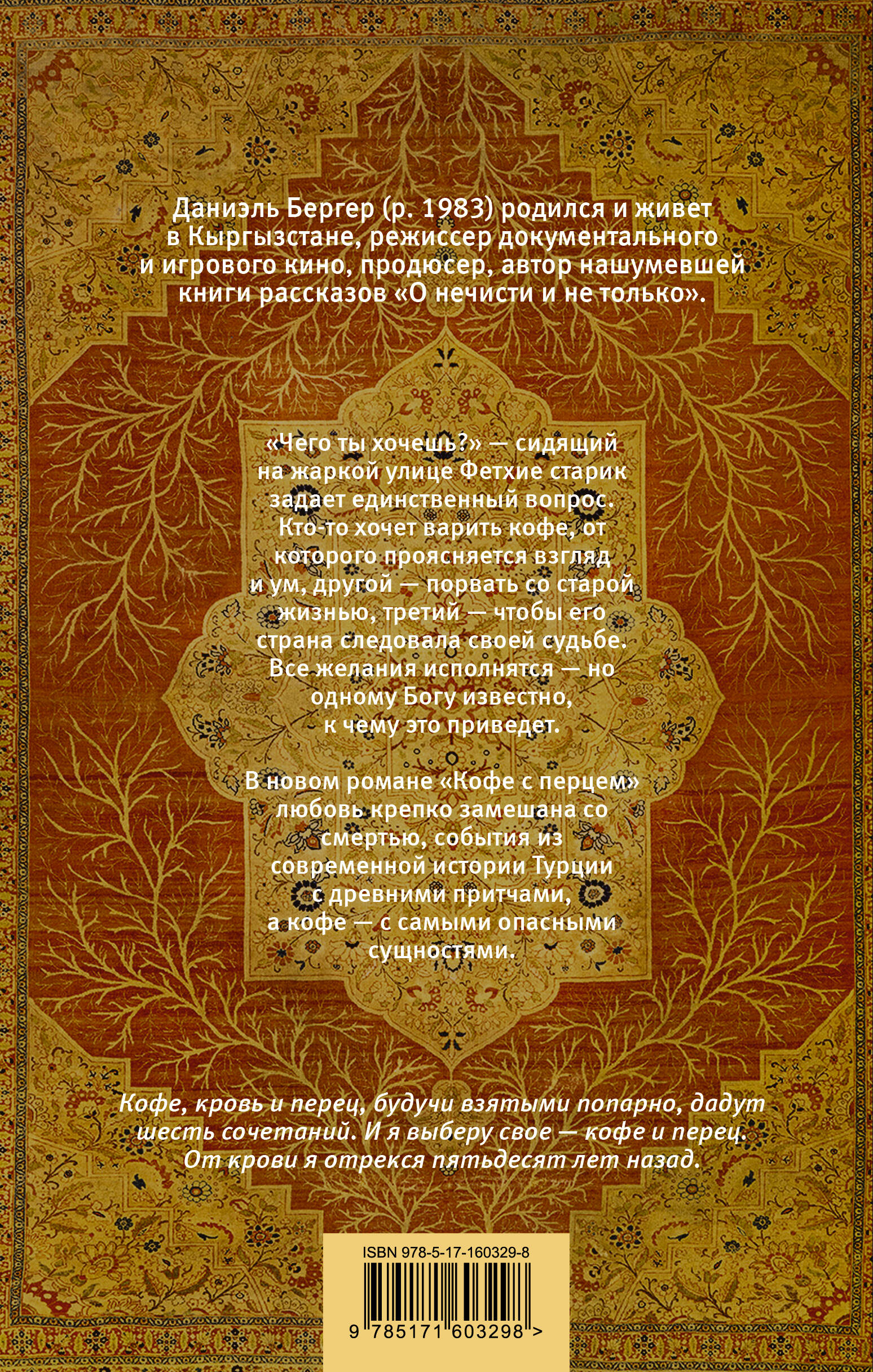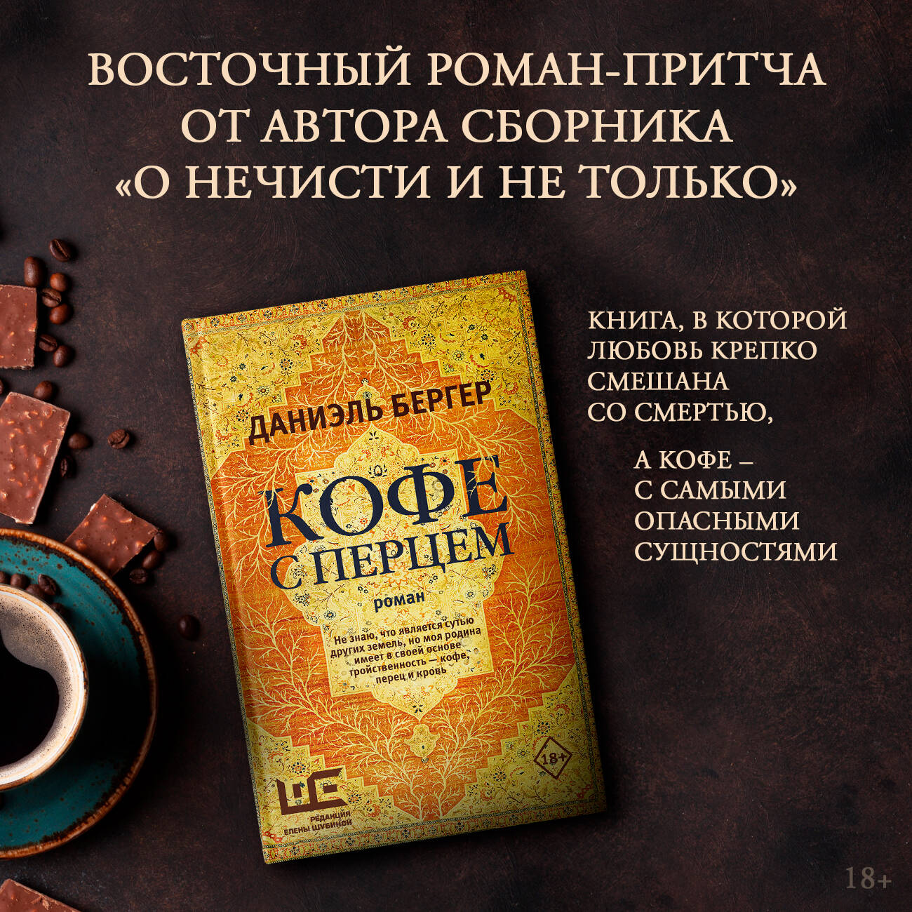 Даниэль Бергер (р. 1983) родился и живет в Кыргызстане, режиссер документального и игрового кино, продюсер, автор нашумевшей книги рассказов "О нечисти и не только". "Чего ты хочешь?" - сидящий на жаркой улице Фетхие старик задает единственный вопрос. Кто-то хочет варить кофе, от которого проясняется взгляд и ум, другой - порвать со старой жизнью, третий - чтобы его страна следовала своей судьбе. Все желания исполнятся - но одному Богу известно, к чему это приведет. В новом романе "Кофе с перцем" любовь крепко замешана со смертью, события из современной истории Турции с древними притчами, а кофе - с самыми опасными сущностями. "Кофе, кровь и перец, будучи взятыми попарно, дадут шесть сочетаний. И я выберу свое - кофе и перец. От крови я отрекся пятьдесят лет назад".